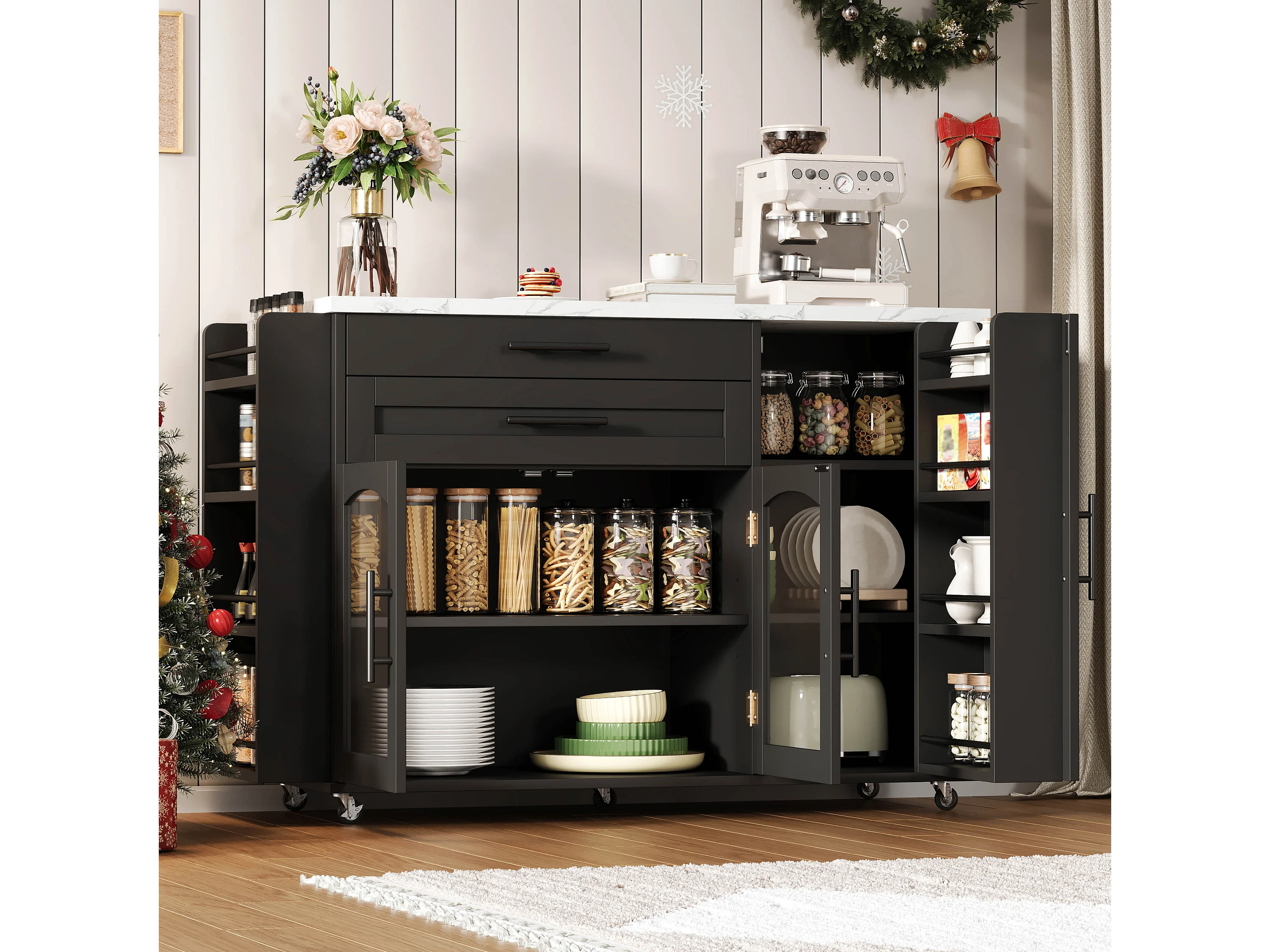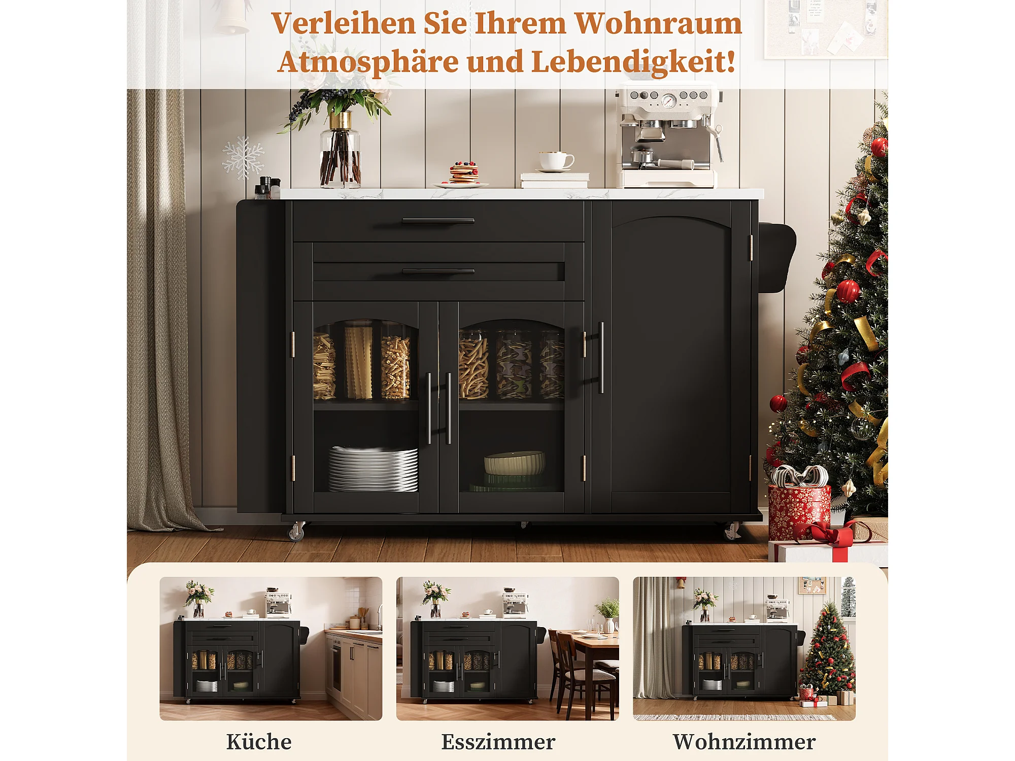 Îlot de cuisine mobile avec plan de travail pliable - 138 x 45 (70) x 90 cm - avec étagère + 2 tiroir + 3 portes - MDF - noir