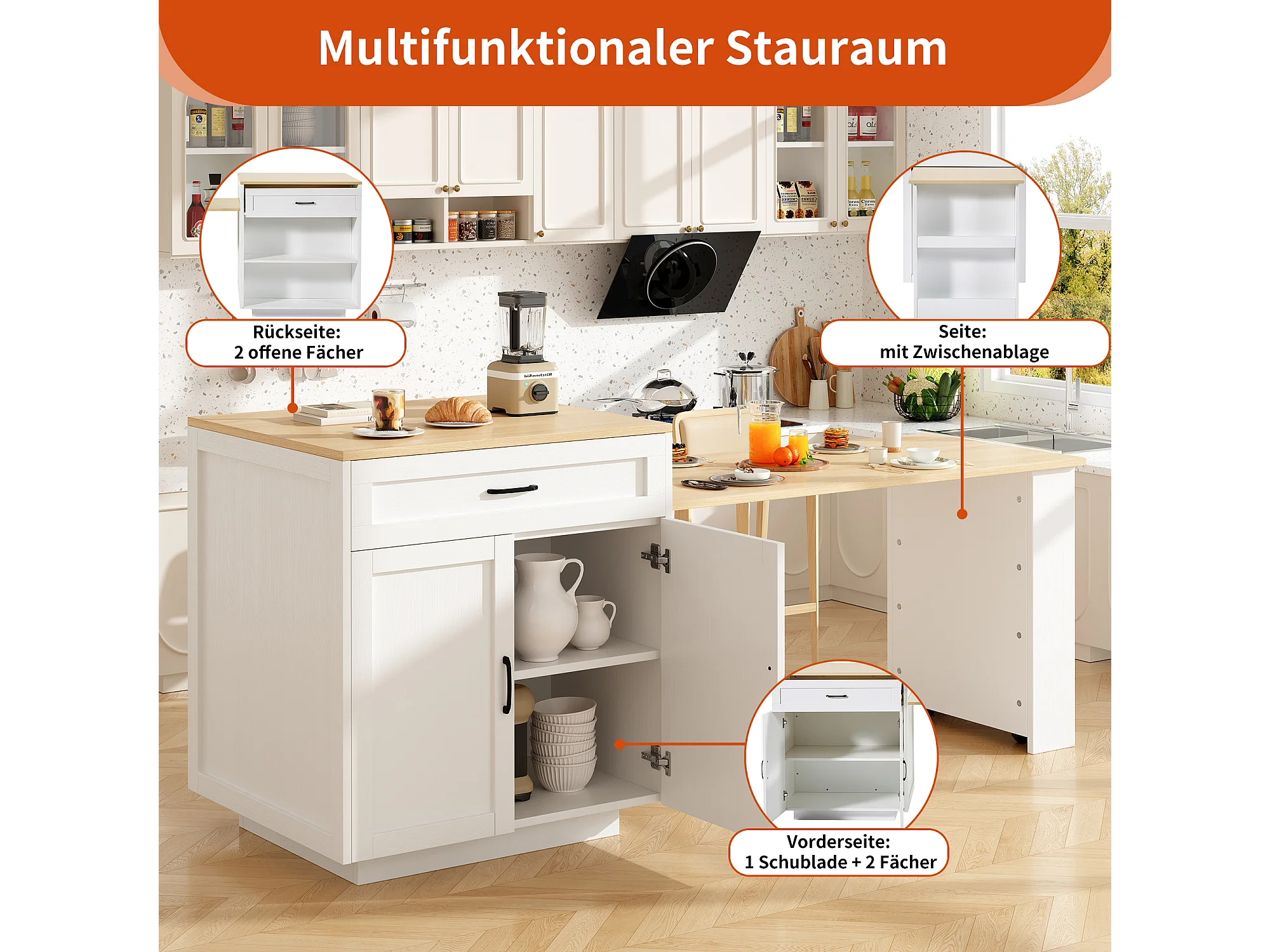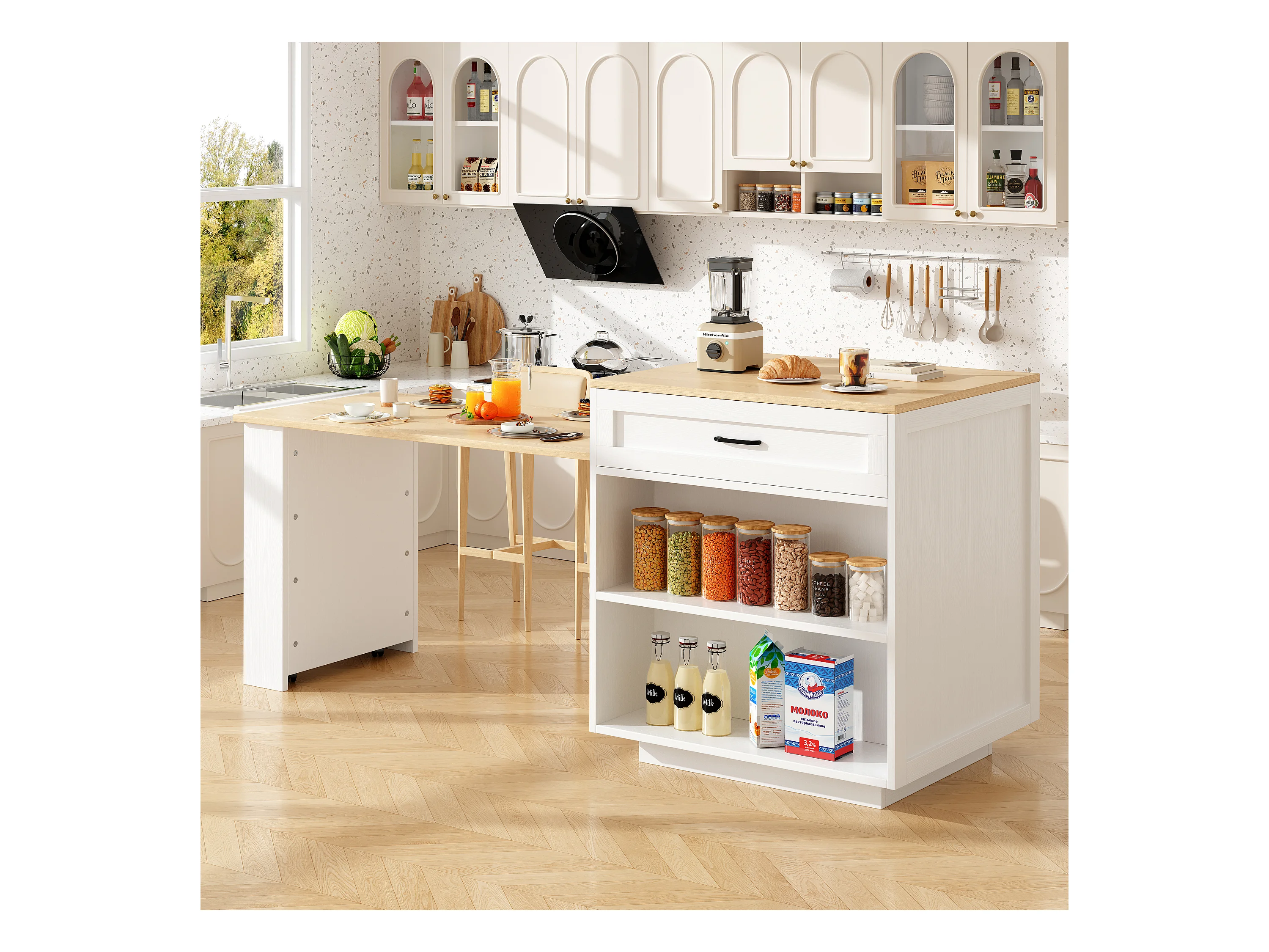Îlot de cuisine moderne - 133-202 x 70 x 93,5 cm - 2 tiroirs et 2 compartiments pour 2-6 personnes, MDF, Blanc