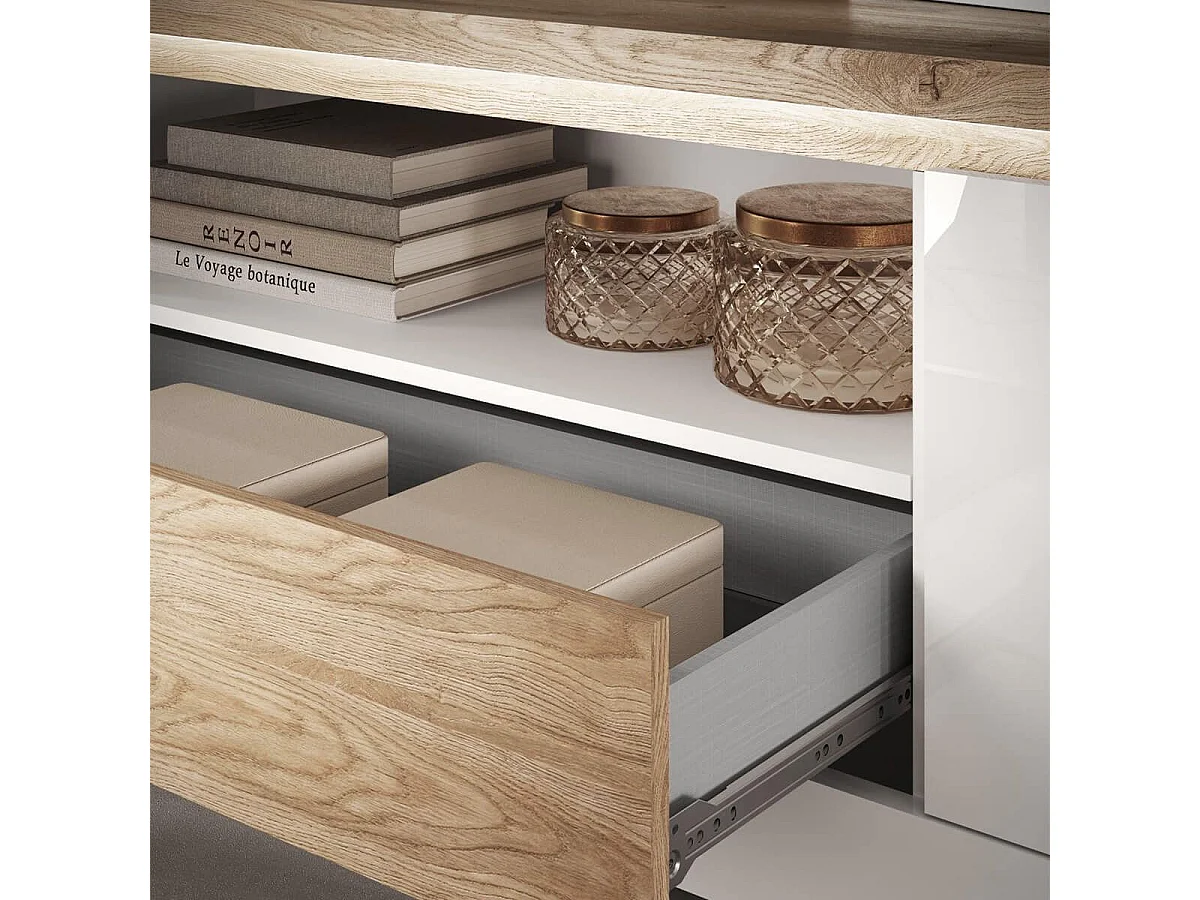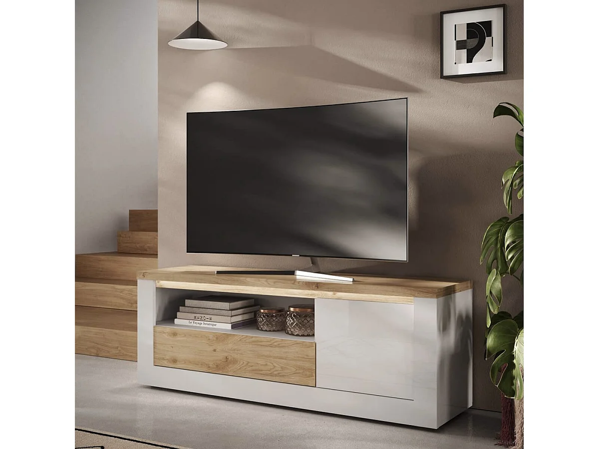 ISALIA - Meuble TV 1 portes blanc et aspect chêne finition Cadiz avec LED