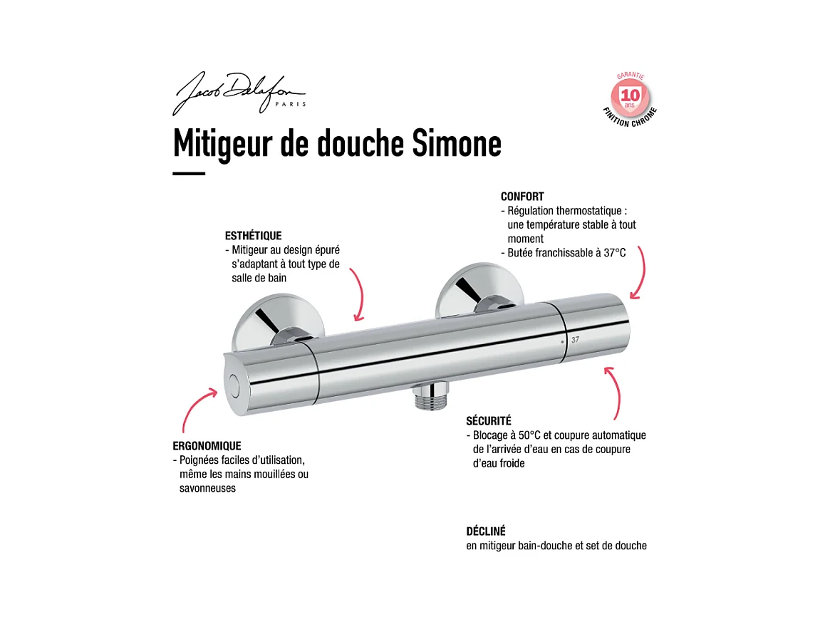 Mitigeur douche thermostatique JACOB DELAFON Simone chrome