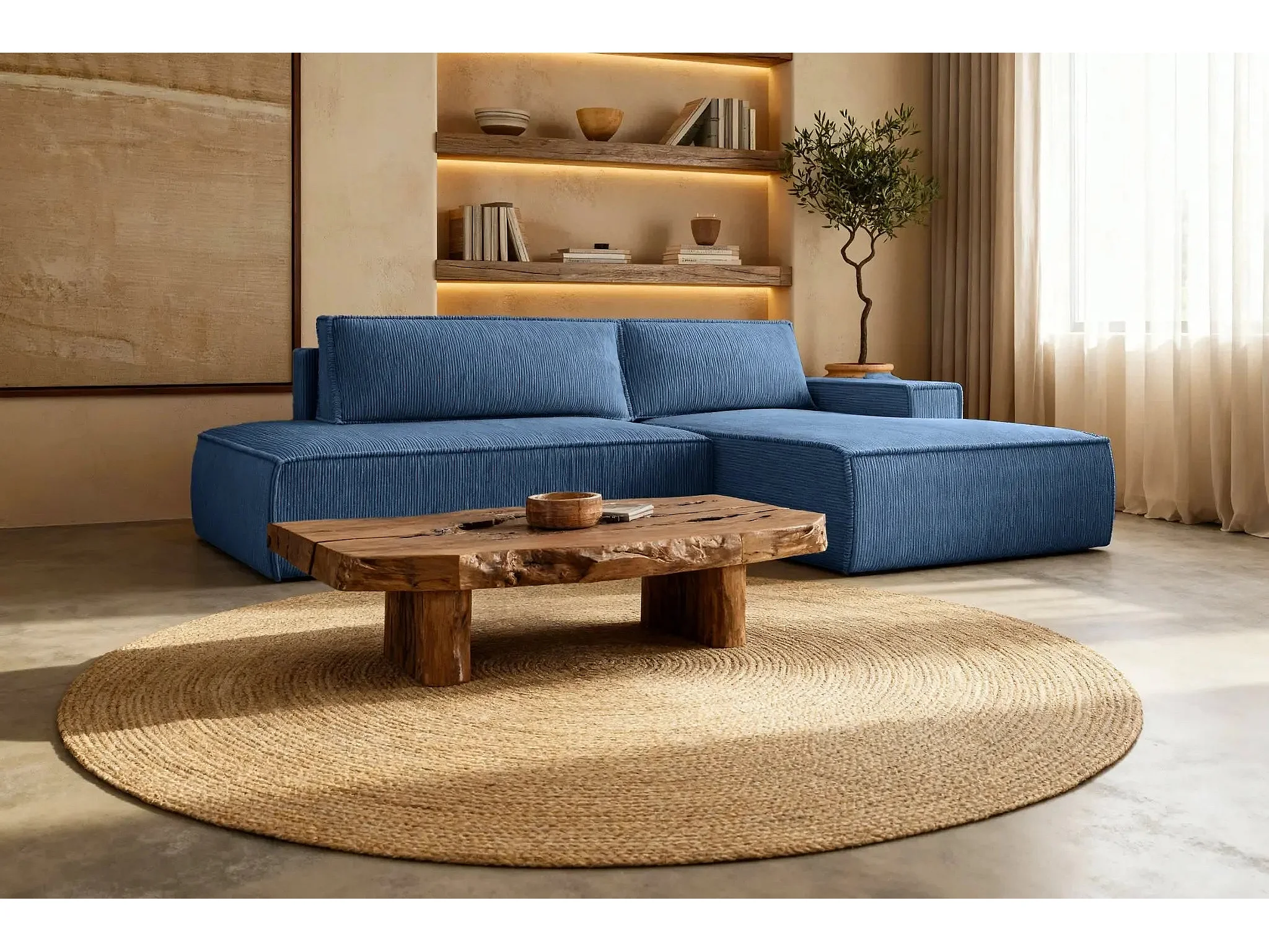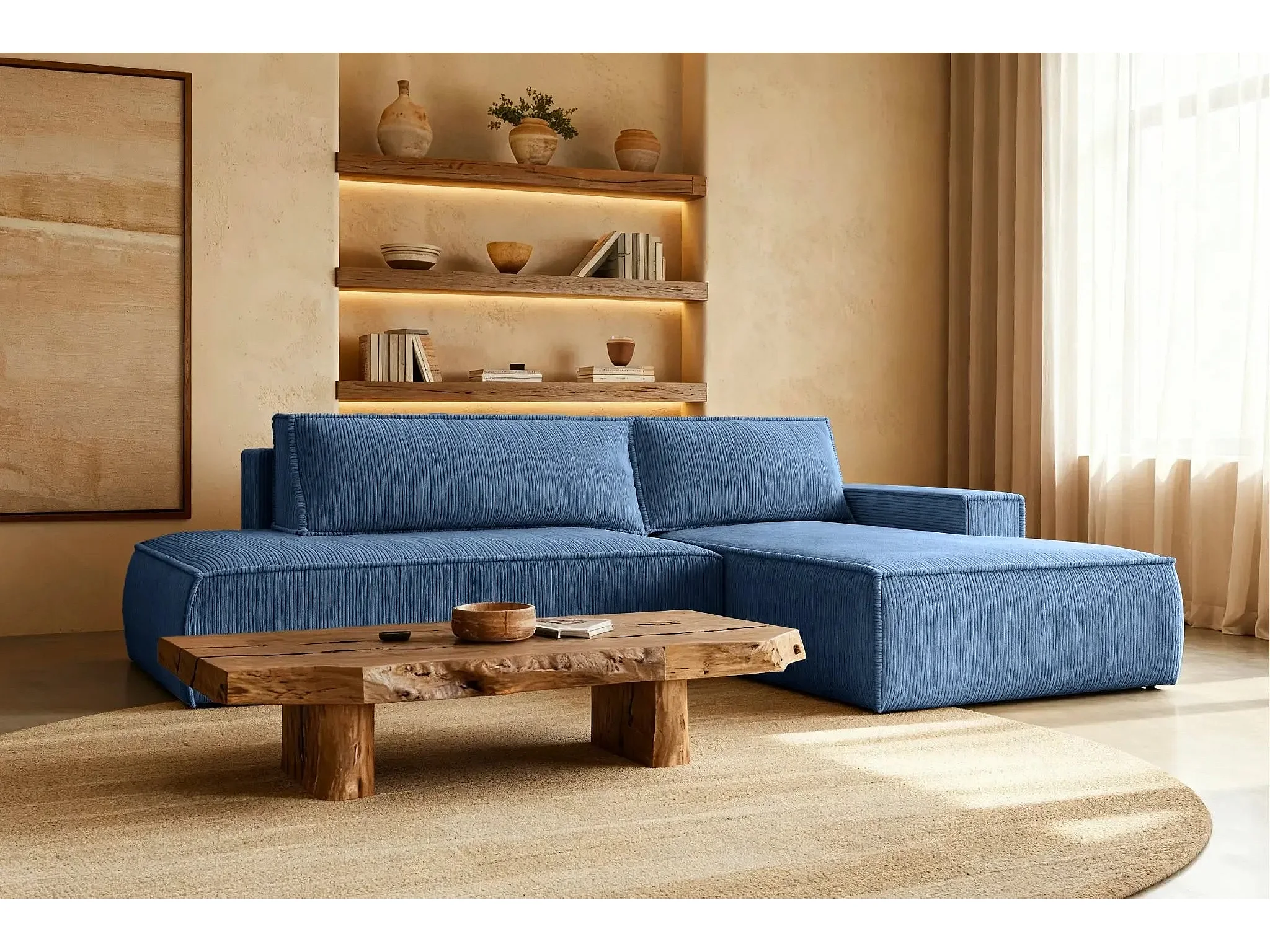 JADE - Canapé d'angle convertible velours côtelé - Bleu - Droit