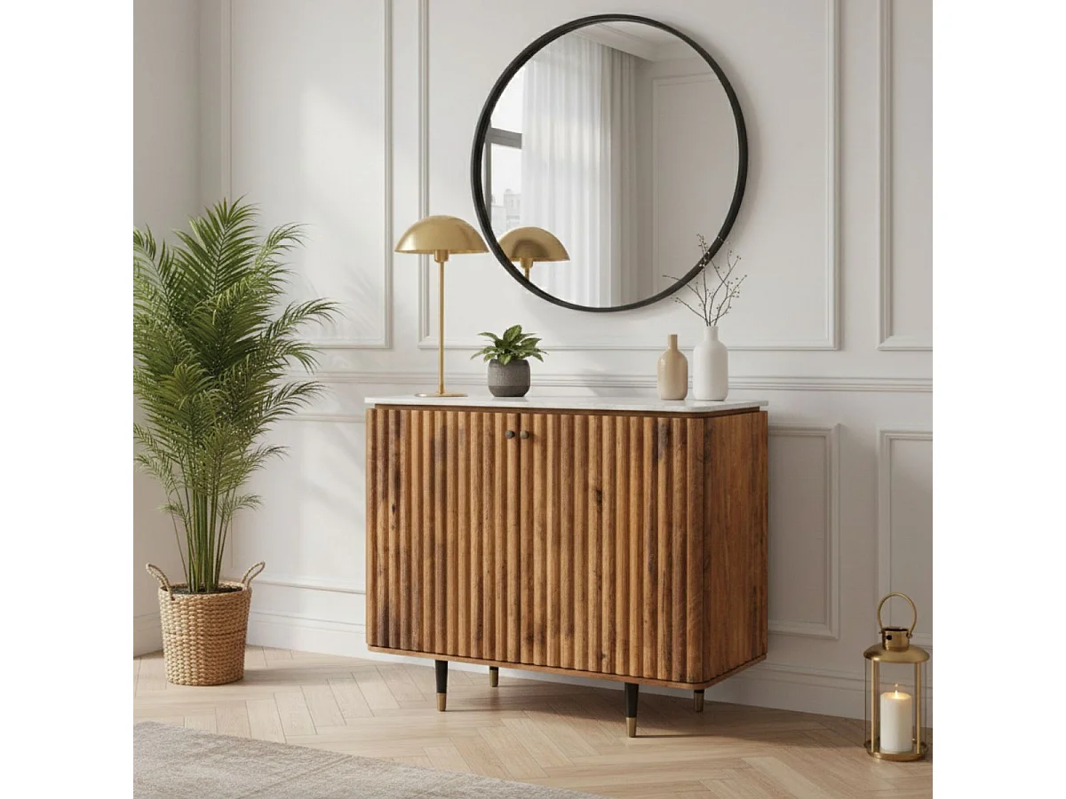 JAMARIS - Meuble de Rangement 2 Portes en Manguier Plateau Marbre Pieds Teinté Embout Doré