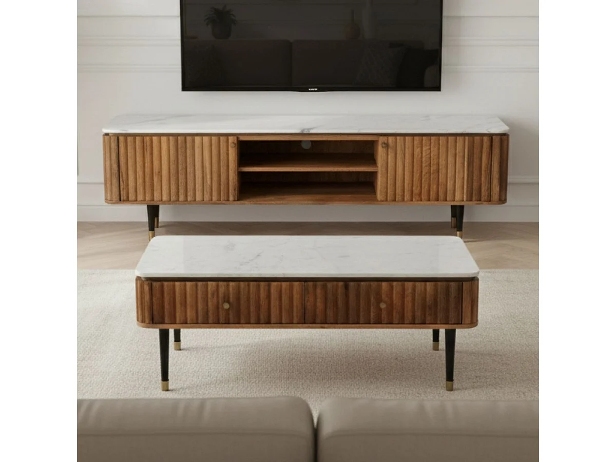 JAMARIS - Table Basse 4 Tiroirs en Manguier Plateau Marbre Pieds Teinté Embout Doré