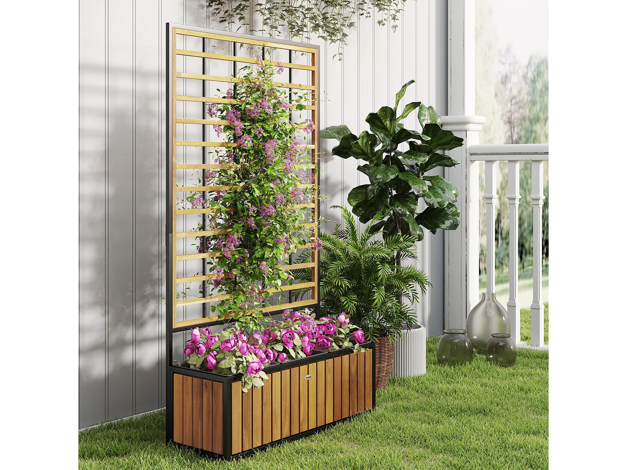 Jardinière avec treillis design tropical dim. 74 x 27 x 131 cm bicolore acier noir bois acacia verni
