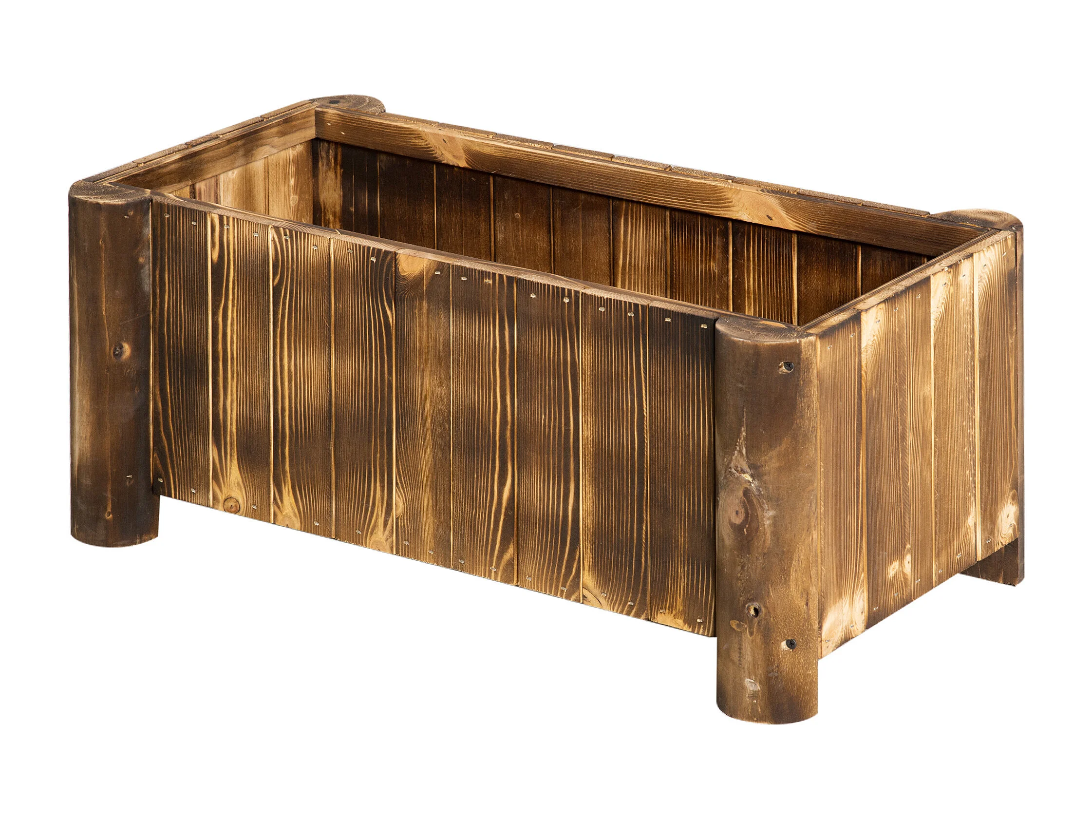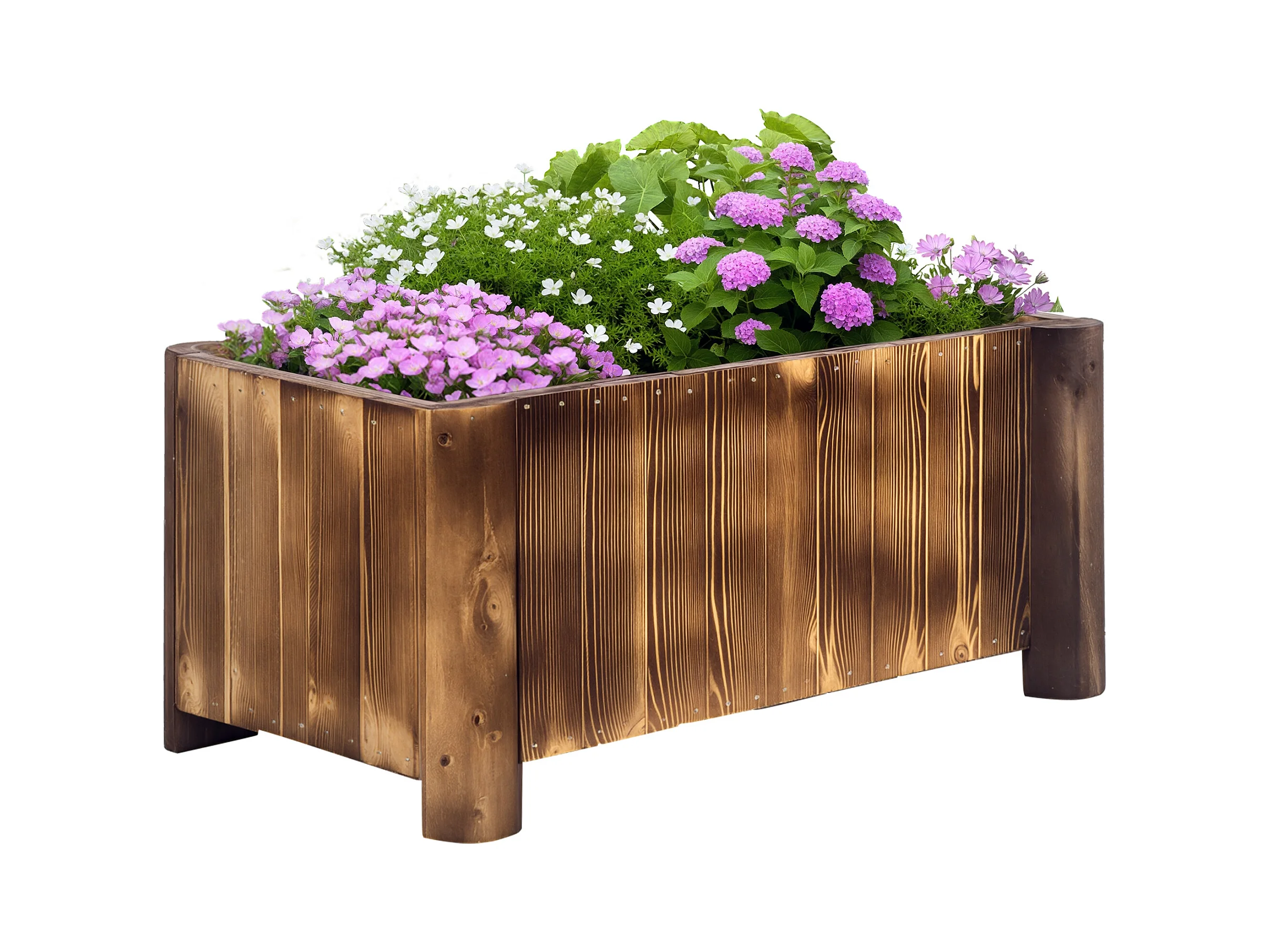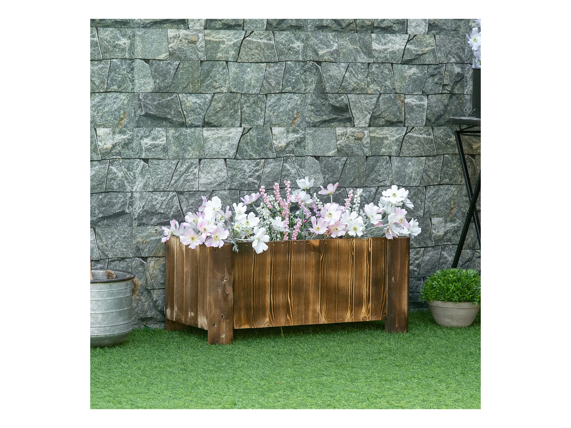 Jardinière sur pied bac à fleurs dim. 70L x 35l x 30H cm piètement demi rondin corps aspect lattes bois sapin traité carbonisation