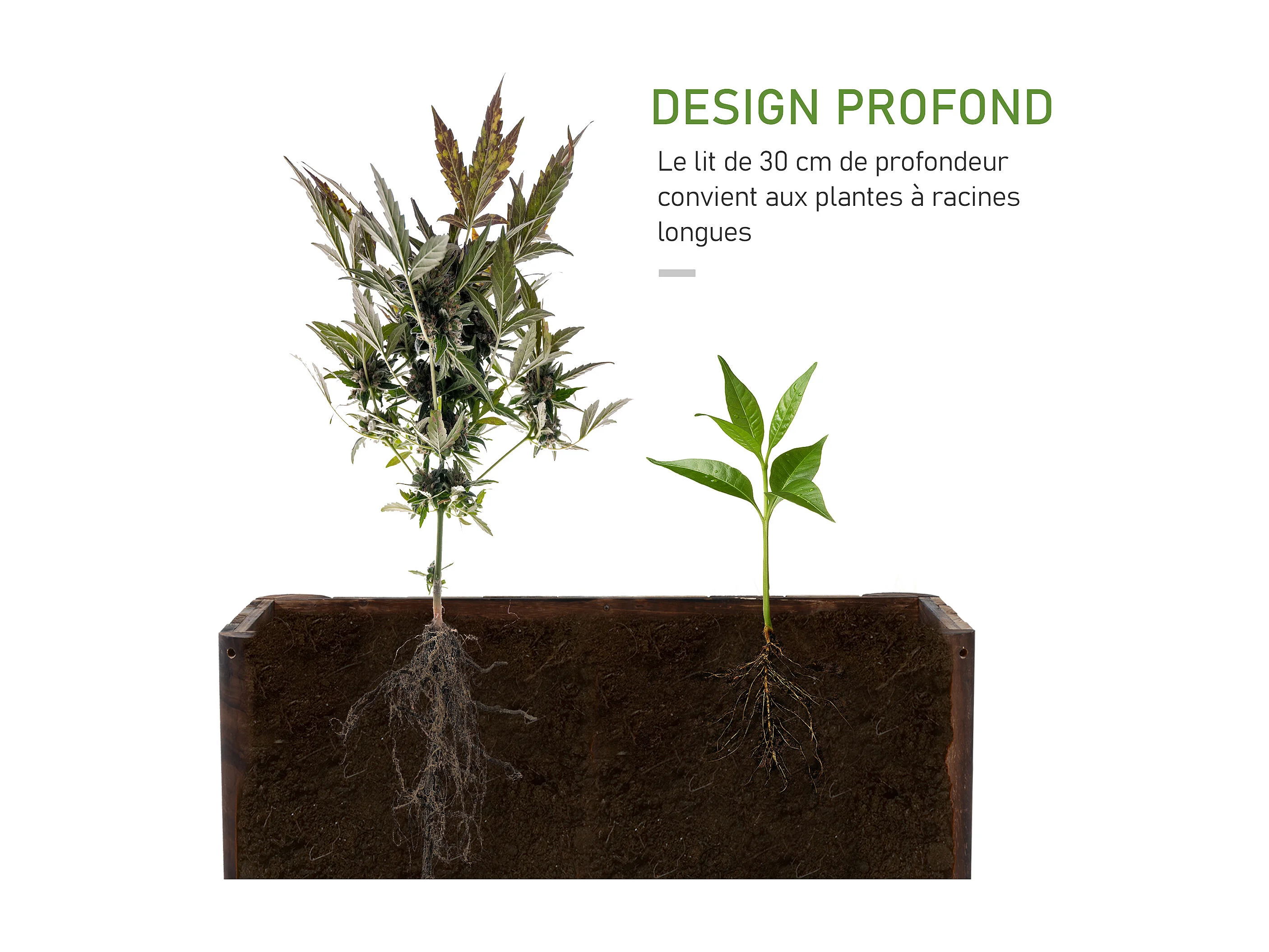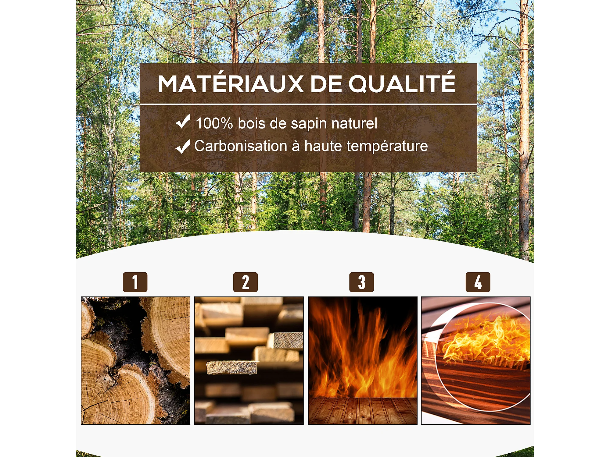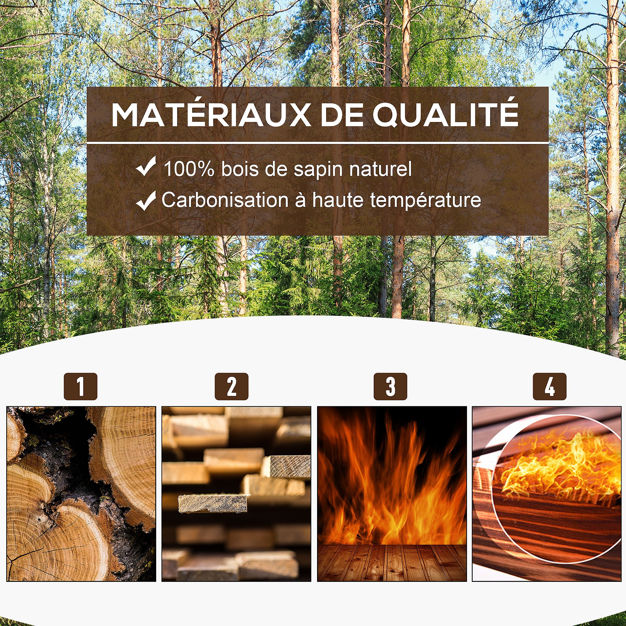 Jardinière sur pied bac à fleurs dim. 70L x 35l x 30H cm piètement demi rondin corps aspect lattes bois sapin traité carbonisation