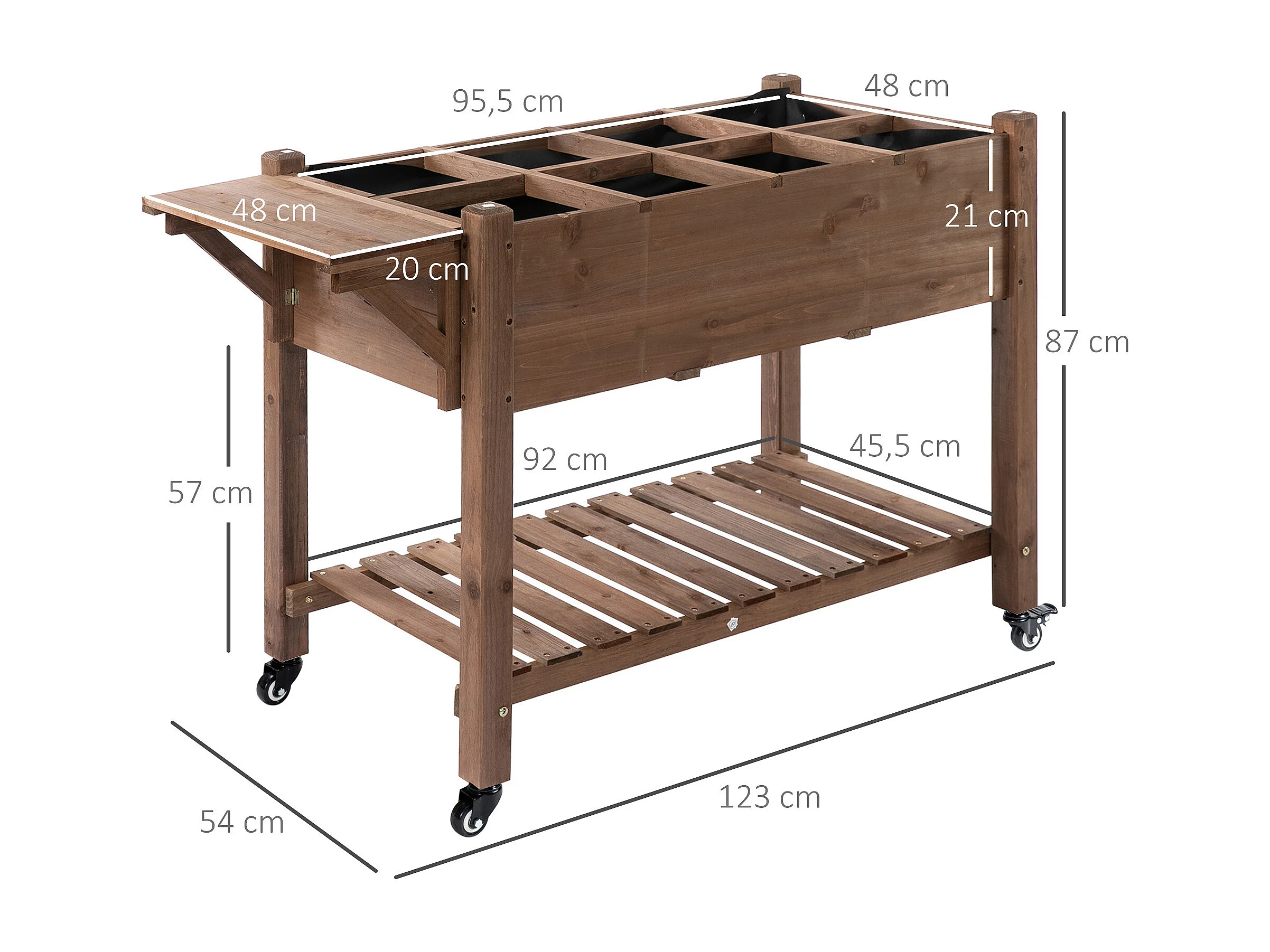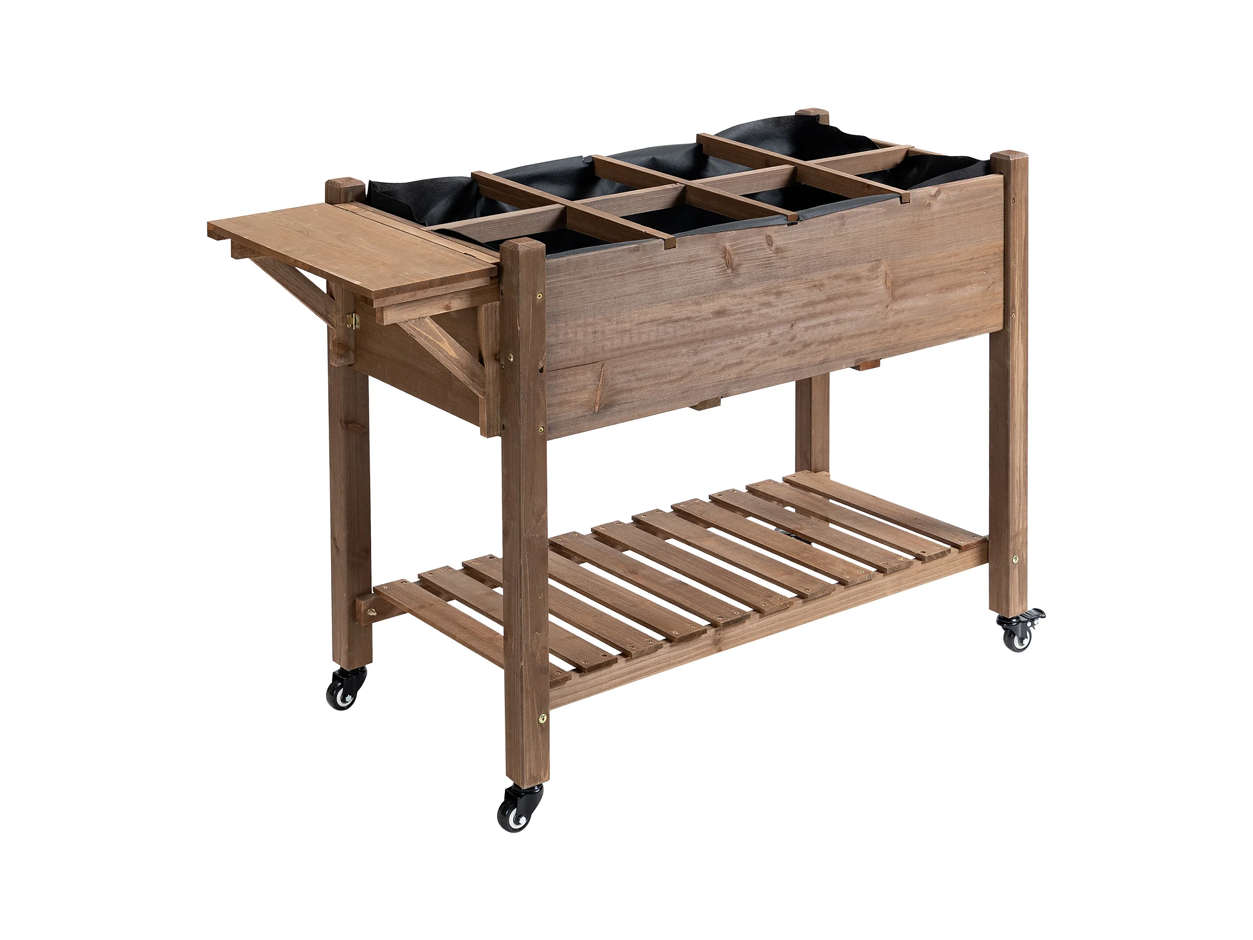 Jardinière sur pied - potager sur roulettes - étagère, tablette rabattable, inserts d'irrigation, feutre drainage - bois pré-huilé foncé