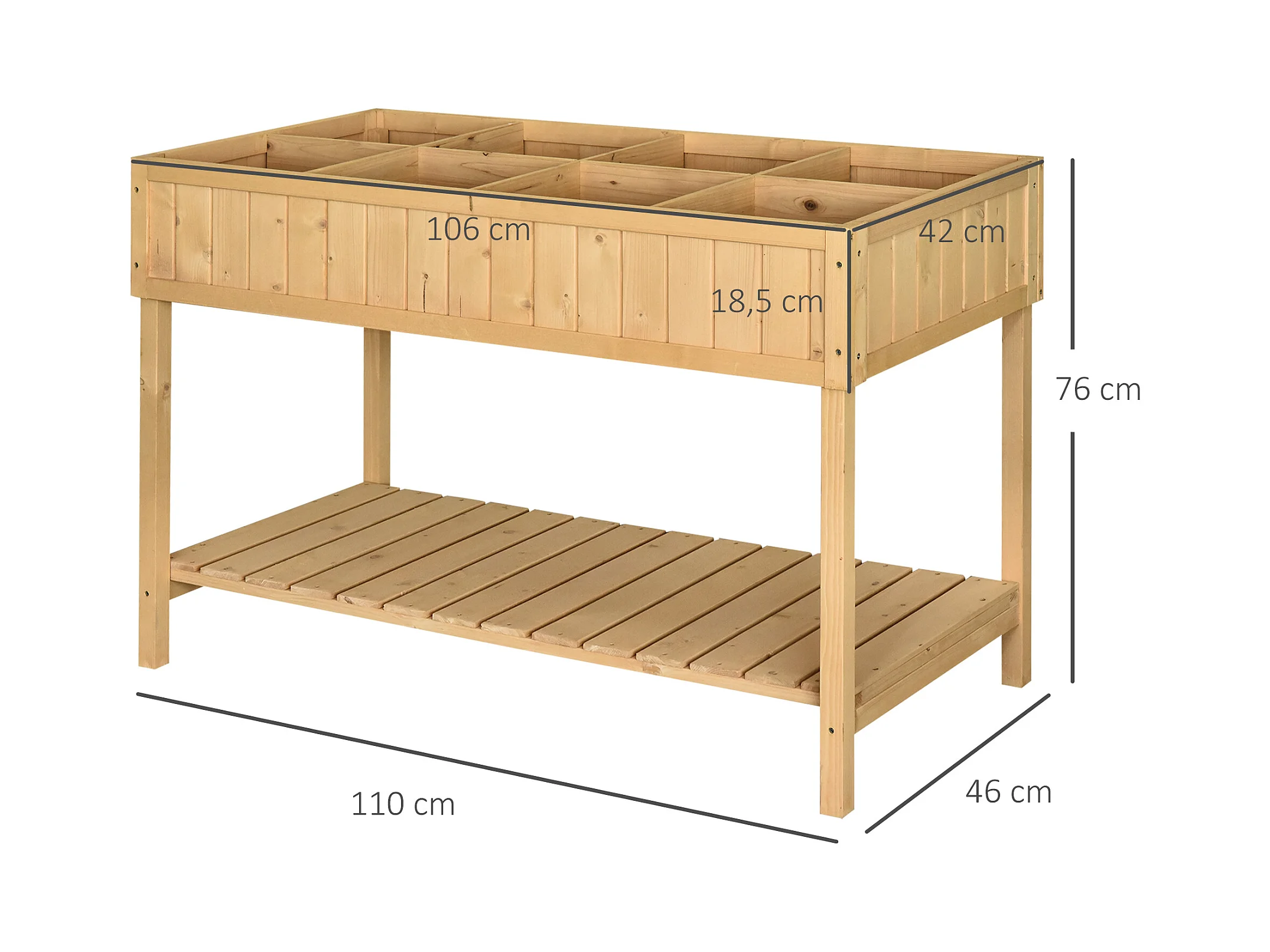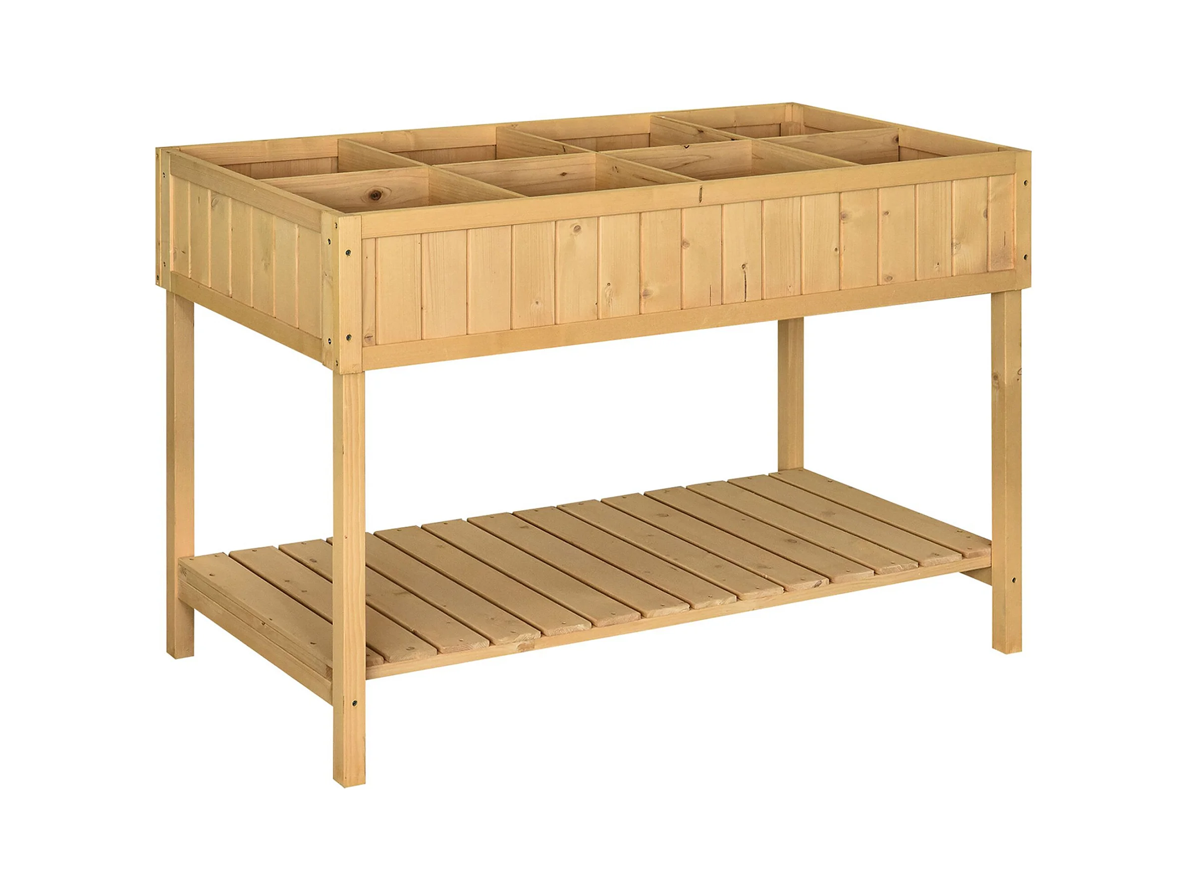 Jardinière sur pieds carré potager avec étagère dim. 110L x 46l x 76H cm 8 compartiments & inserts d'irrigation bois de sapin beige