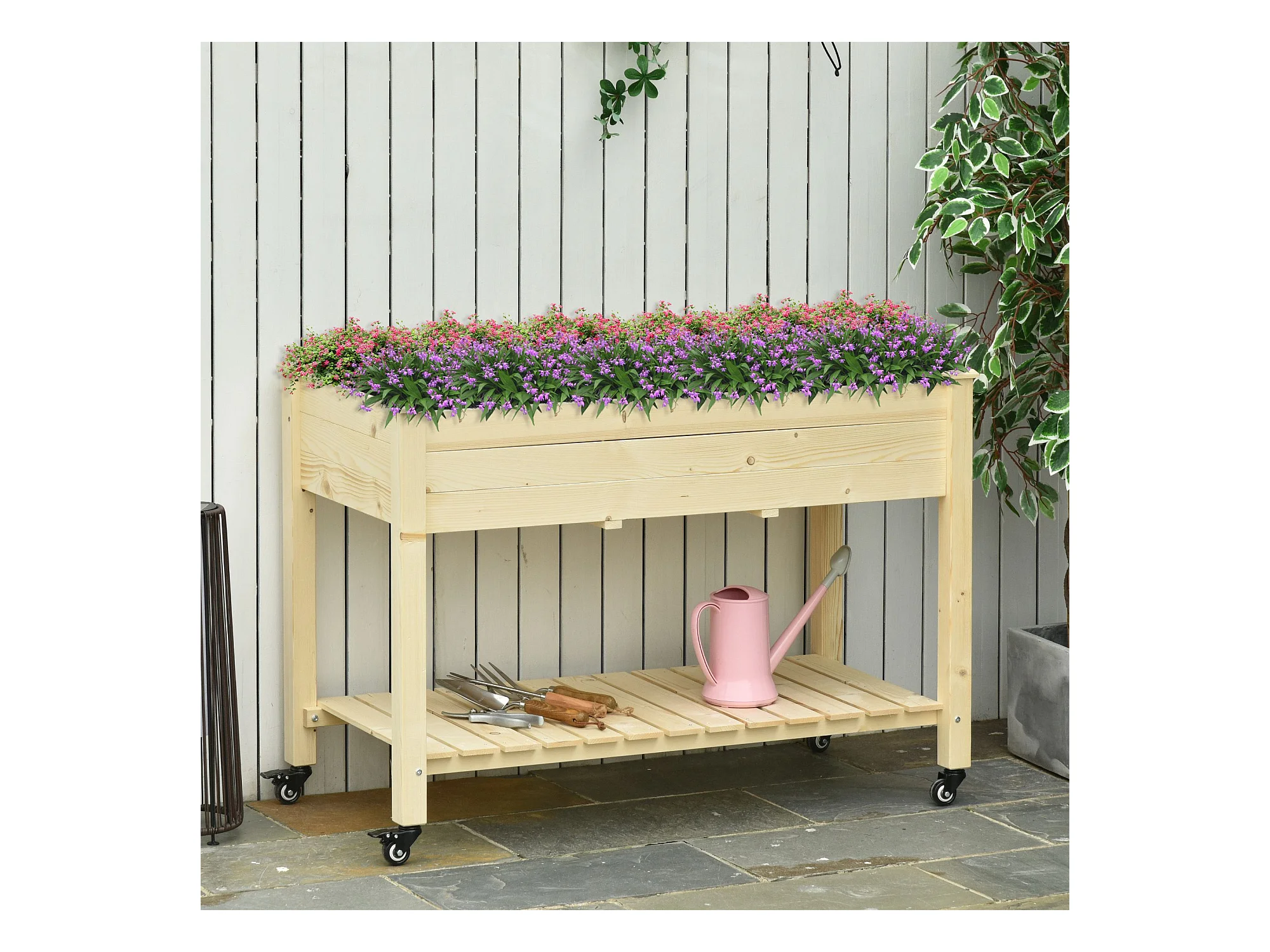 Jardinière sur pied - potager sur roulettes - étagère, tablette rabattable, inserts d'irrigation, feutre drainage - bois pré-huilé clair