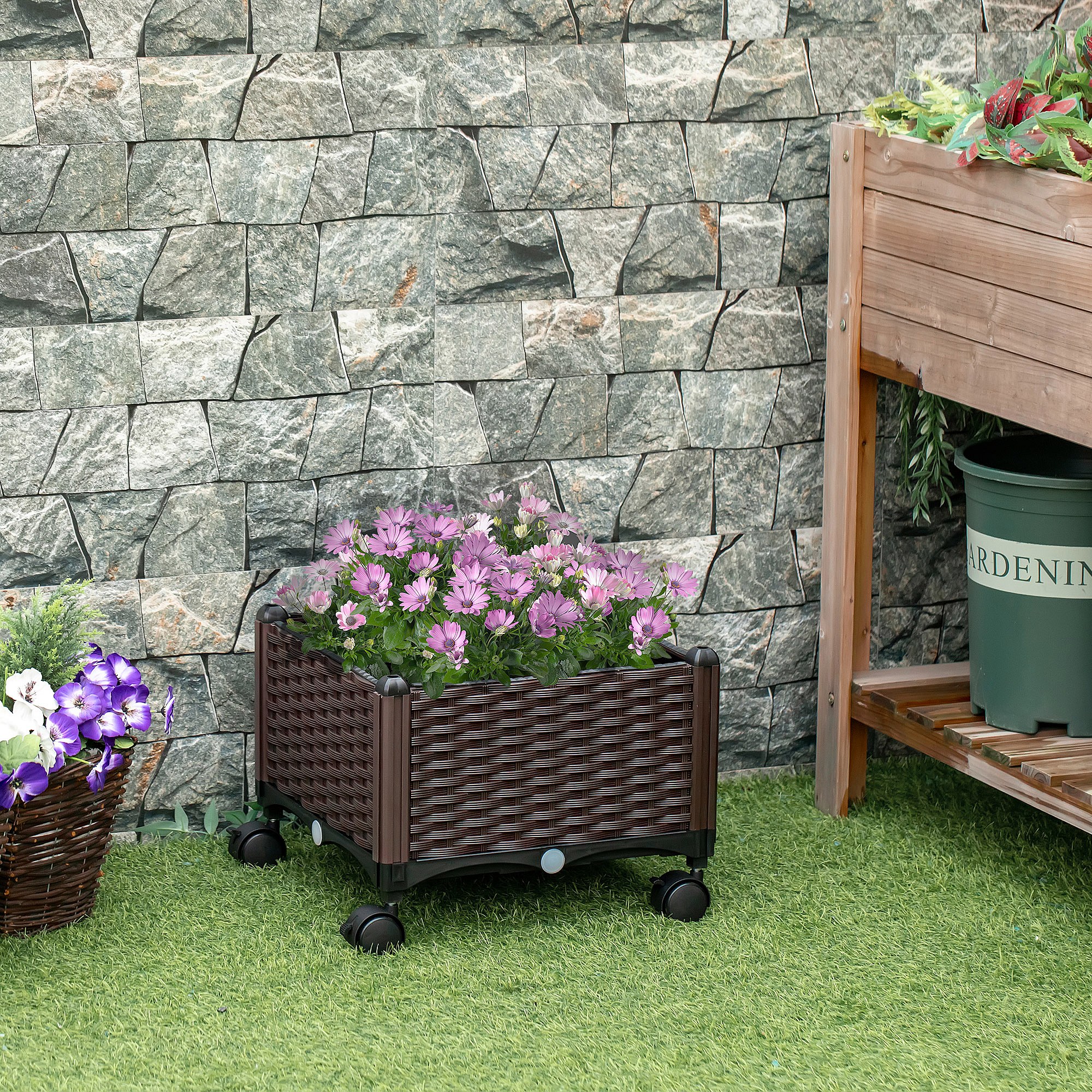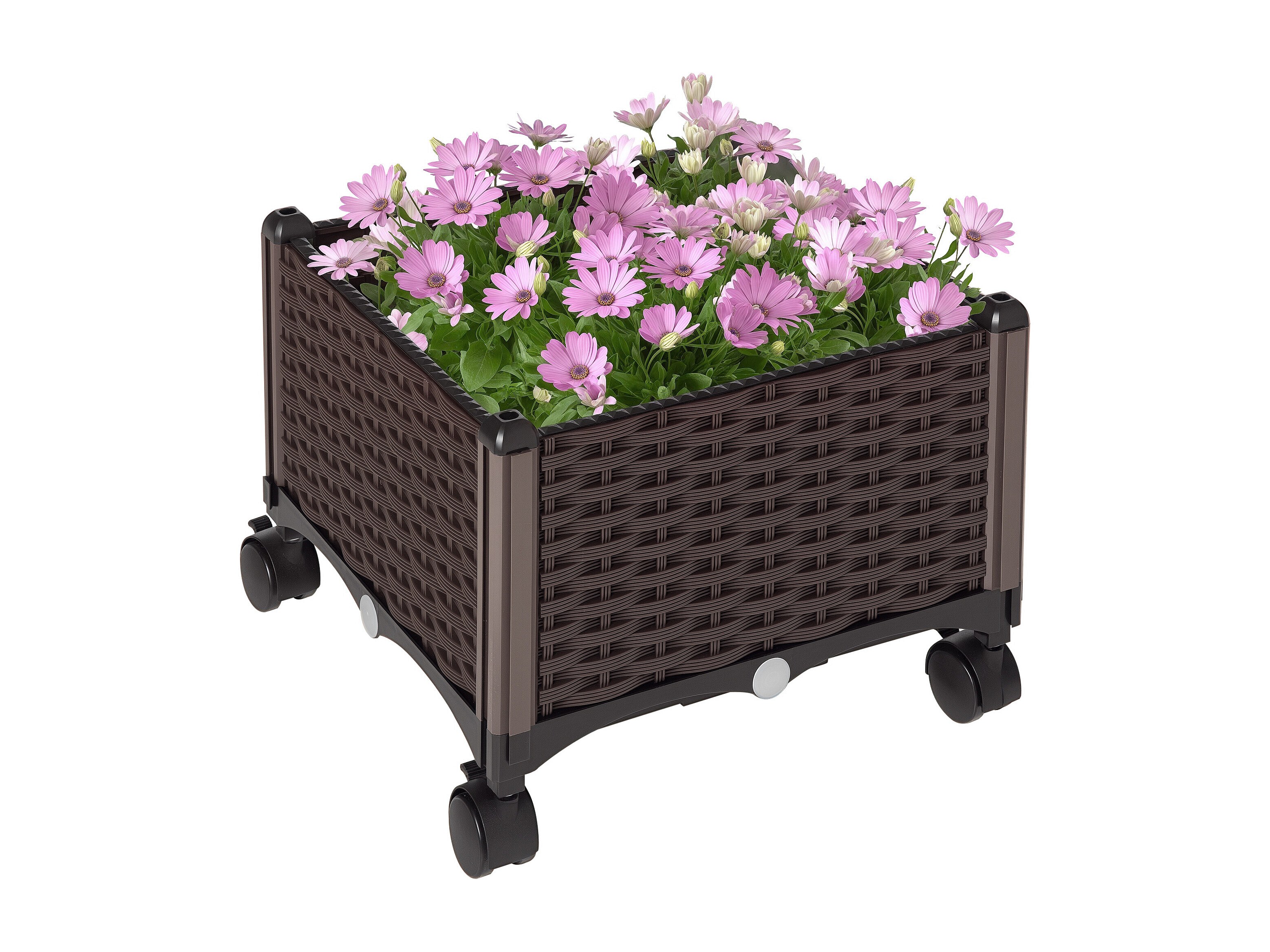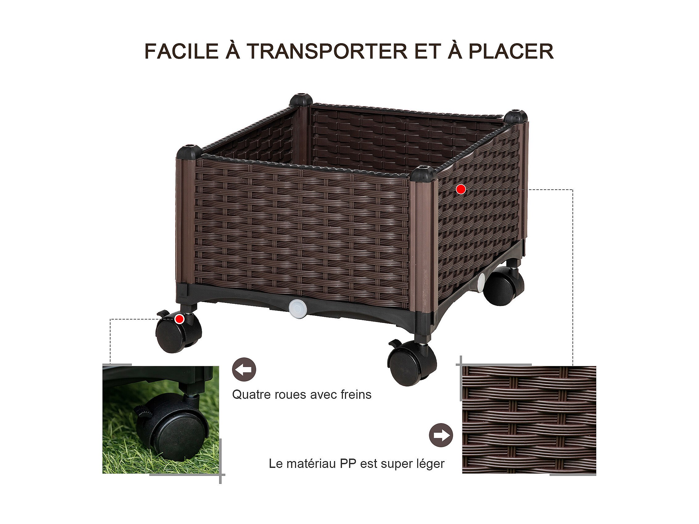 Jardinière sur roulettes dim. 40L x 40l x 31H cm insert d'irrigation plastique imitation rotin tressé chocolat