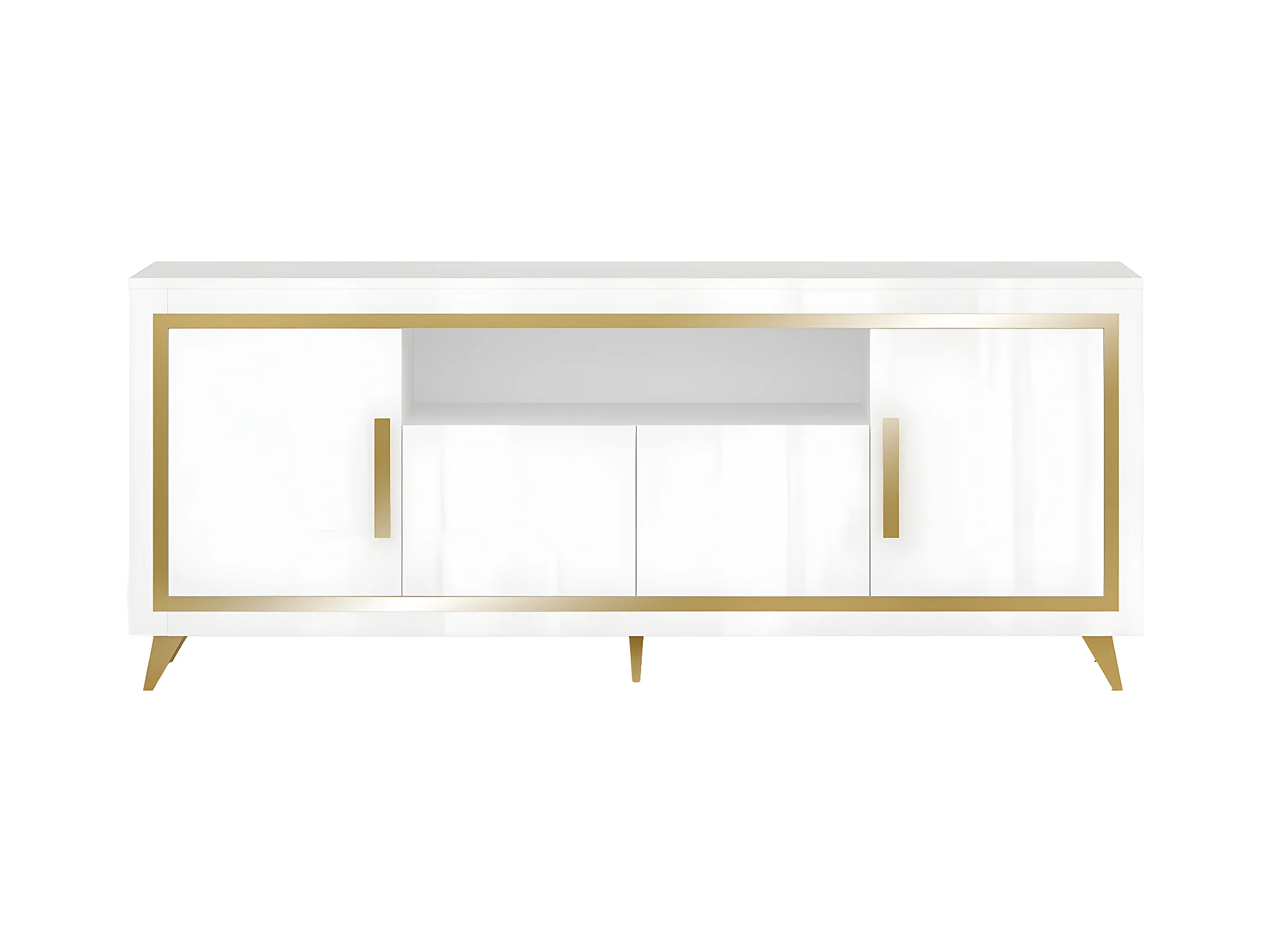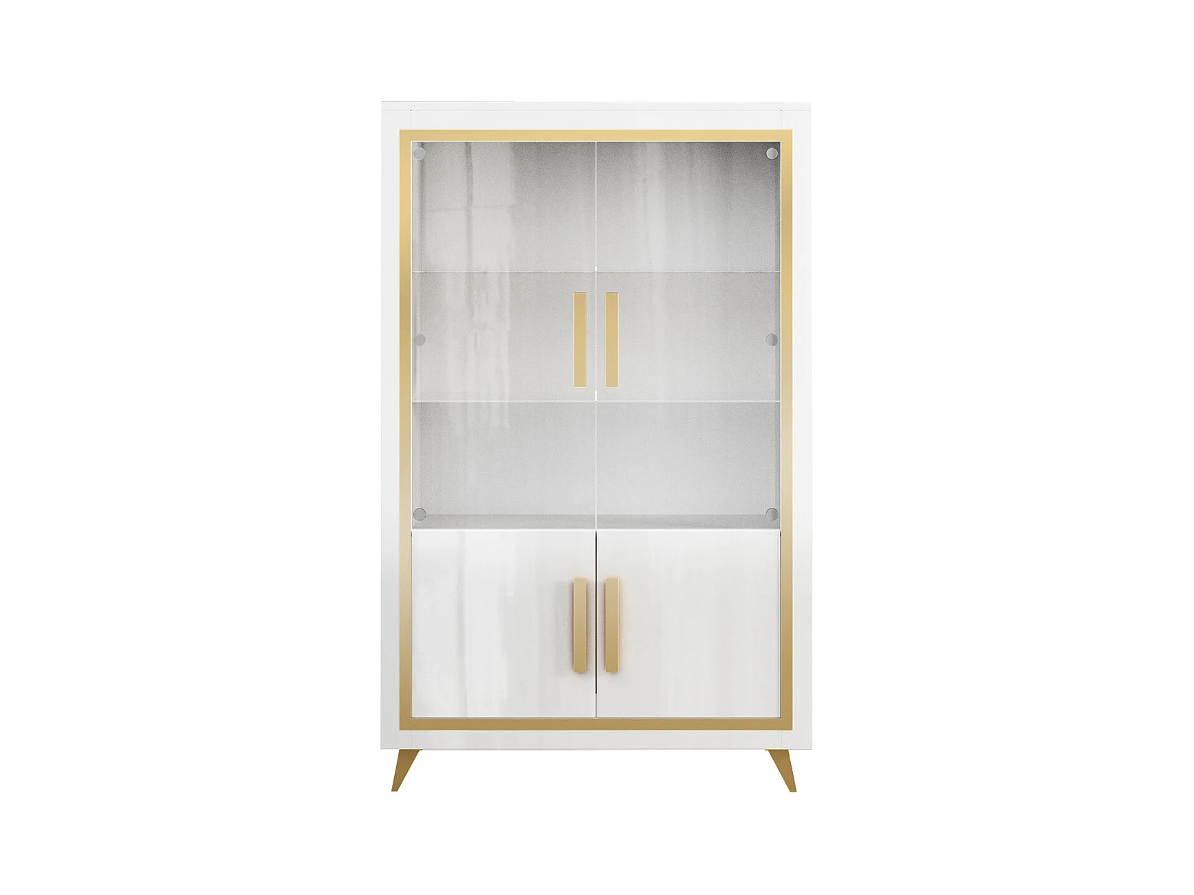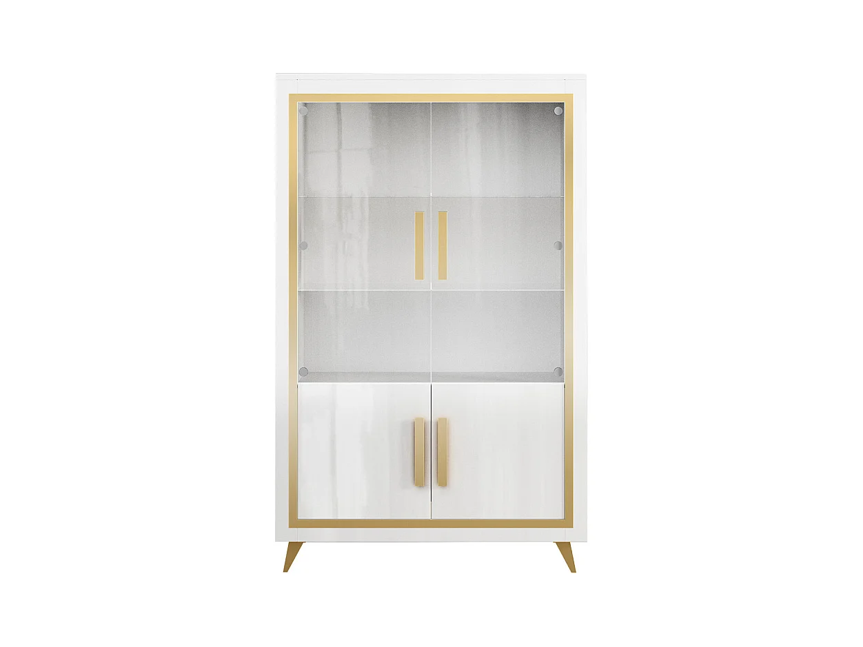 JEMMA - Ensemble Séjour Complet Blanc Décor Doré Table 160cm + Buffet et Vitrine avec Leds