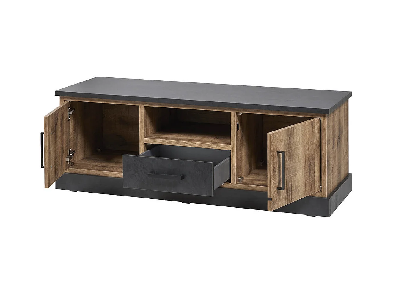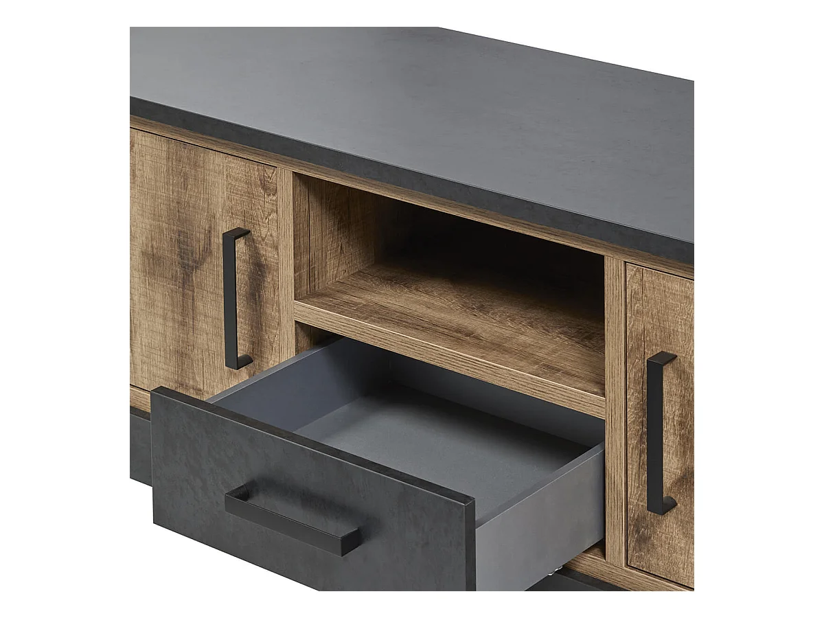 JENNA - Meuble TV 2 Portes Aspect Bois et Métal Poudré Noir
