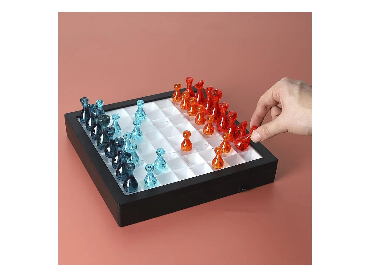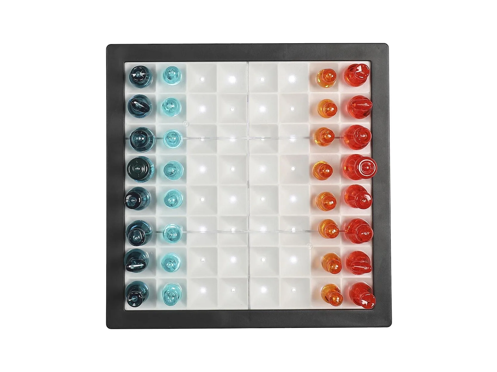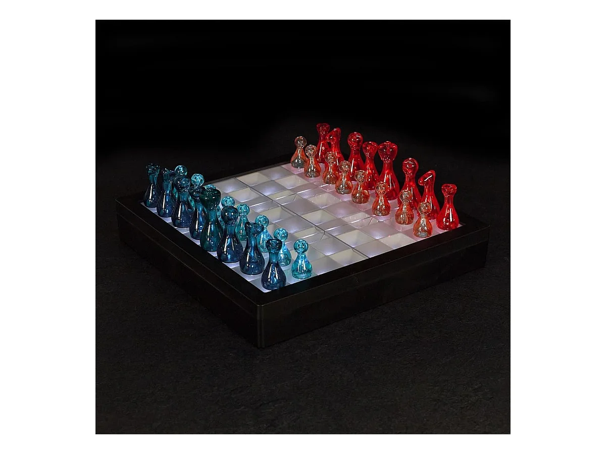 Jeu d'échec transparent avec pions rouges et bleus et éclairage LED