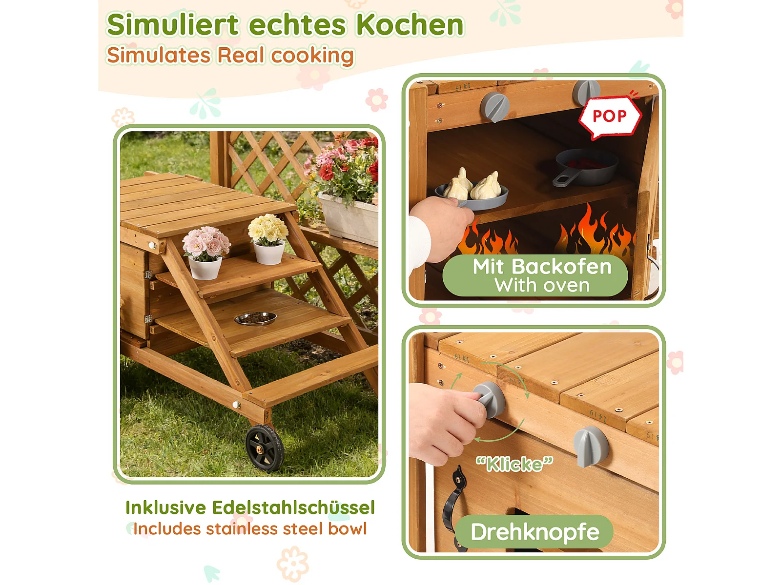 Jouets de cuisine d'extérieur pour enfants 132x59x60.5cm - chariot alimentaire en bois - Jouet d’Imitation pour 3 Ans+ (Naturel)
