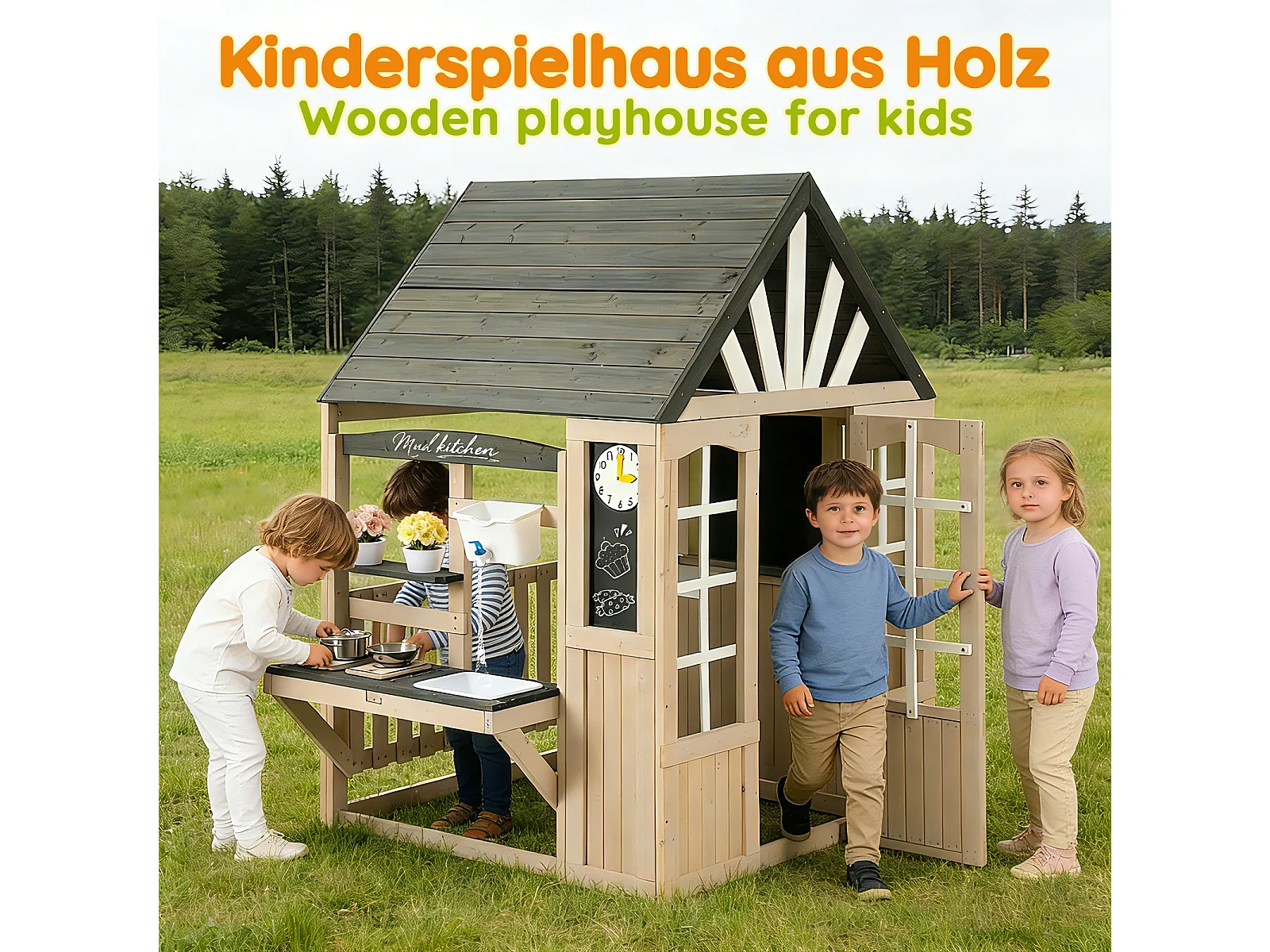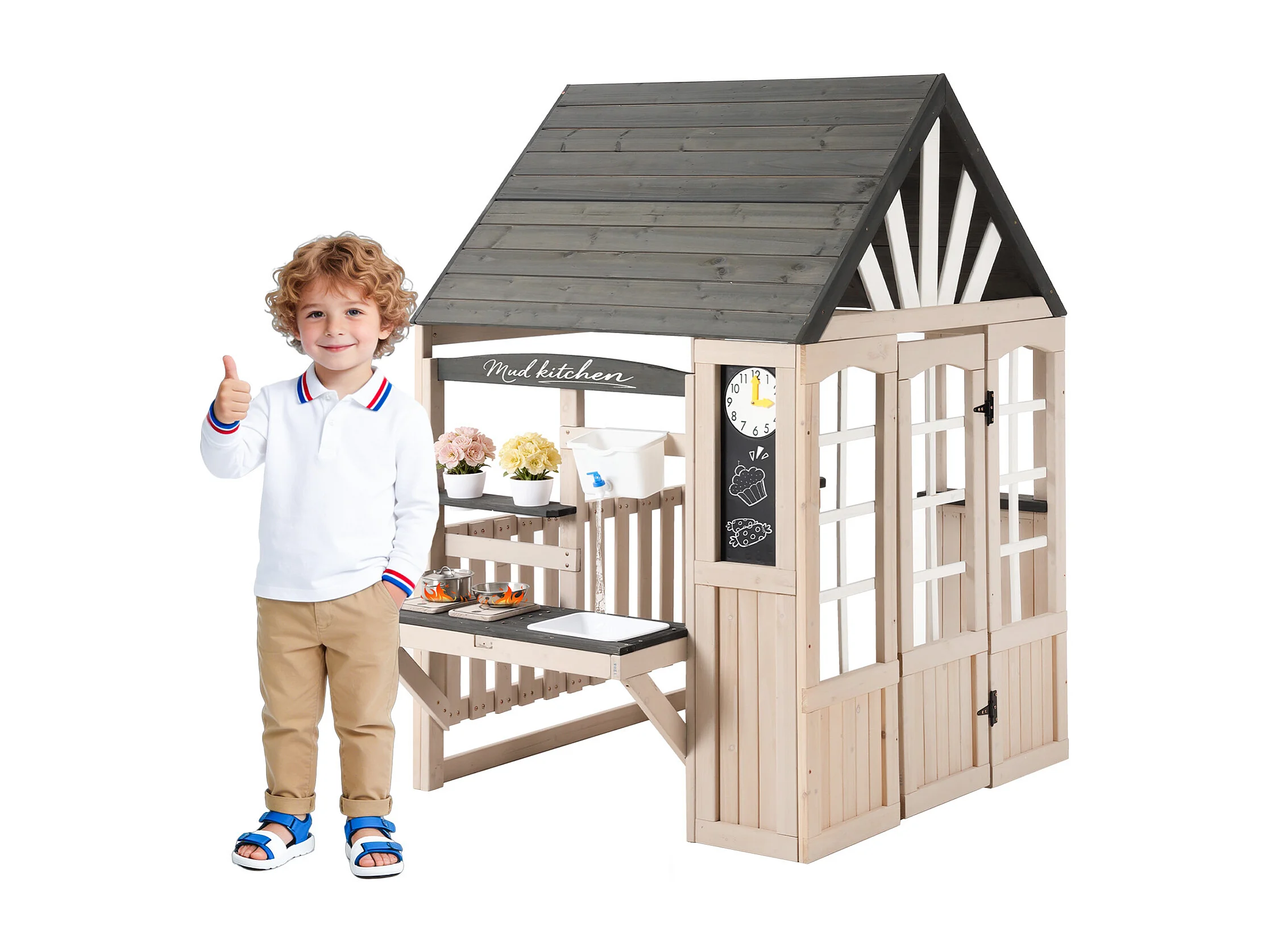 Jouets de cuisine pour enfants pour le jardin 109x110x164cm - avec un vrai robinet - Jouet d’Imitation pour 3 Ans+ (Naturel+Gris)
