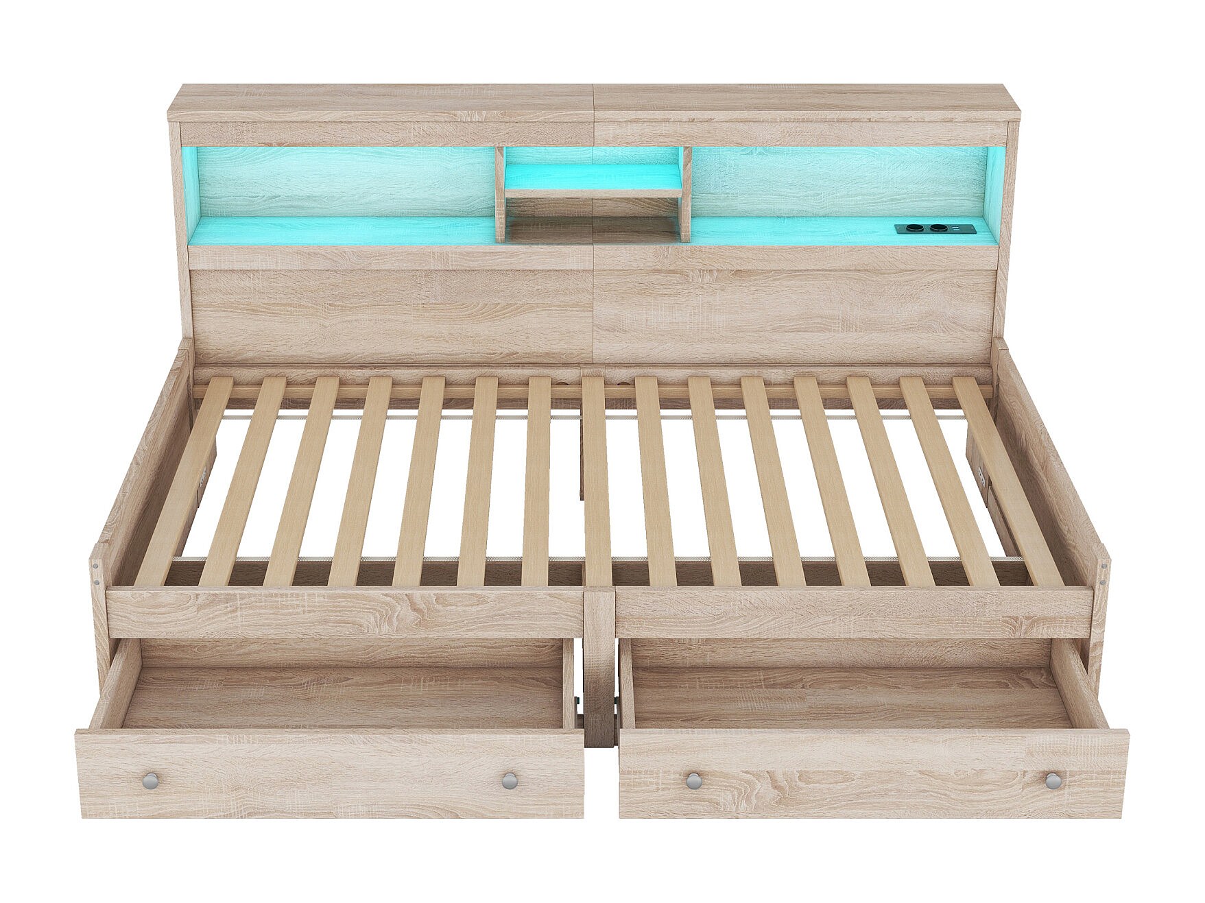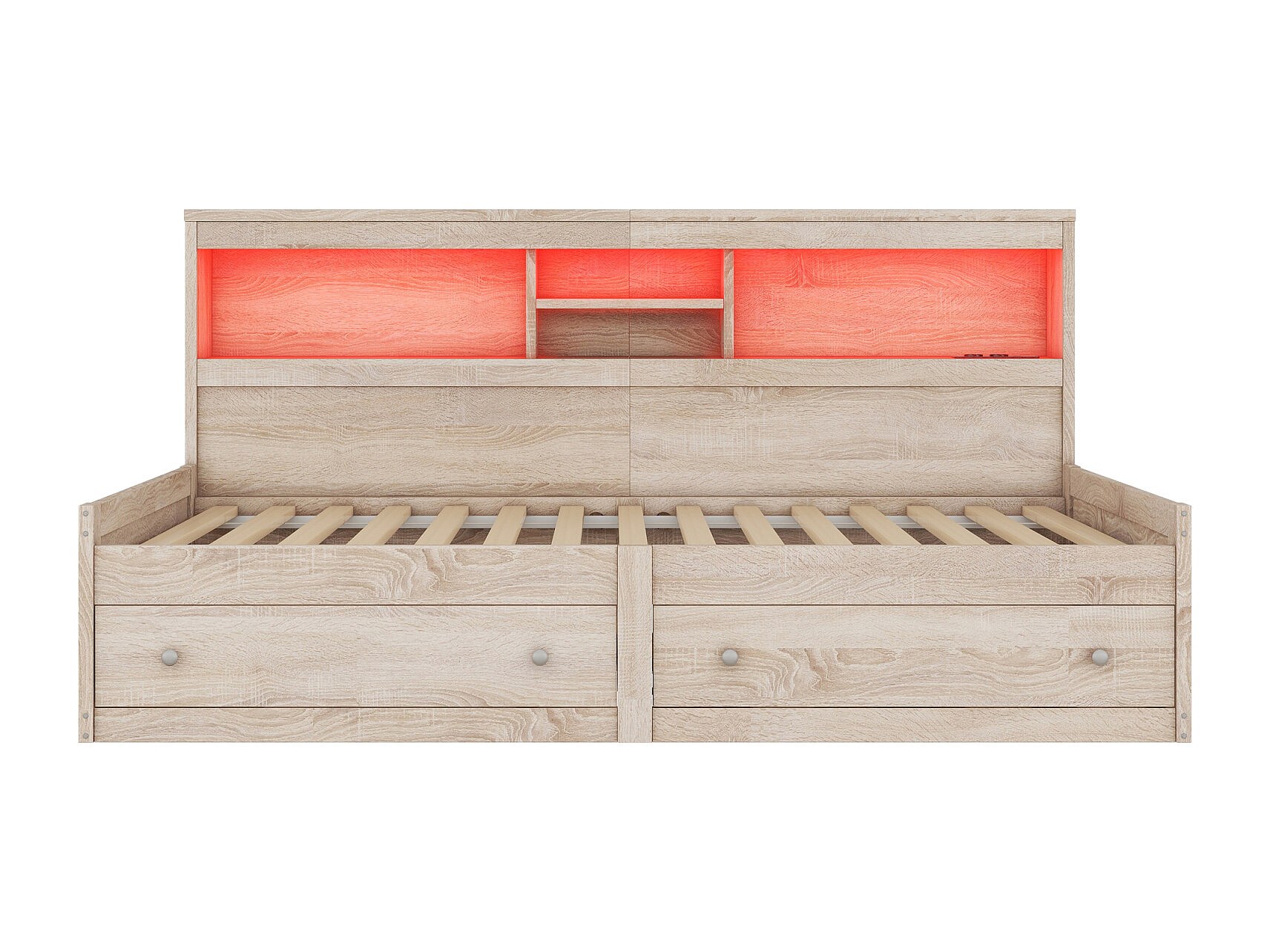 Jour-lit 90x200 cm, canapé-lit avec 2 USB et 2 ports de charge, éclairage d’ambiance, 2 tiroirs, sommier à lattes, structure en bois naturel