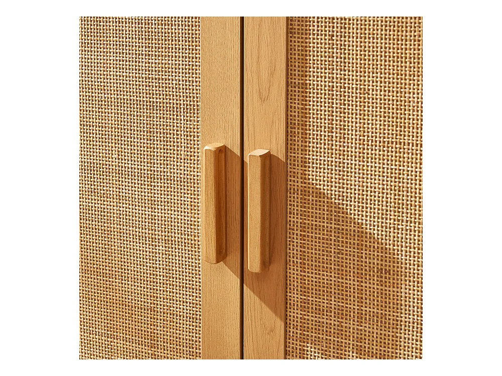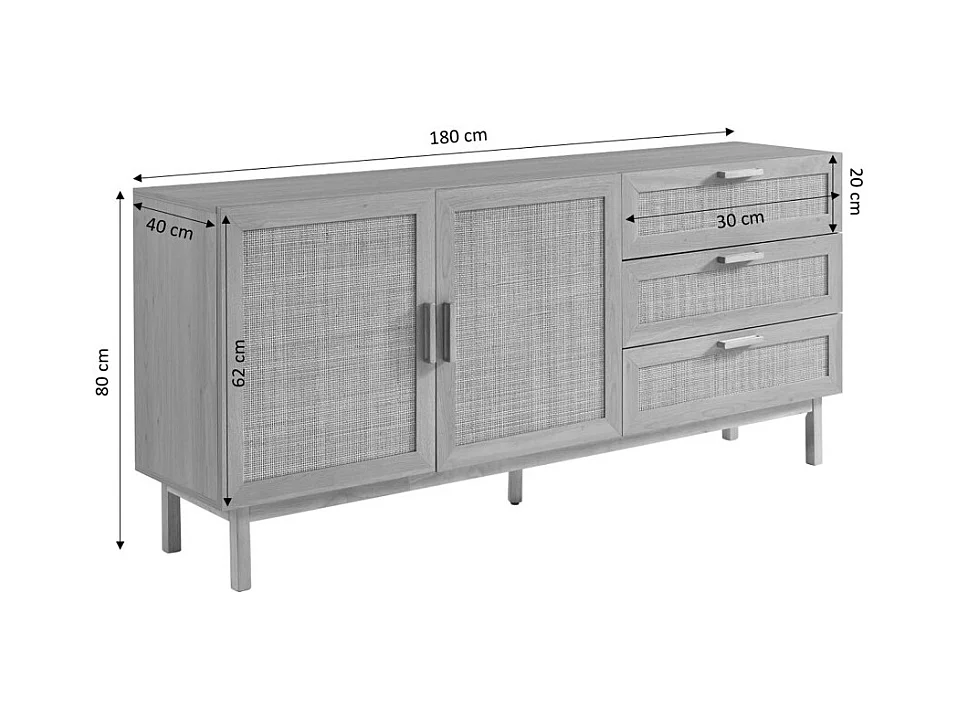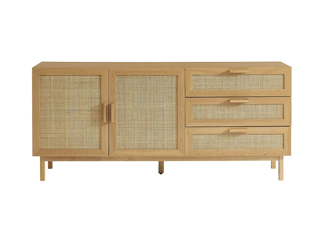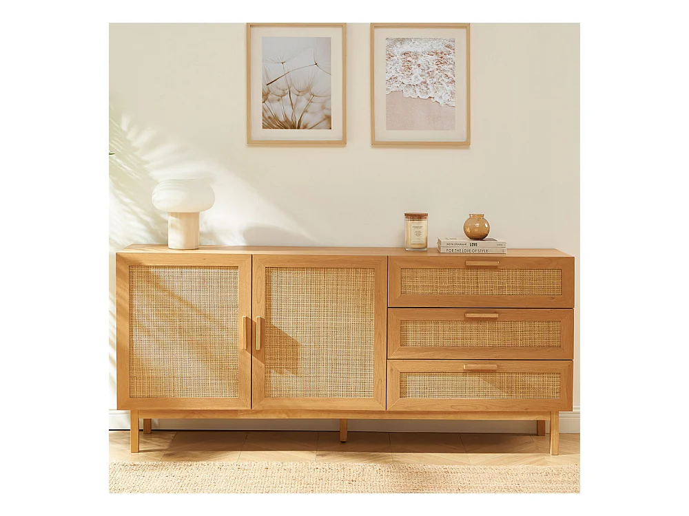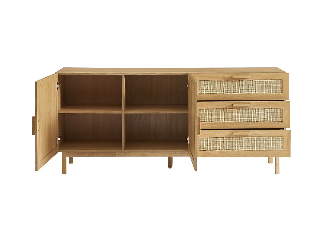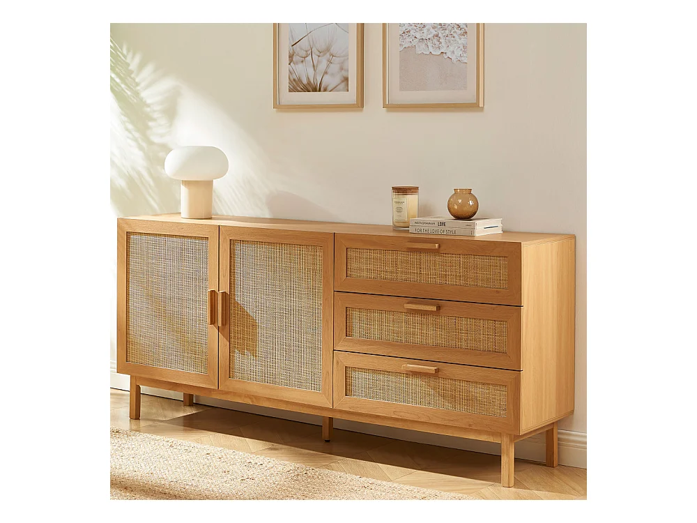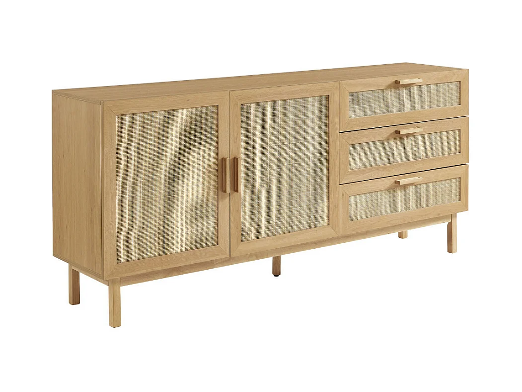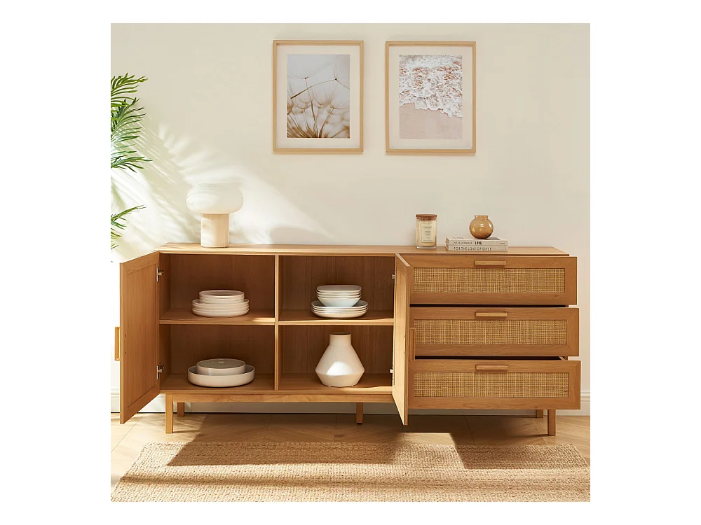 June - Buffet 2 portes 3 tiroirs en bois et cannage L180cm - Bois clair