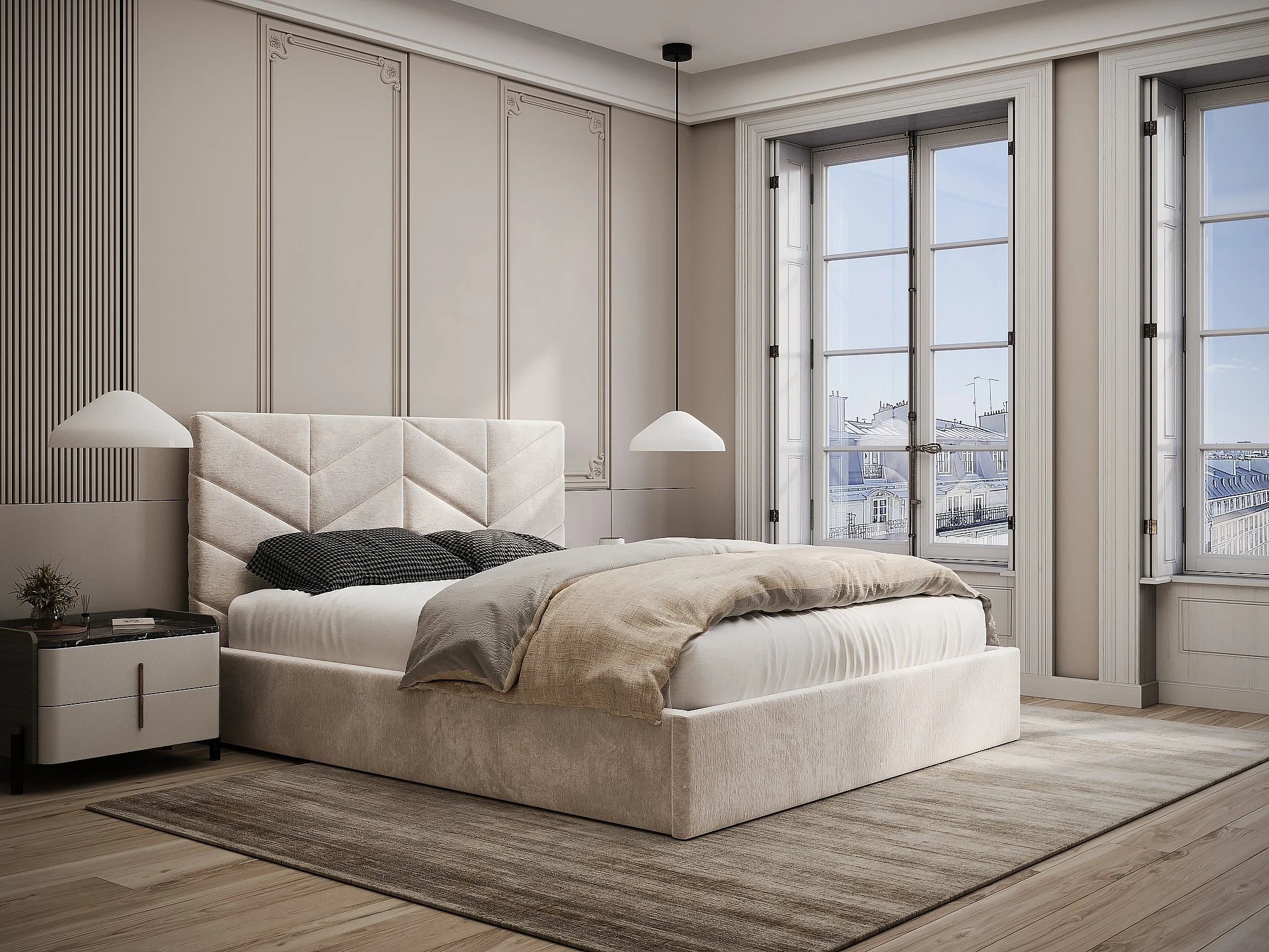 Lit coffre 160 x 200 cm - Tissu texturé - Crème + Matelas - JUSTANI