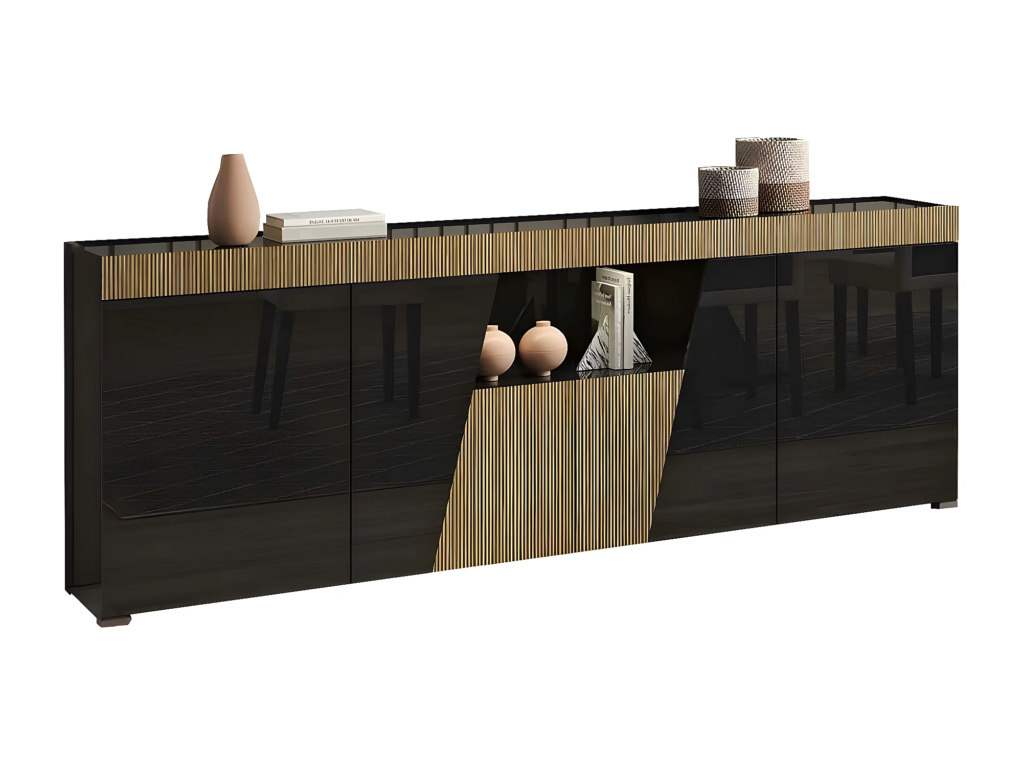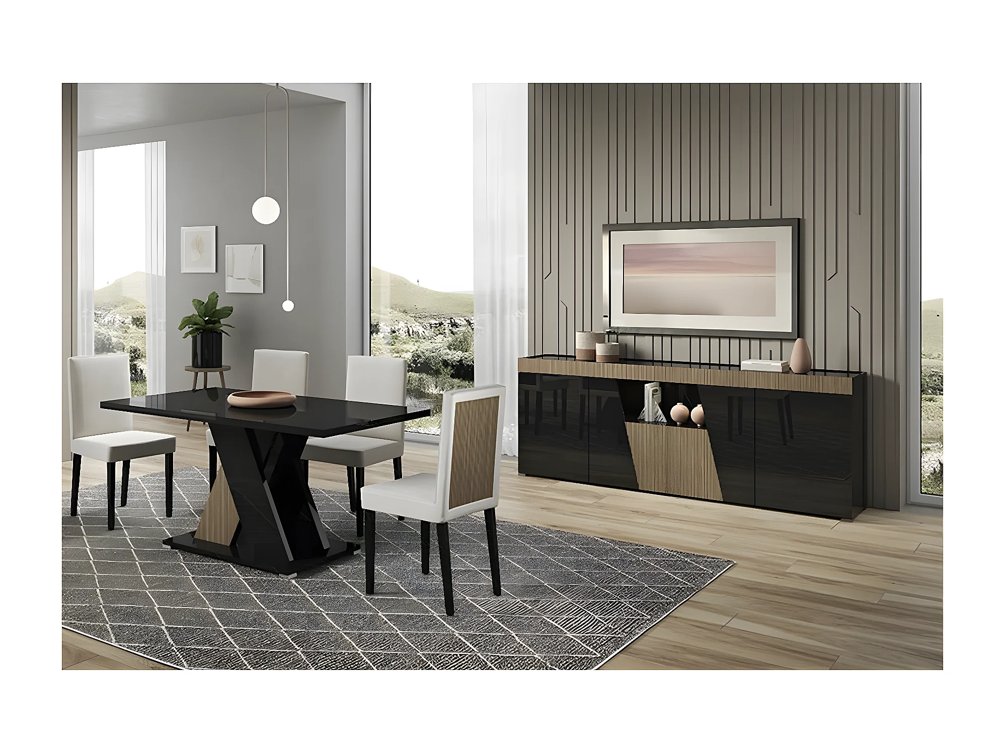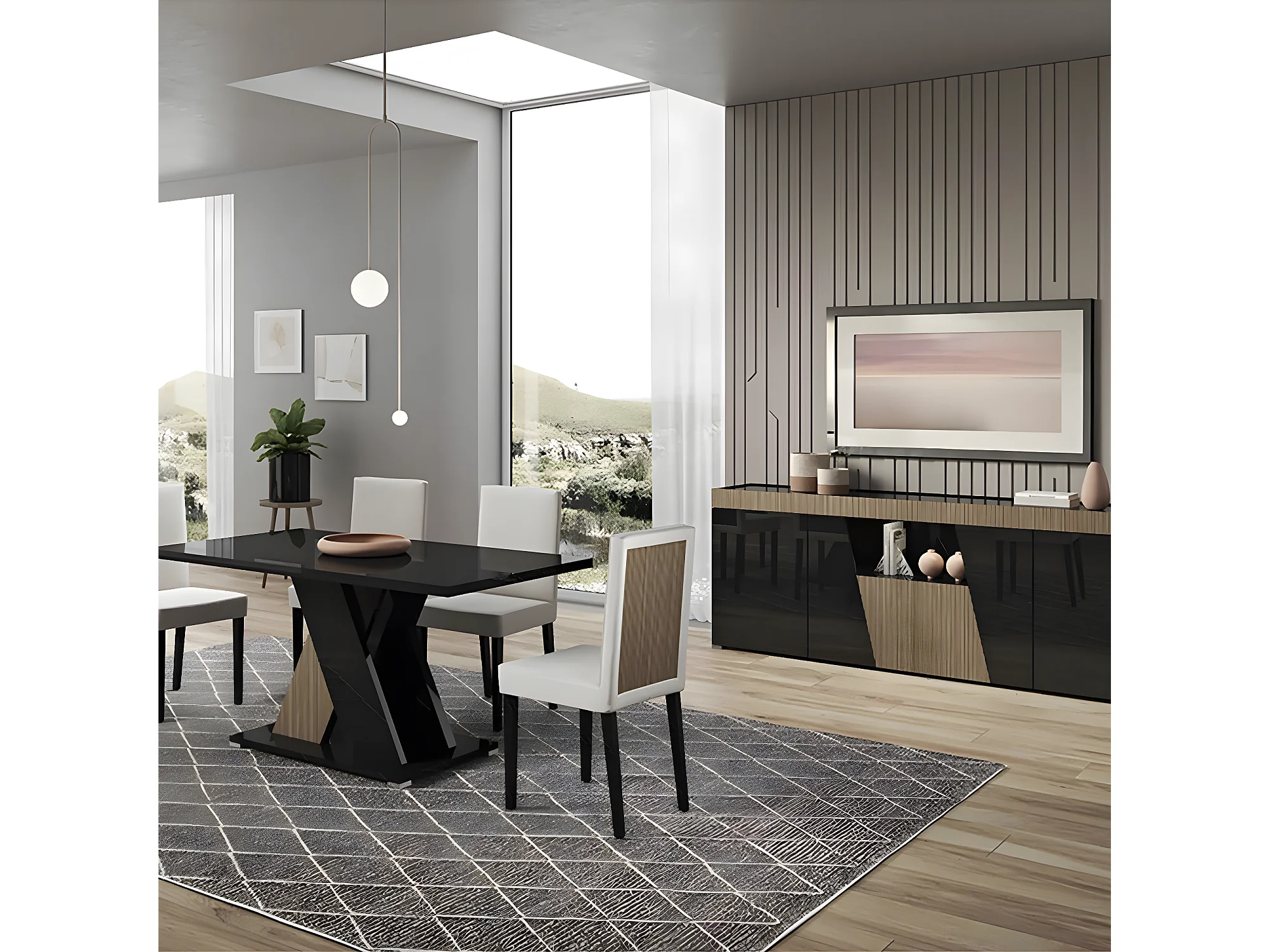 KADALA - Ensemble Séjour Laqué Noir Décor Bois Table 160cm + Buffet avec Leds