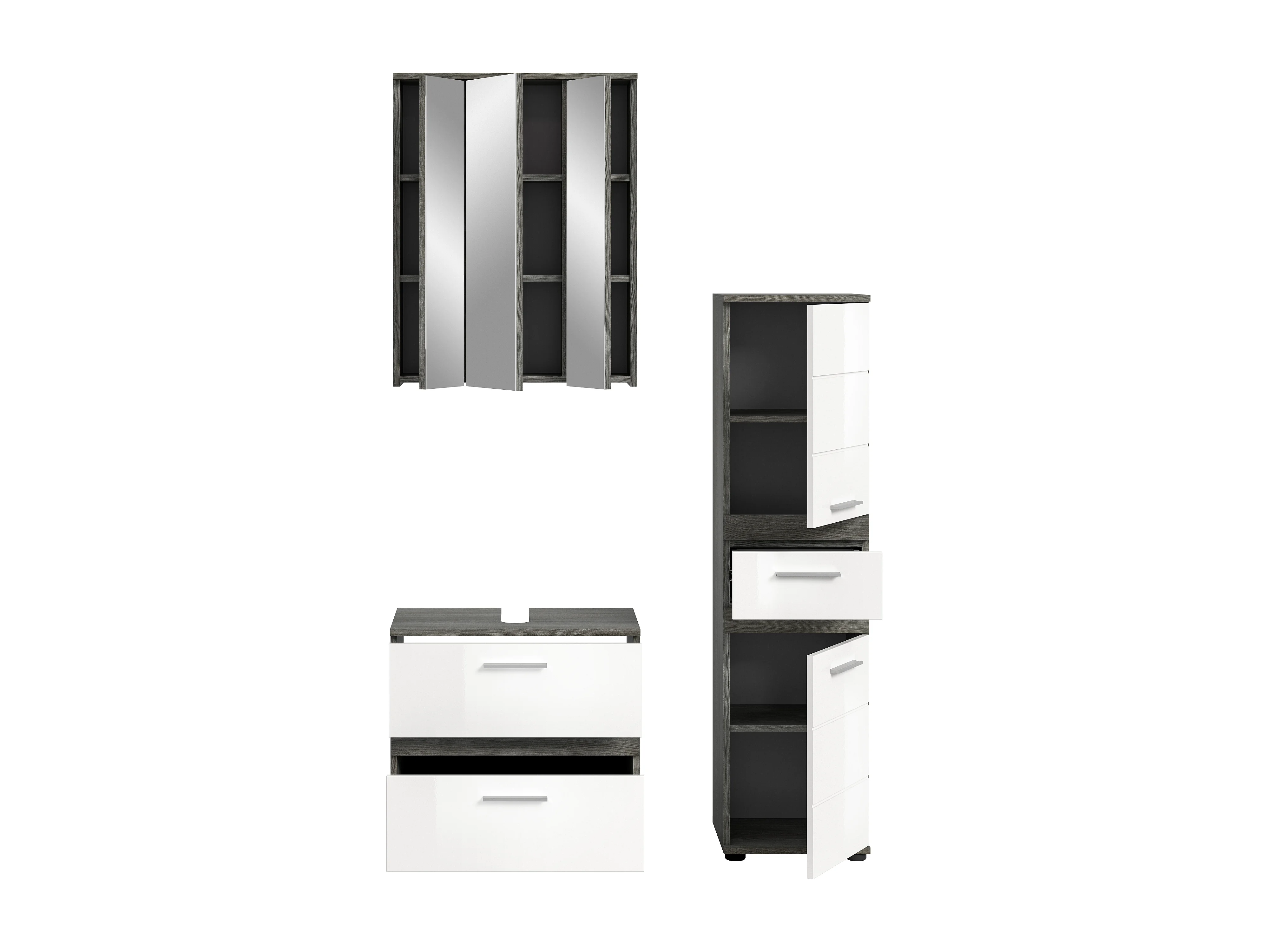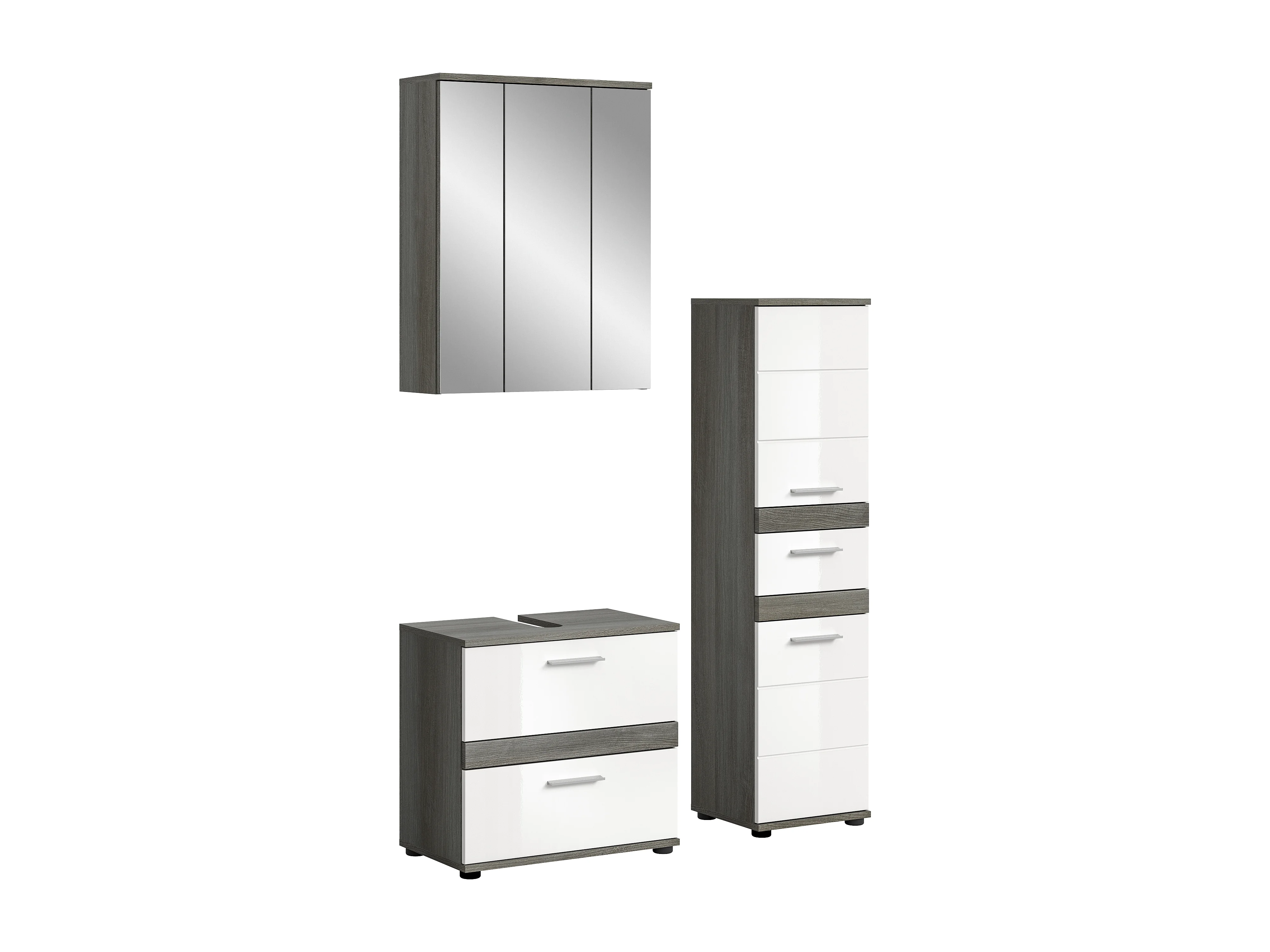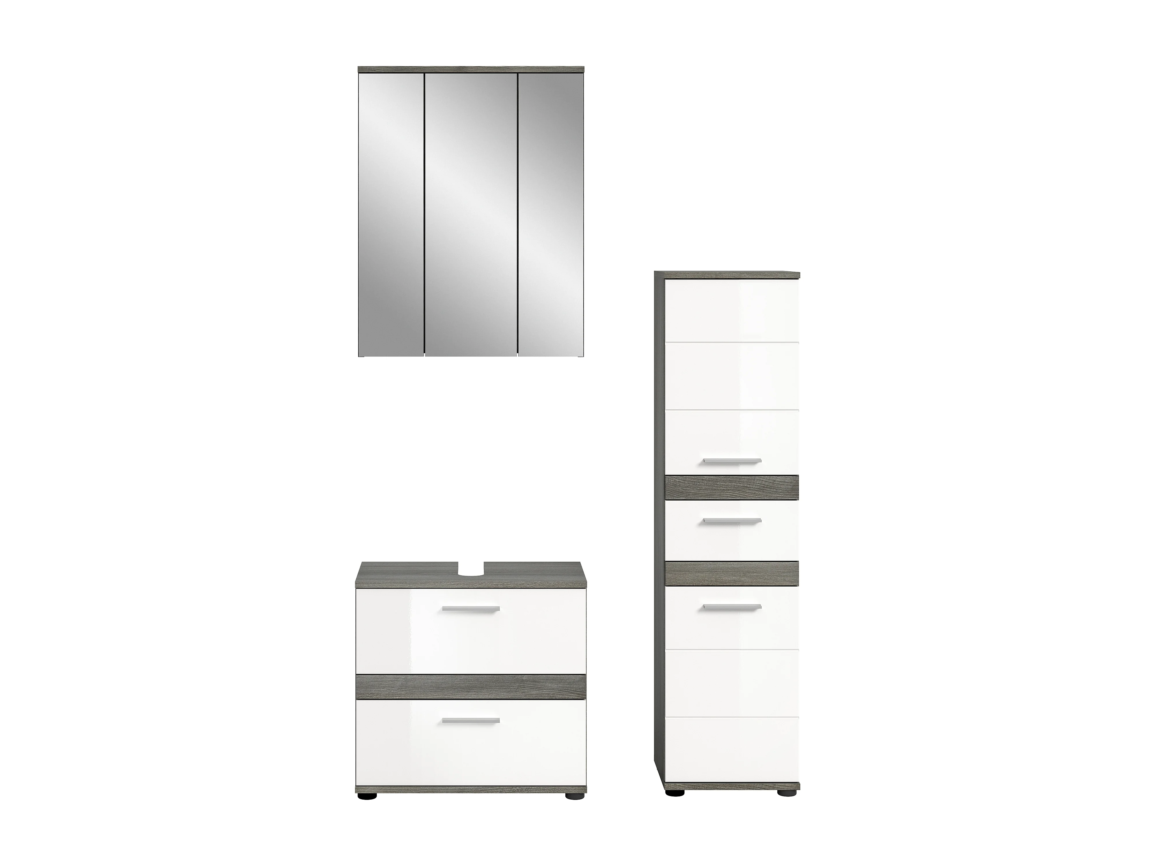 Kaleb - Ensemble de 3 meubles de salle de bains en mélaminé blanc et argenté, vasque non incluse (L/H/P : 110x191x34 cm)