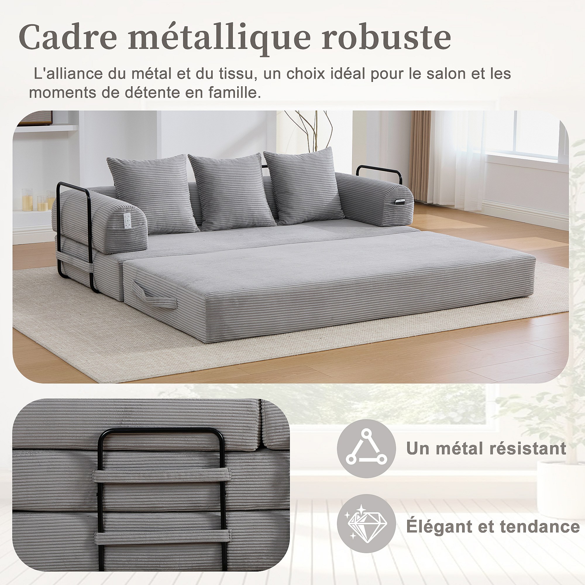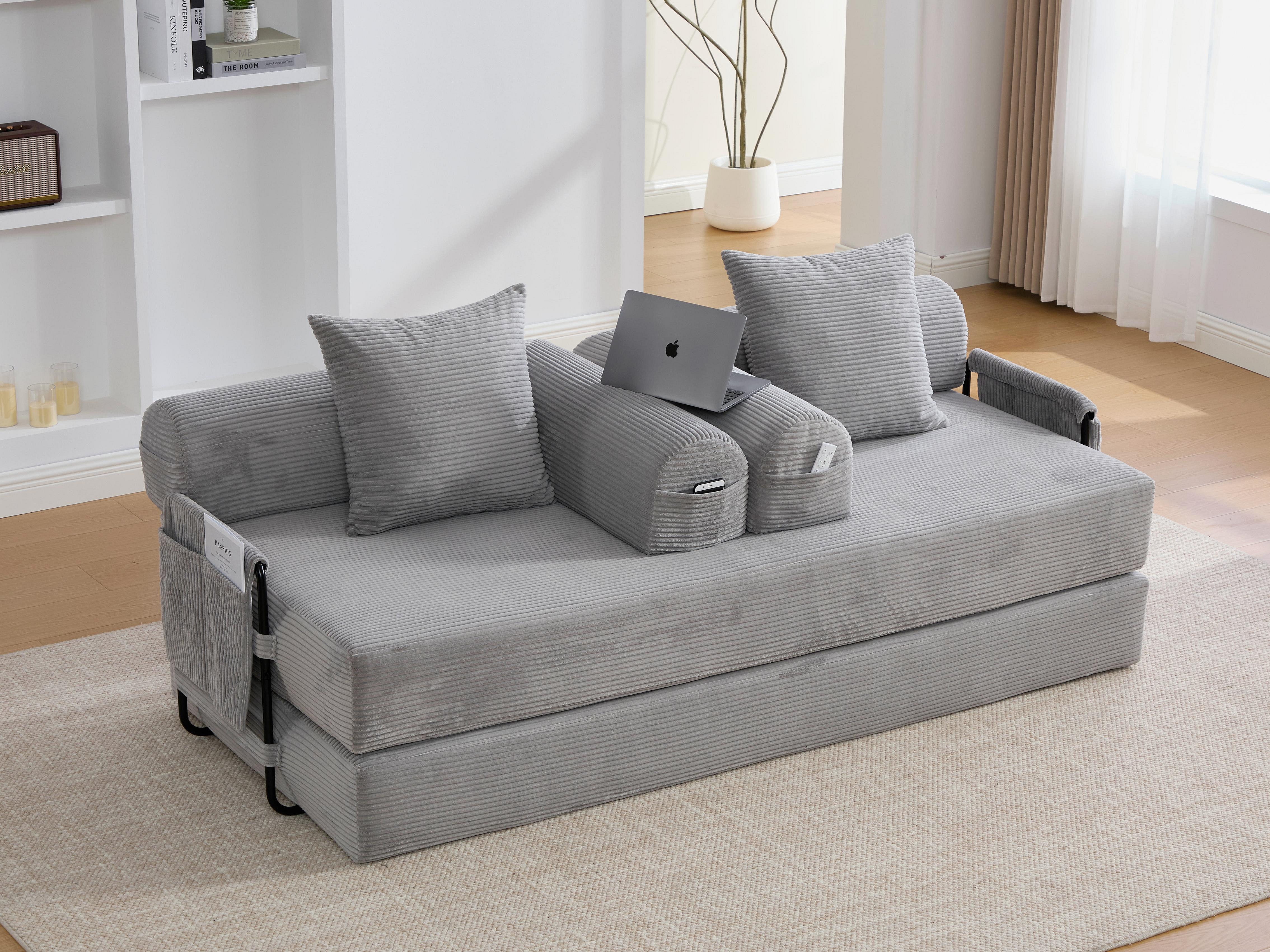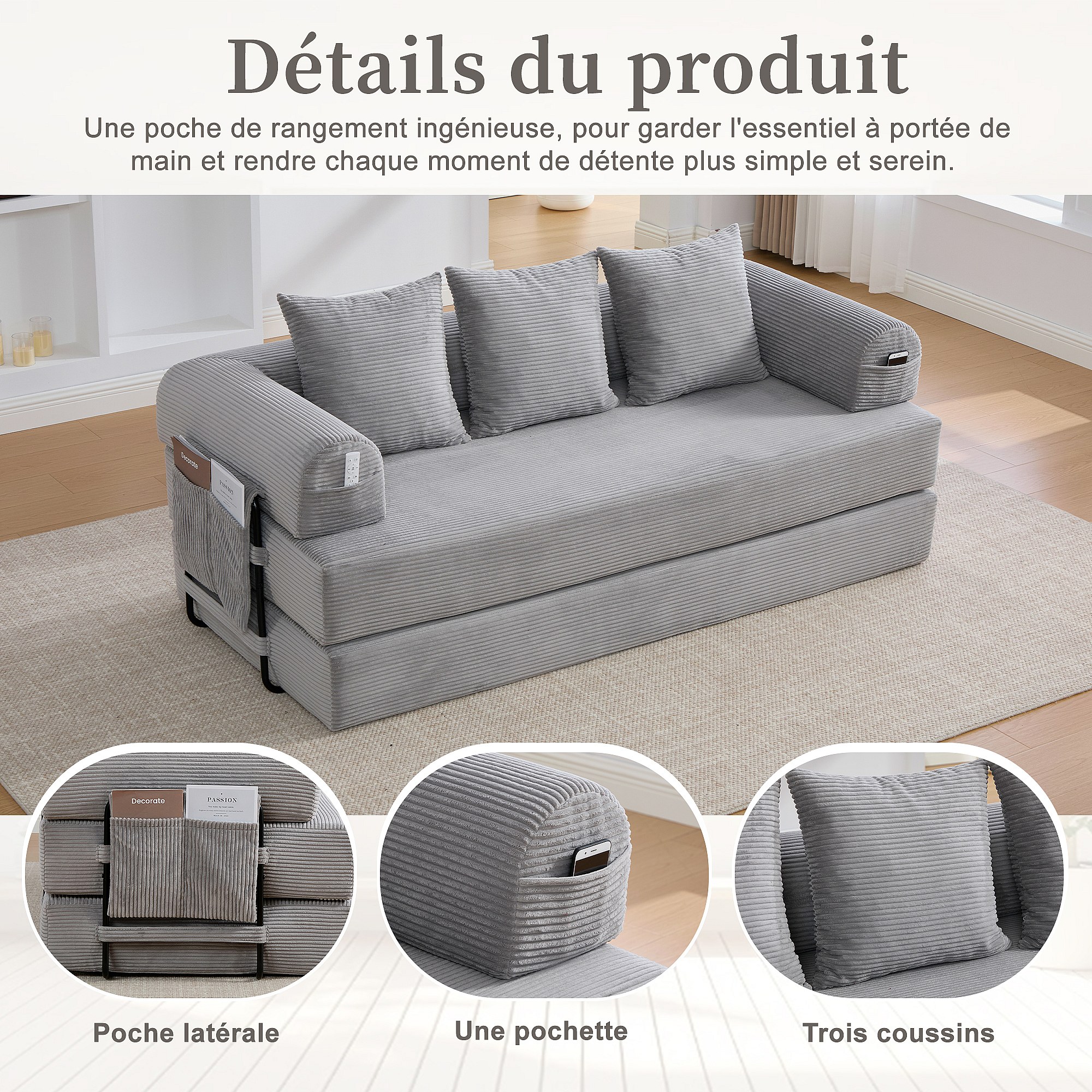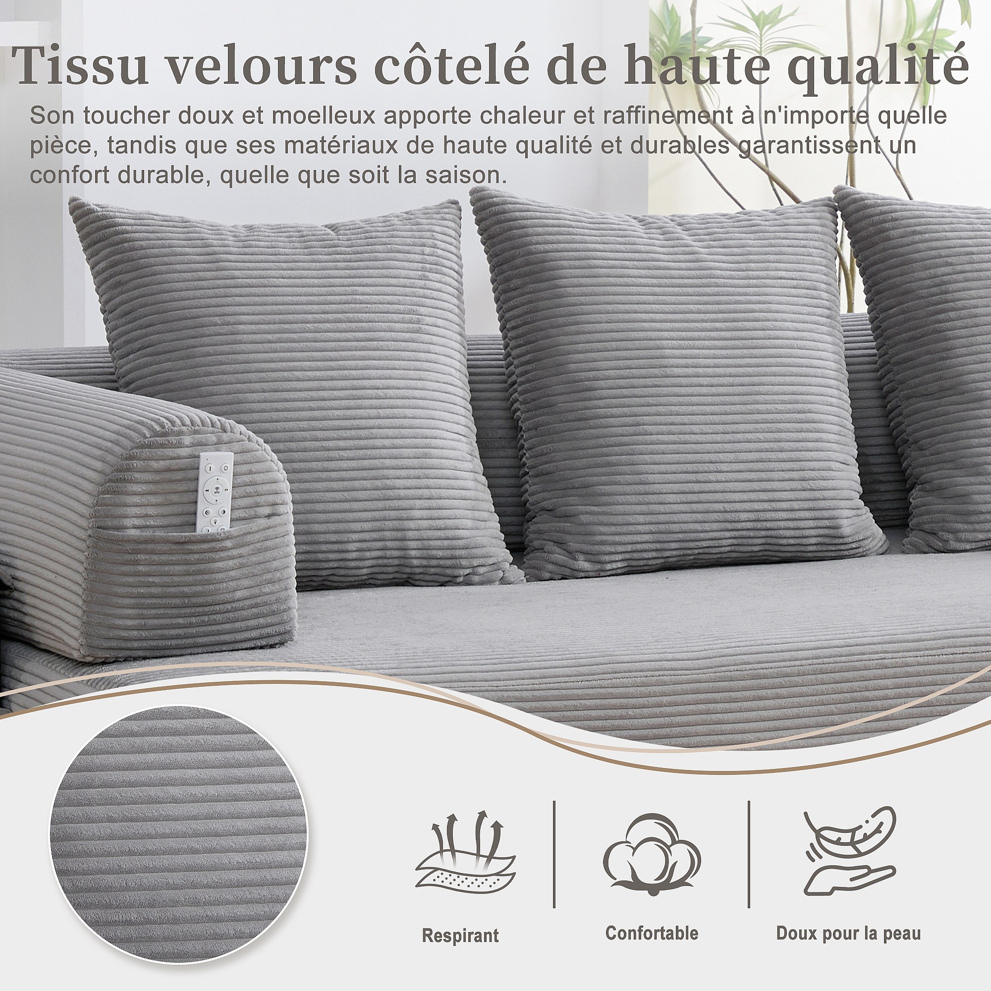 kaleido 2.0 - Canapé Modulable en Velours Côtelé - Cadre Métallique Externe - Poches de Rangement et 3 Coussins Inclus - Gris Clair - Idéal pour Salon, Appartement