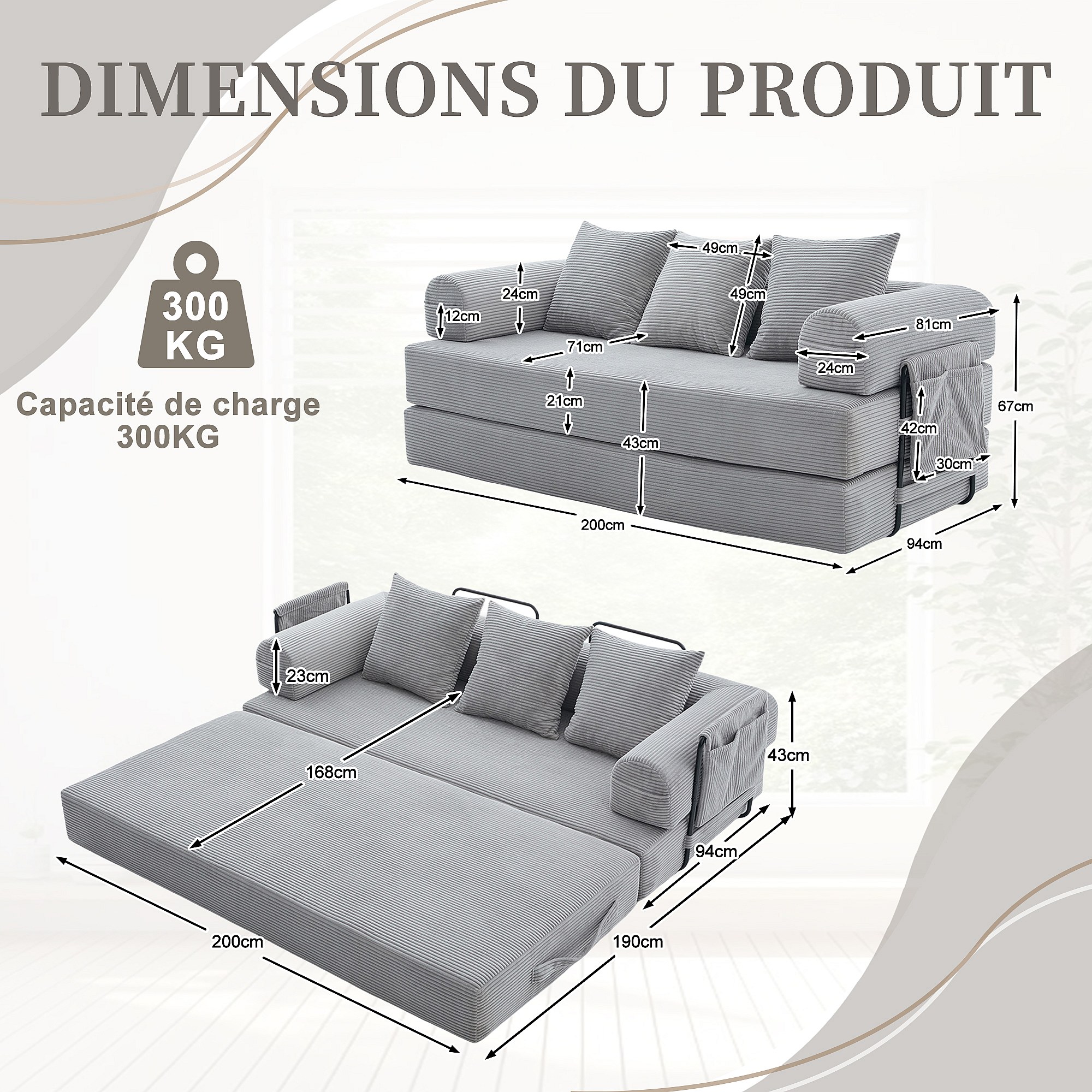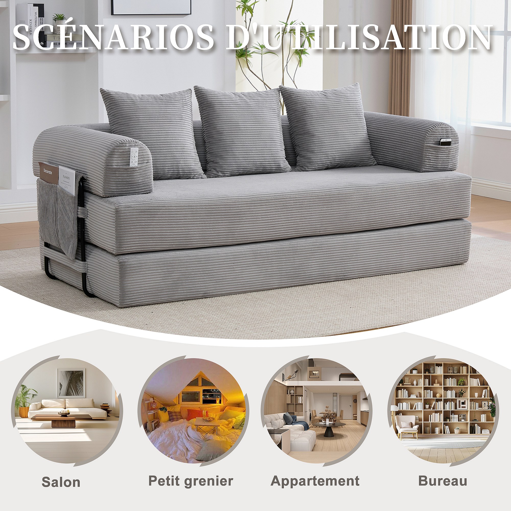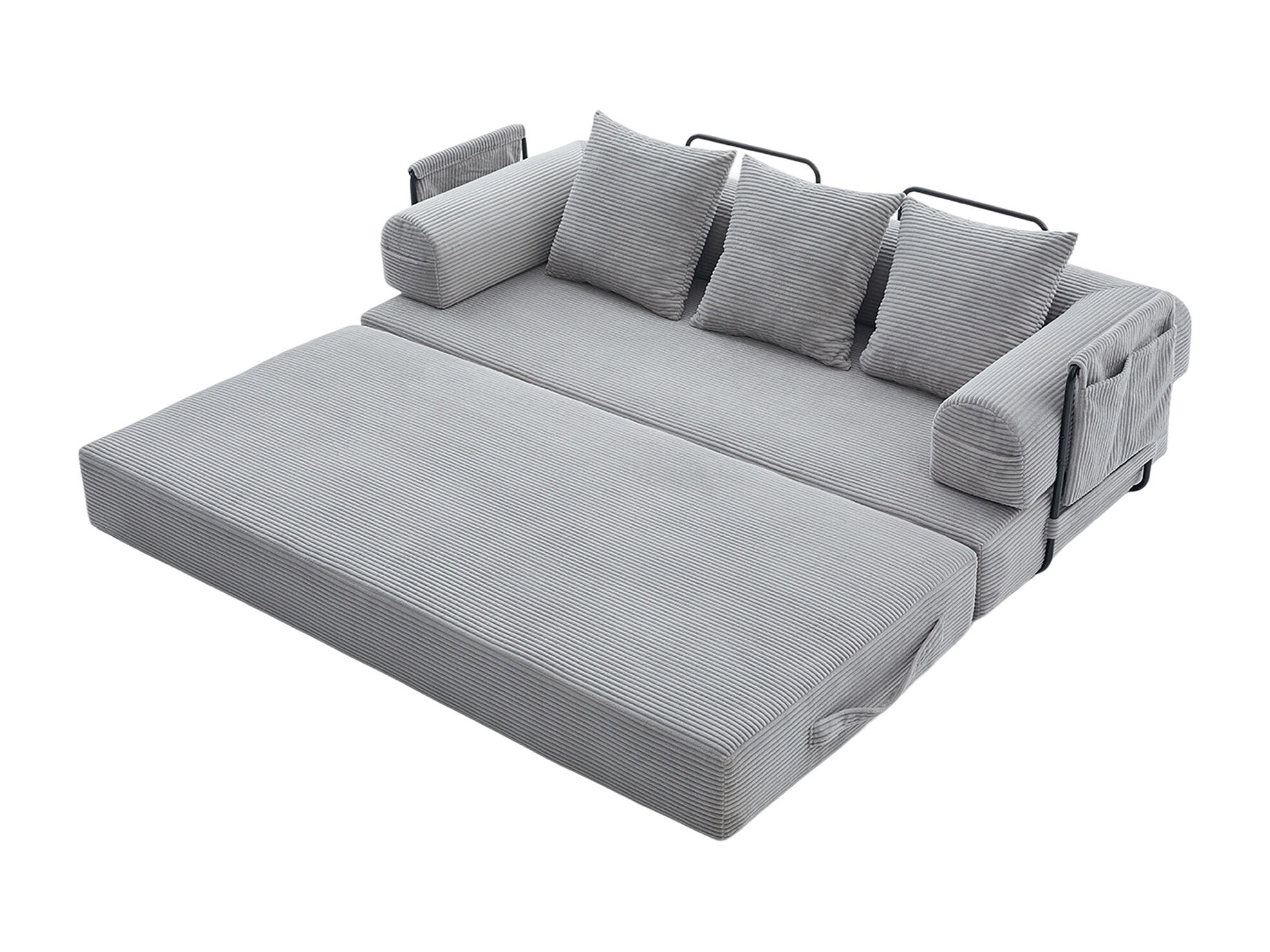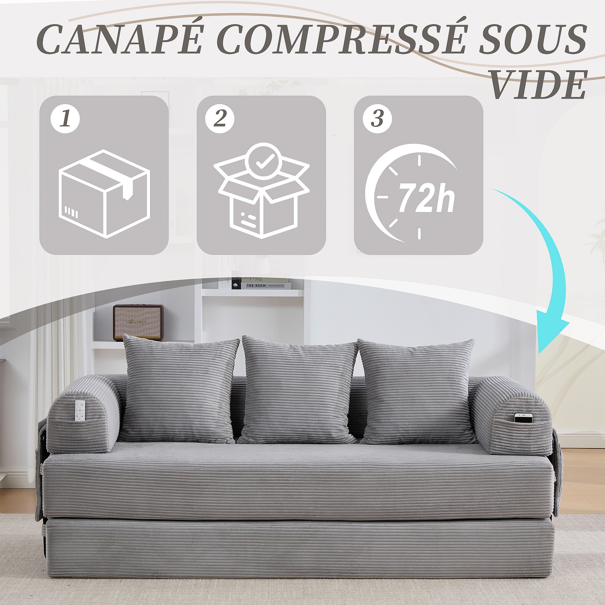 kaleido 2.0 - Canapé Modulable en Velours Côtelé - Cadre Métallique Externe - Poches de Rangement et 3 Coussins Inclus - Gris Clair - Idéal pour Salon, Appartement