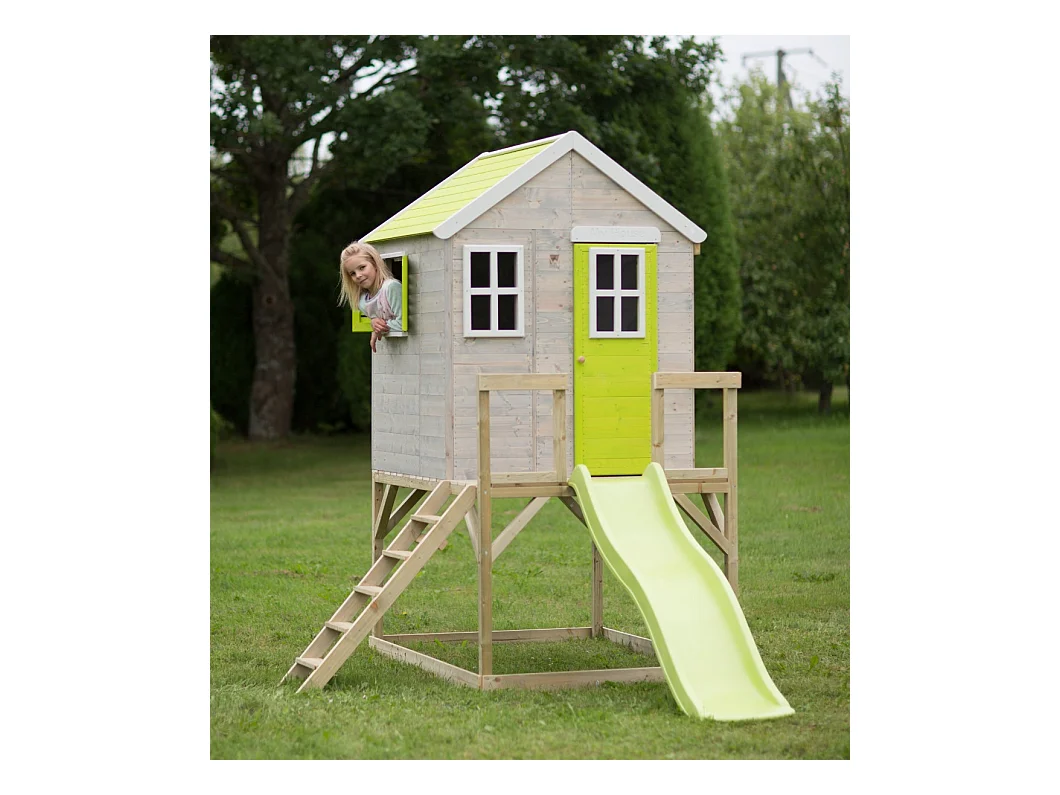 Kangui - Maison de jardin enfant extérieur - Cabane en Bois avec plateforme et toboggan - Toit étanche - Vert et Blanc