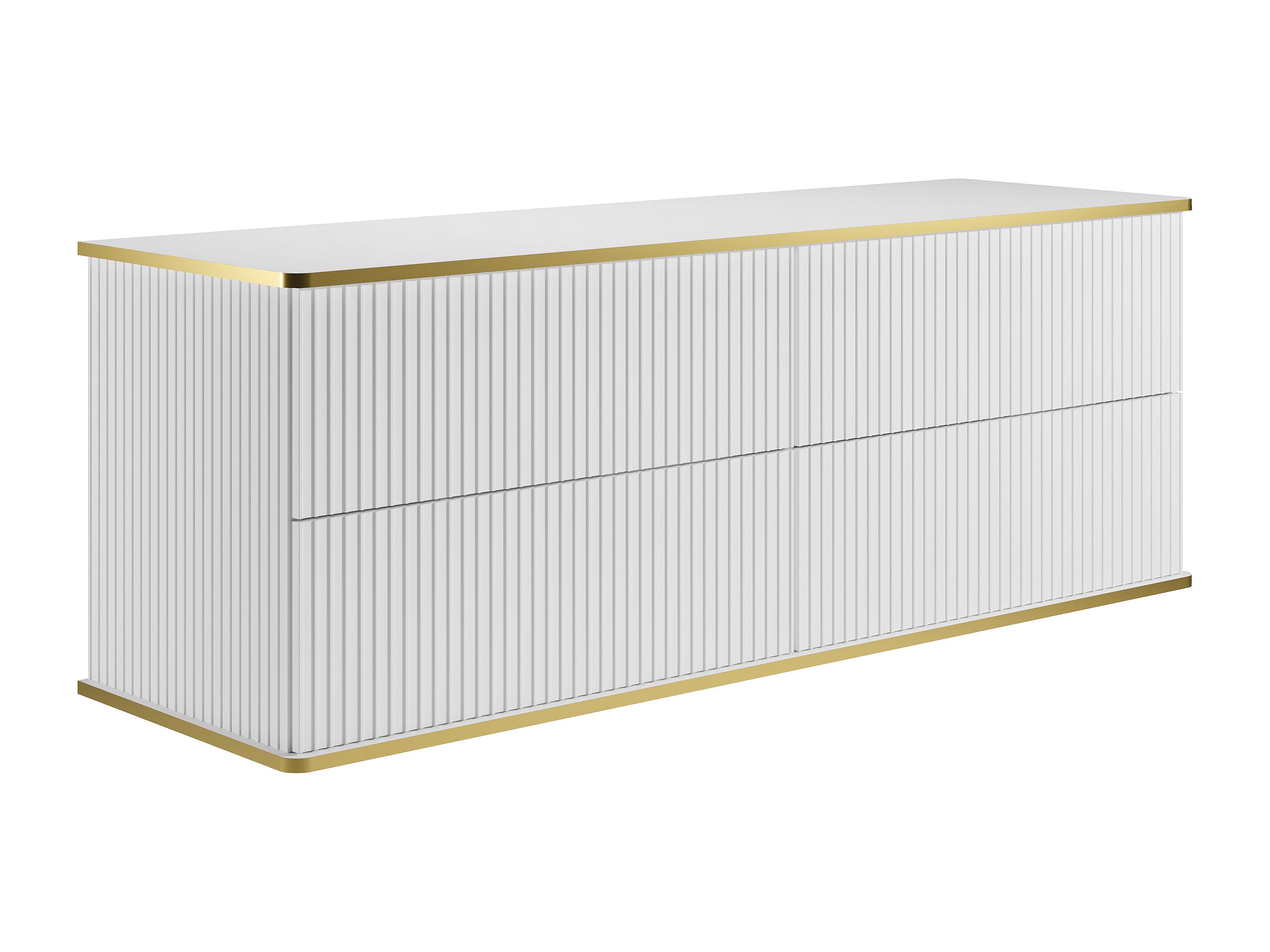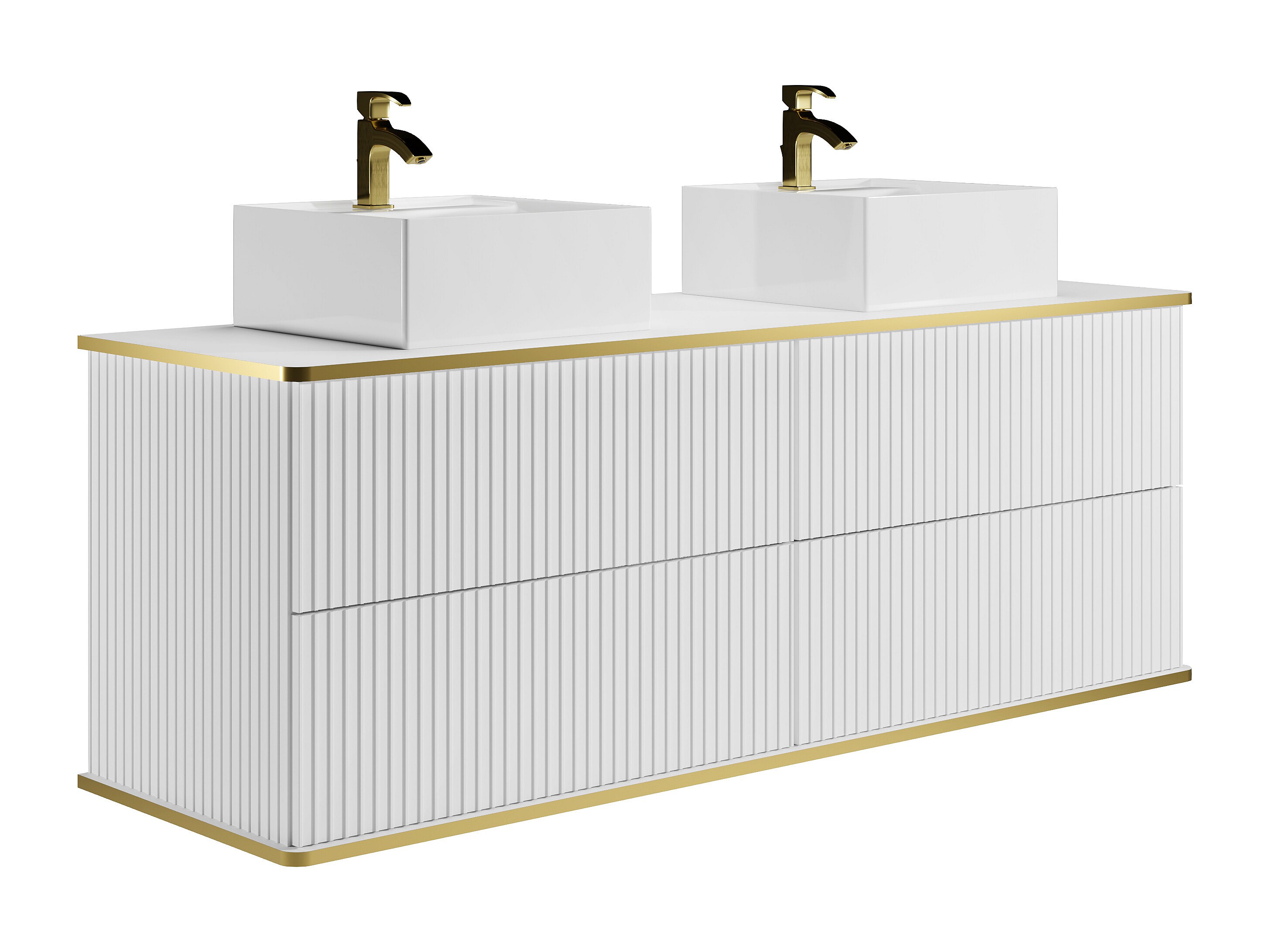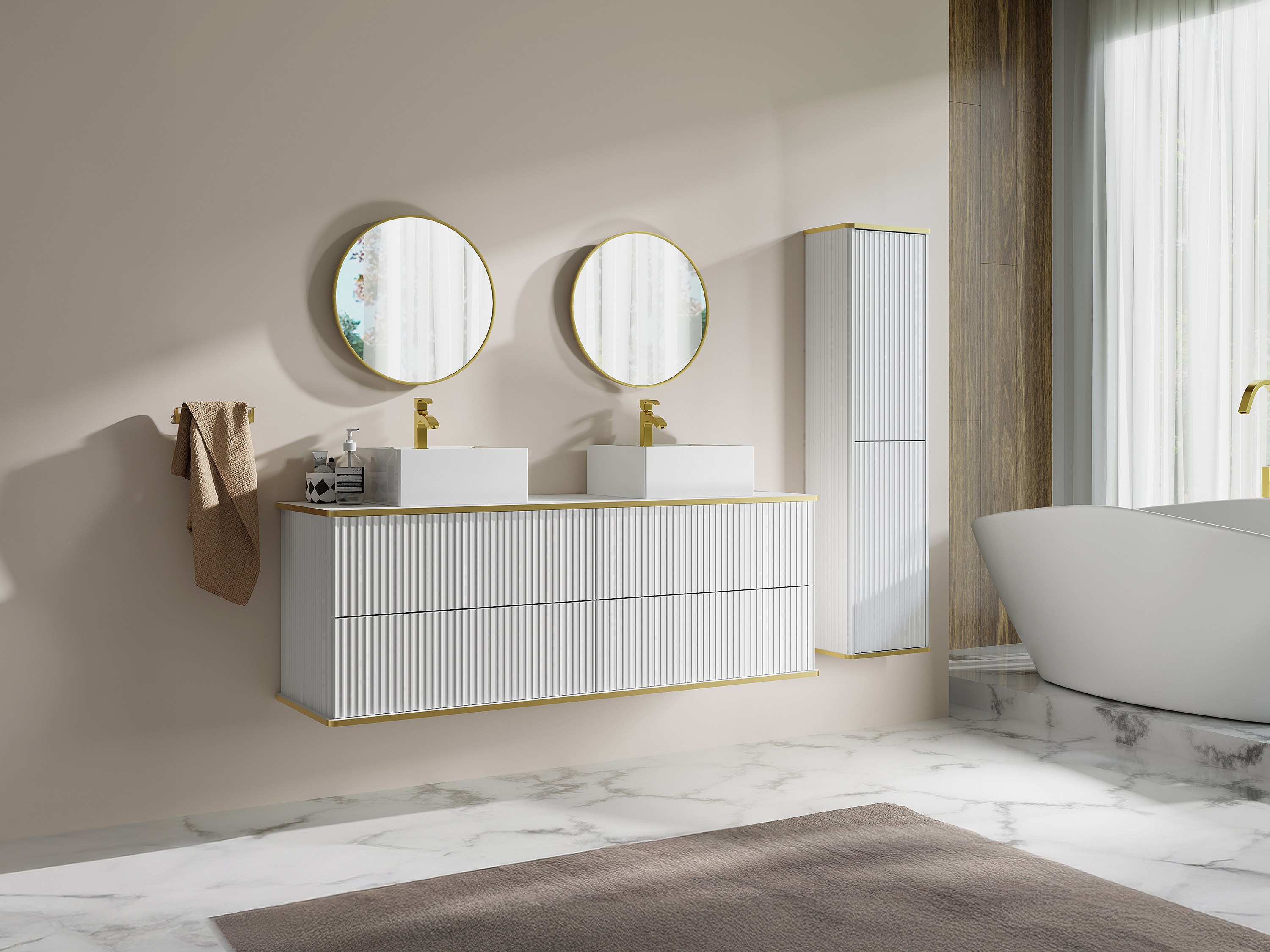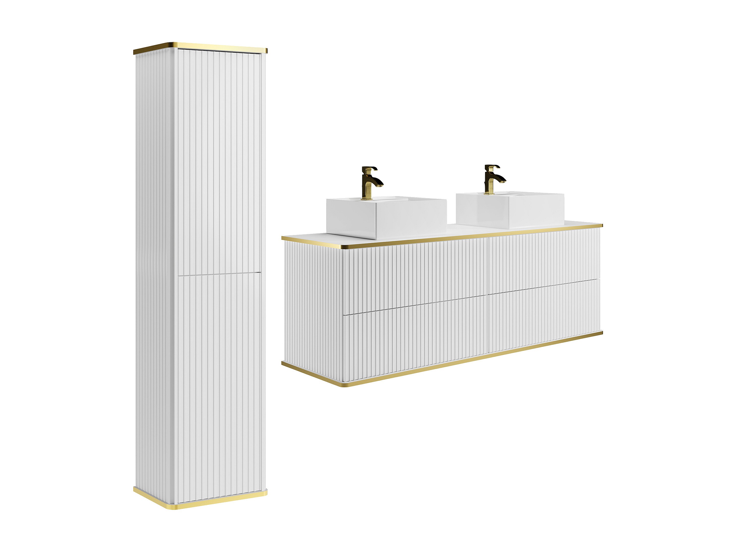 Meuble de salle de bain suspendu strié avec double vasque à poser carrée et colonne - Blanc - 150 cm - KELIZA