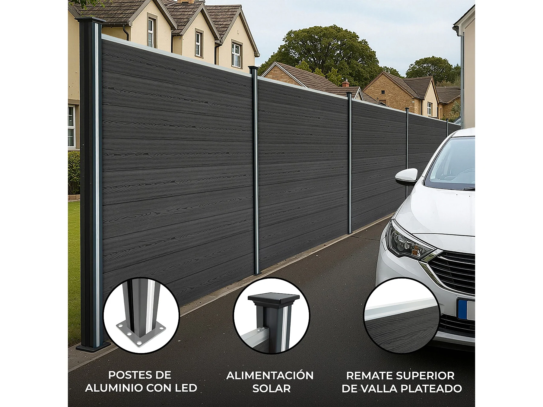 Kit Clôture Panneaux en Composite 1 Quadratique, 1 Incliné & 2 Poteaux à LED - Gris