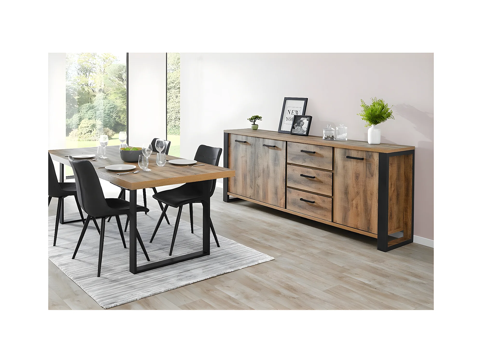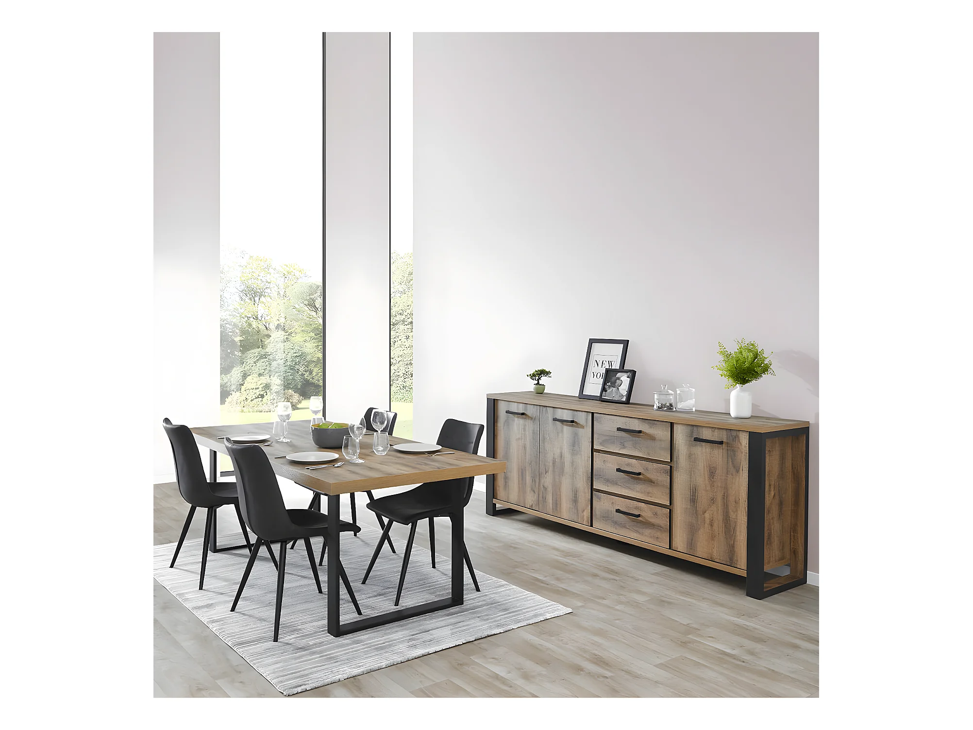 KORA - Ensemble Table 200cm + Buffet 3 Portes 3 Tiroirs
