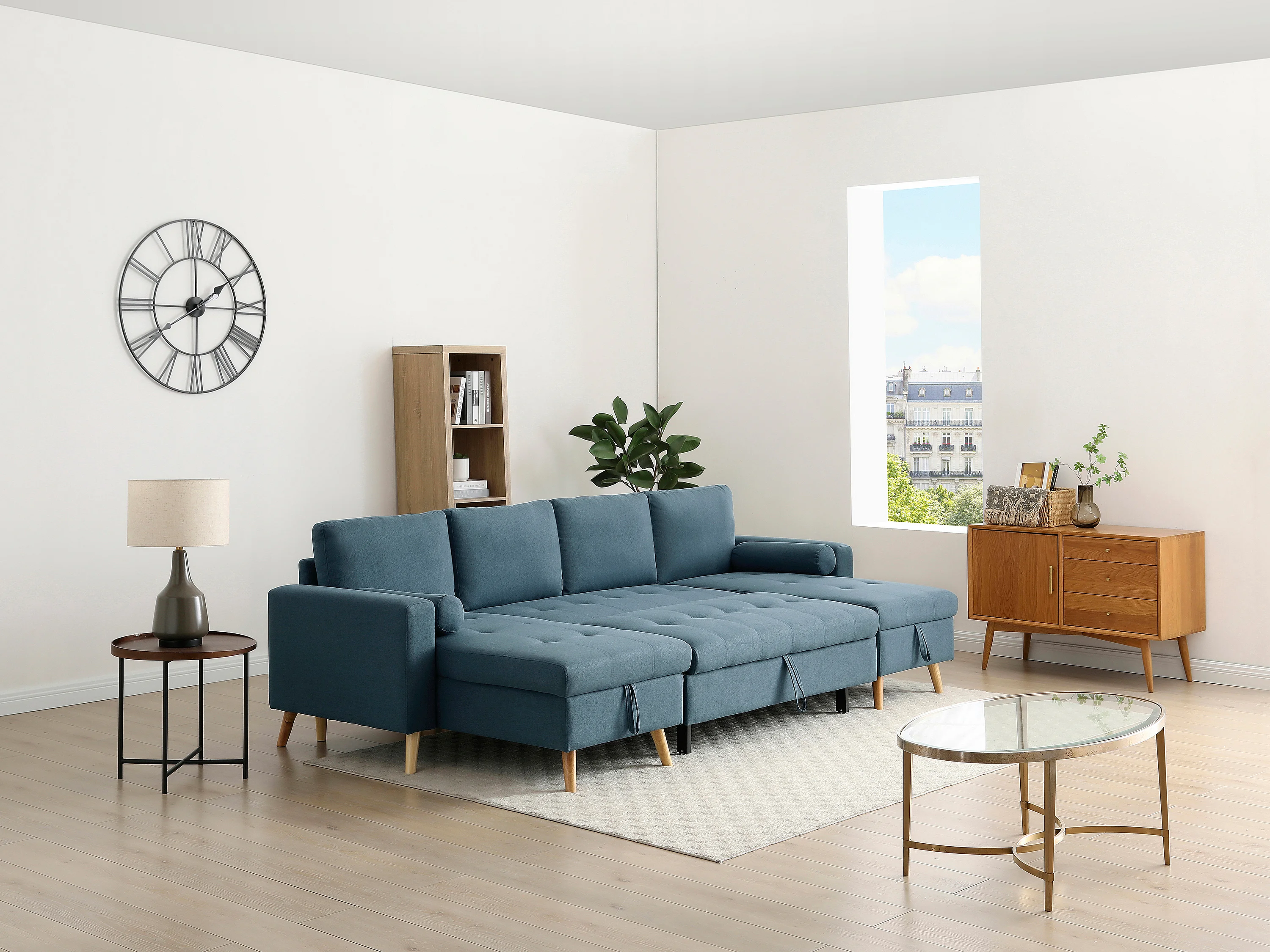 Canapé d'angle panoramique convertible en tissu bleu canard KORI