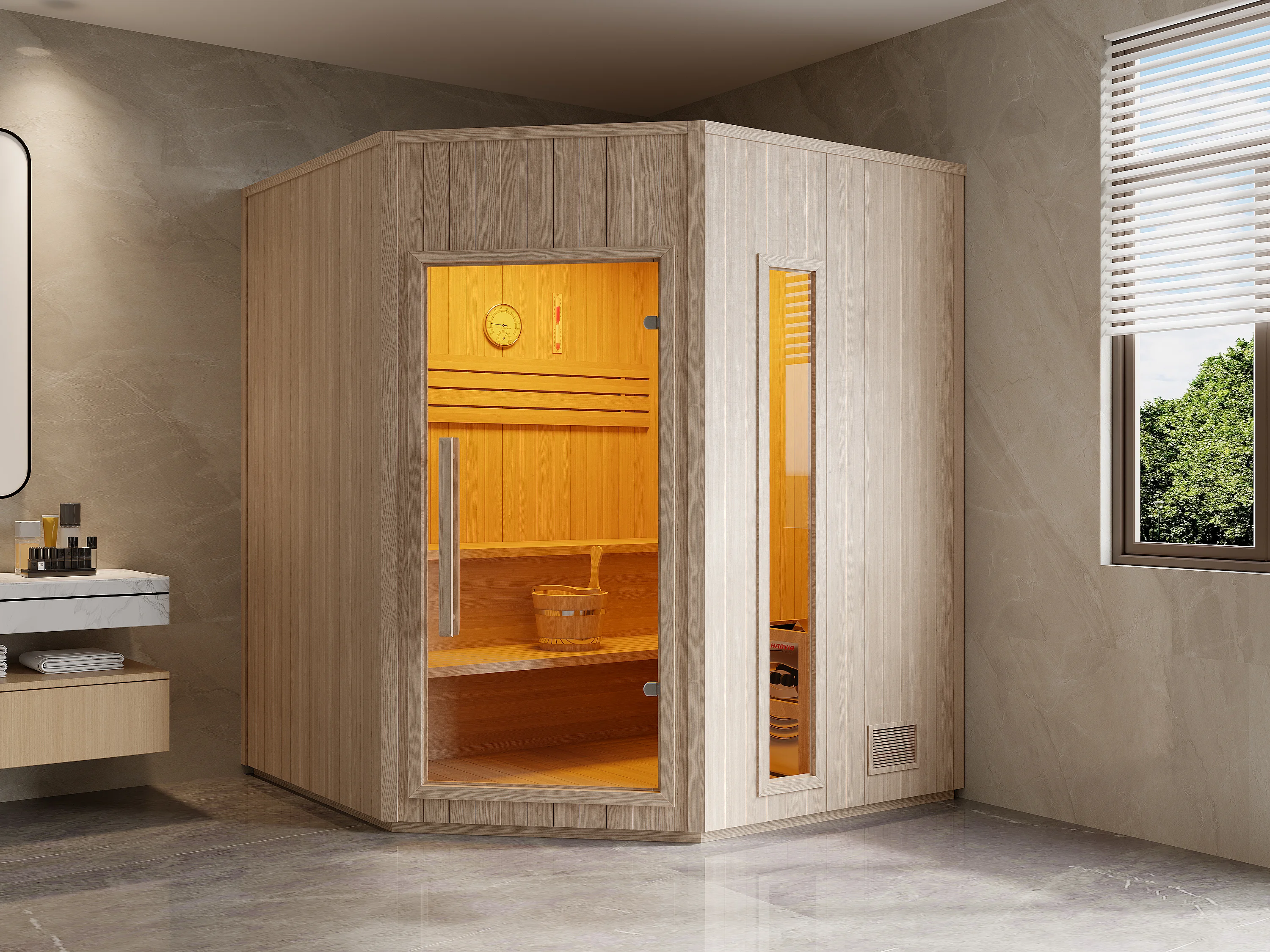 Sauna finlandais d'angle avec poêle 8KW - 5/6 places - L180 x P180 x H210 cm - KOTKA