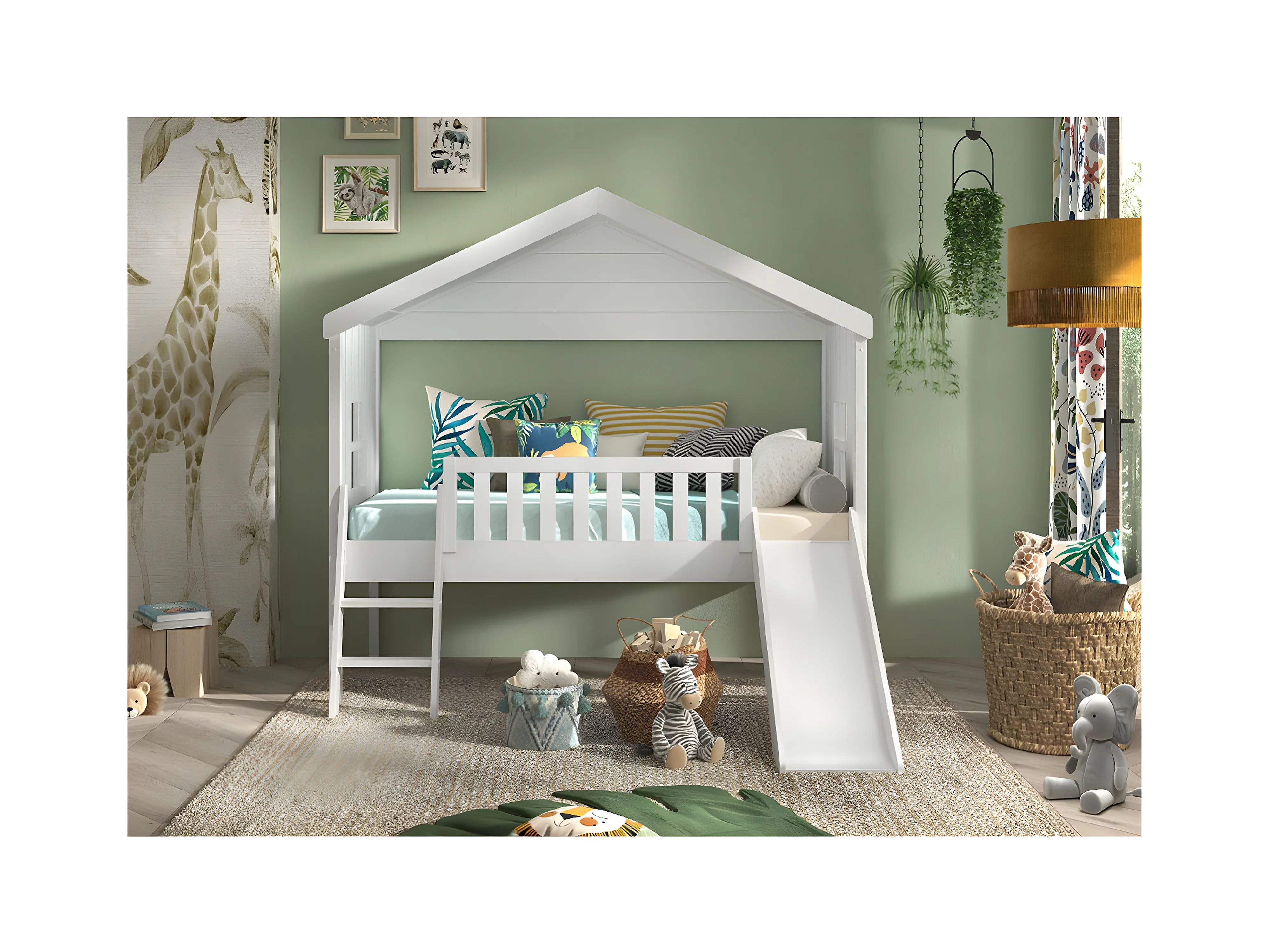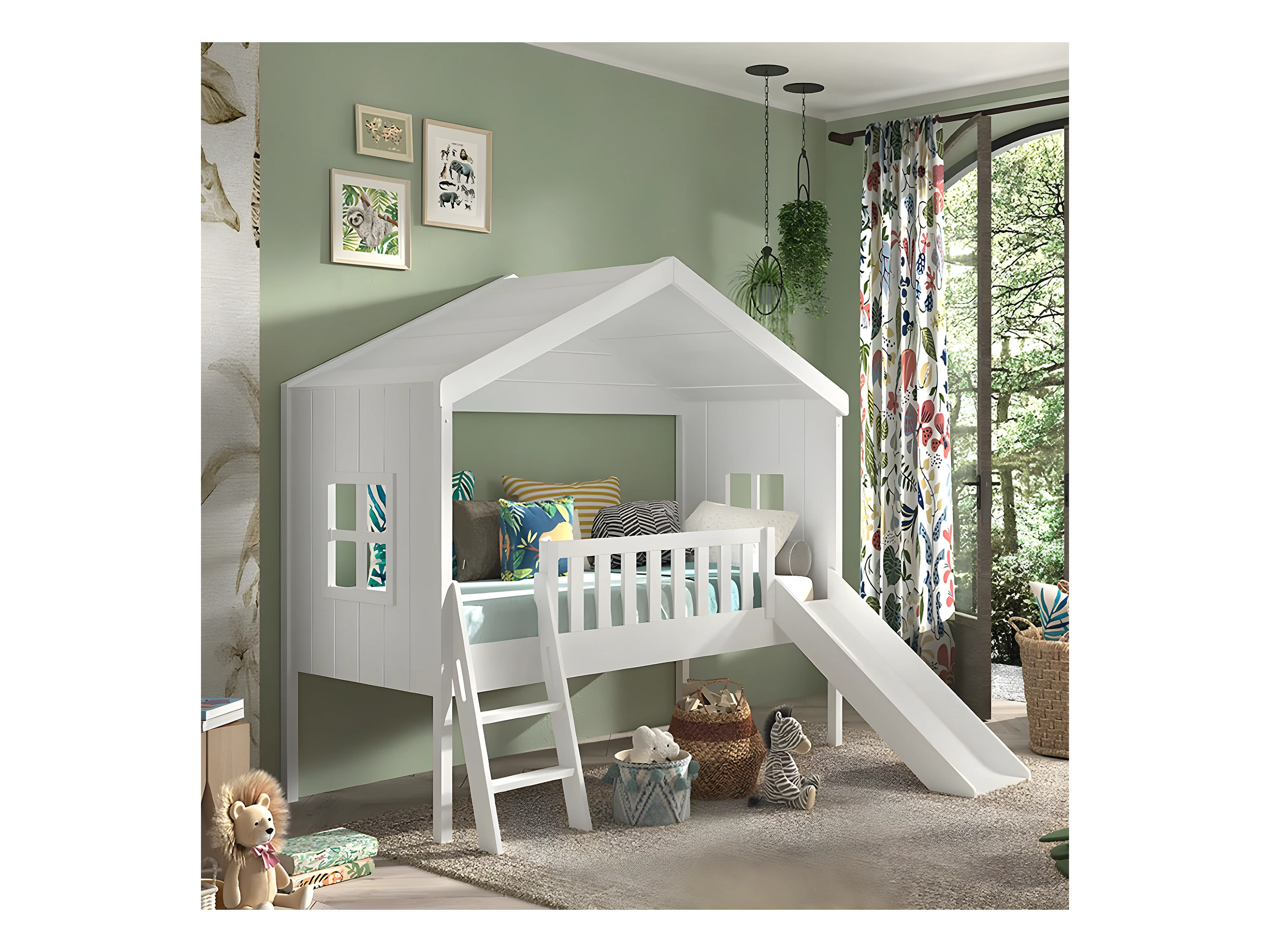 LAKA - Lit Maison Surélevé 90x200cm Blanc avec Toboggan
