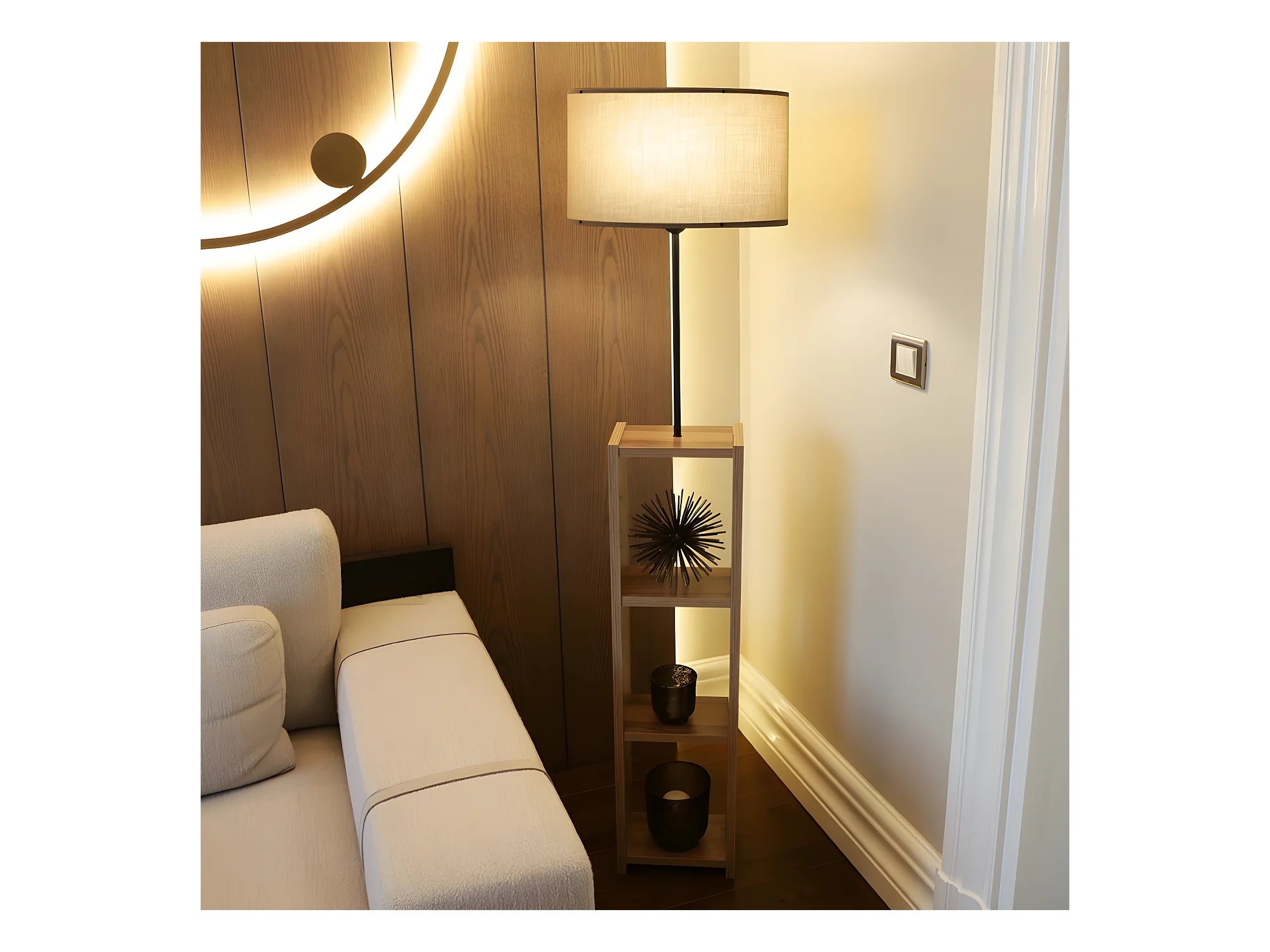 Lampadaire avec étagère en bois Diero et abat-jour en tissu 1xE27 - Vison