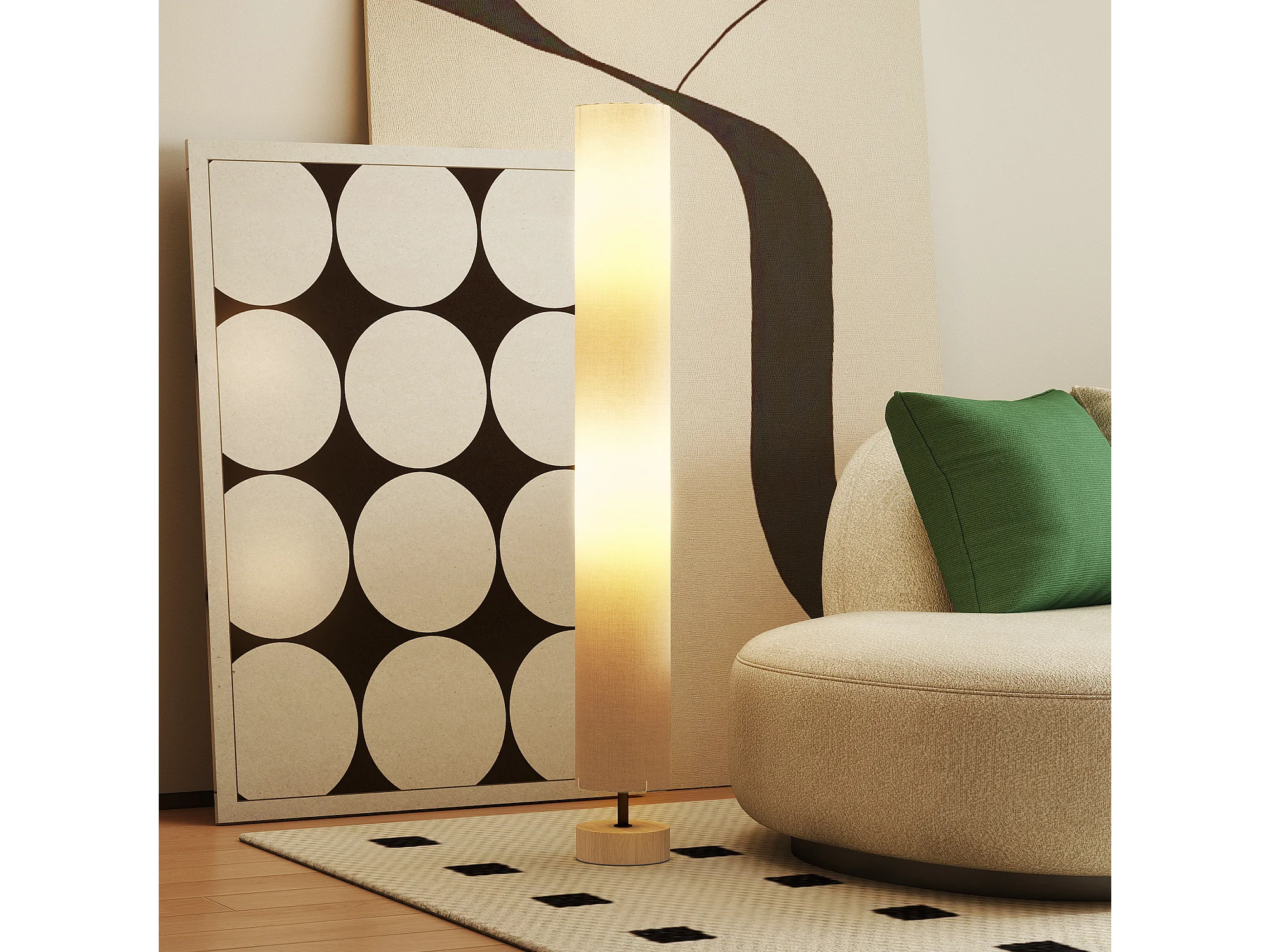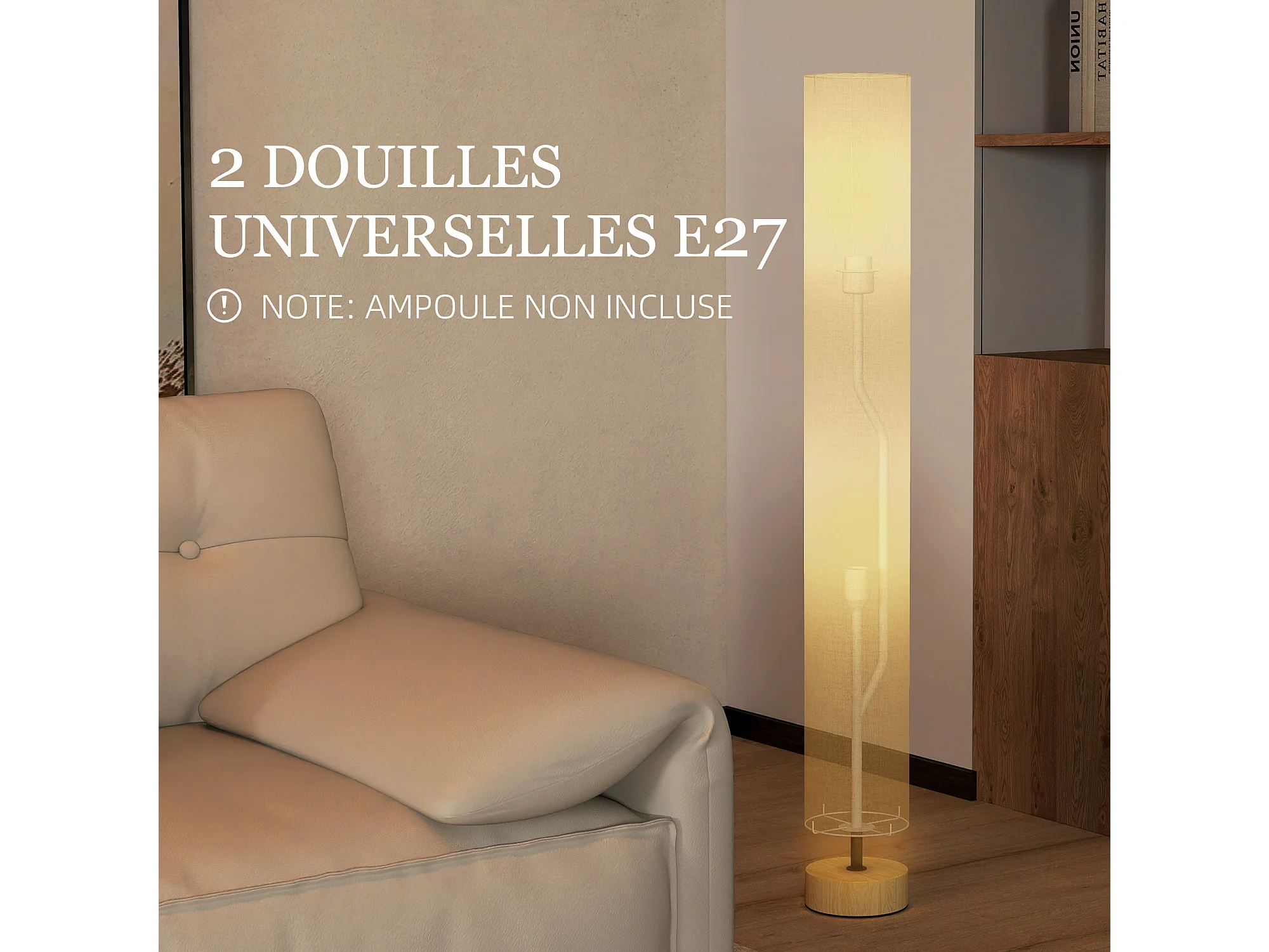 Lampadaire colonne sur pied bois contemporain H.120 cm abat-jour lin gris