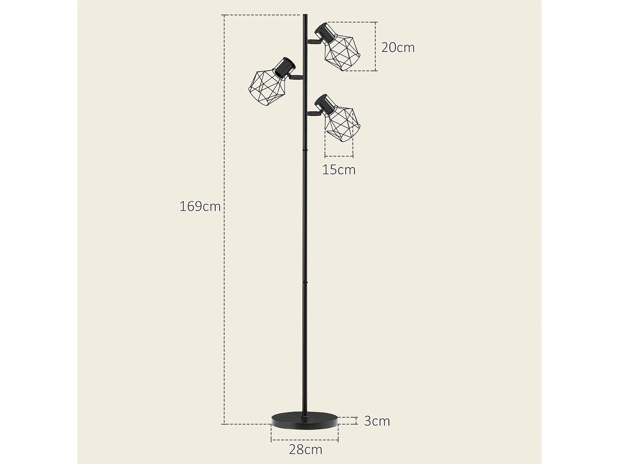 Lampadaire design industriel 3 ampoules max. 40W H.169 cm abat-jour cage métal noir