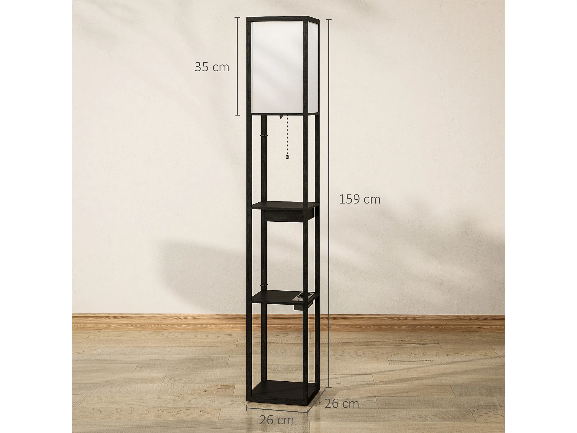 Lampadaire étagères 3 niveaux - interrupteur à tirette - métal MDF noir abat jour tissu blanc