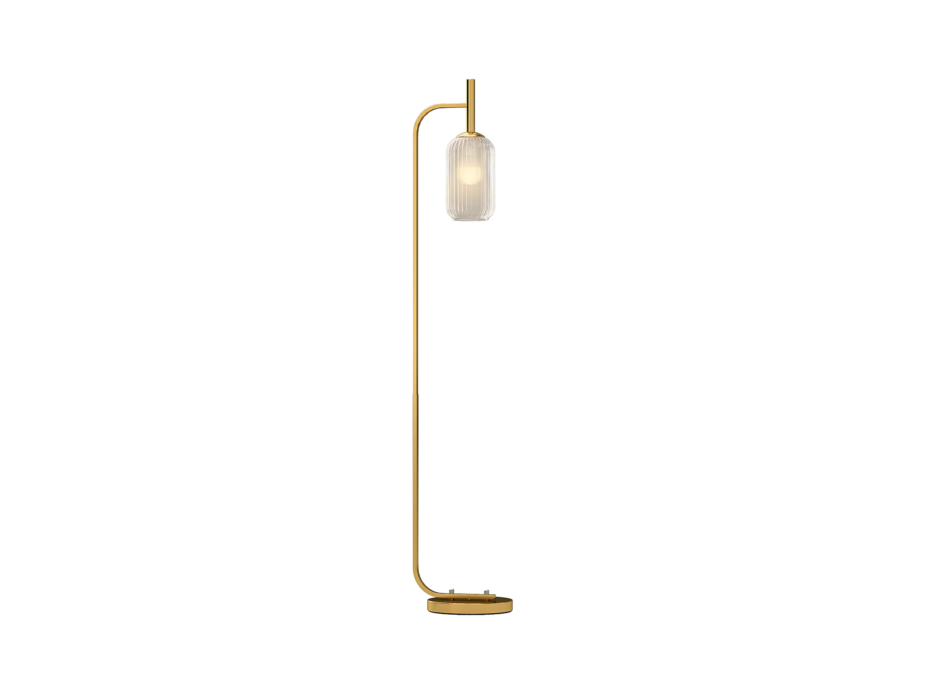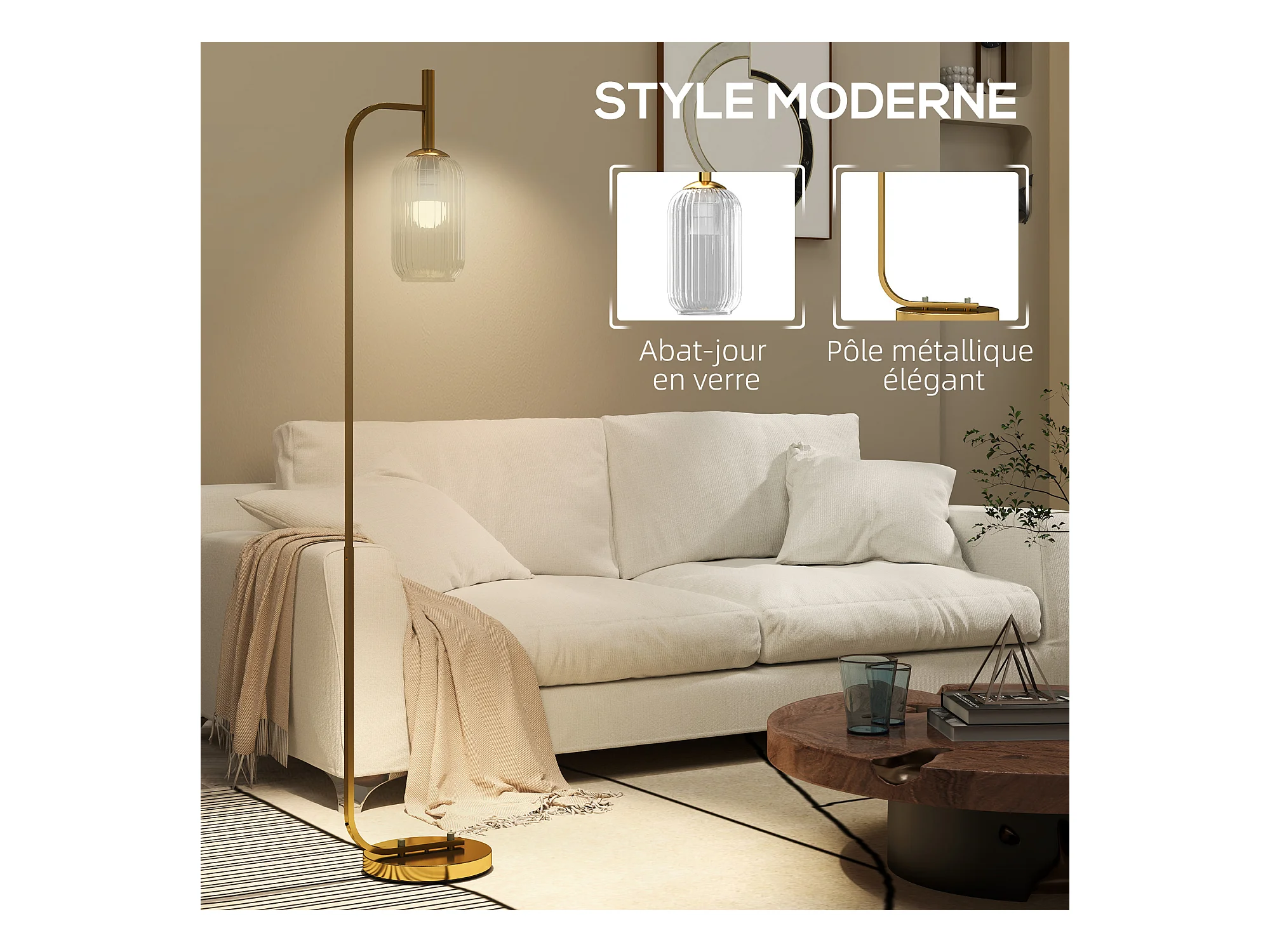 Lampadaire sur pied style rétro H.153 cm piètement mât métal doré abat-jour verre texturé