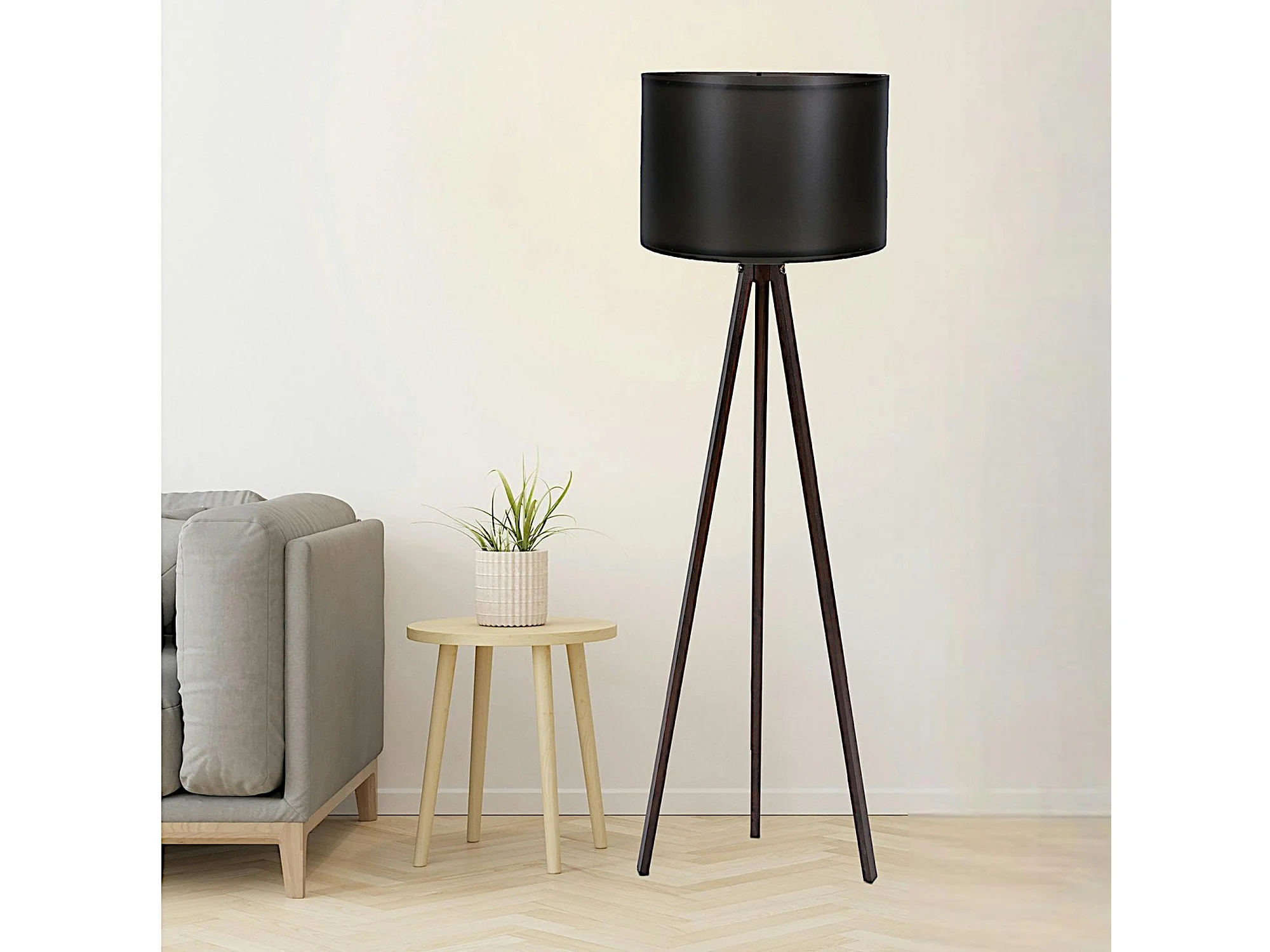 Lampadaire trépied effet noyer et abat-jour noir KILIS