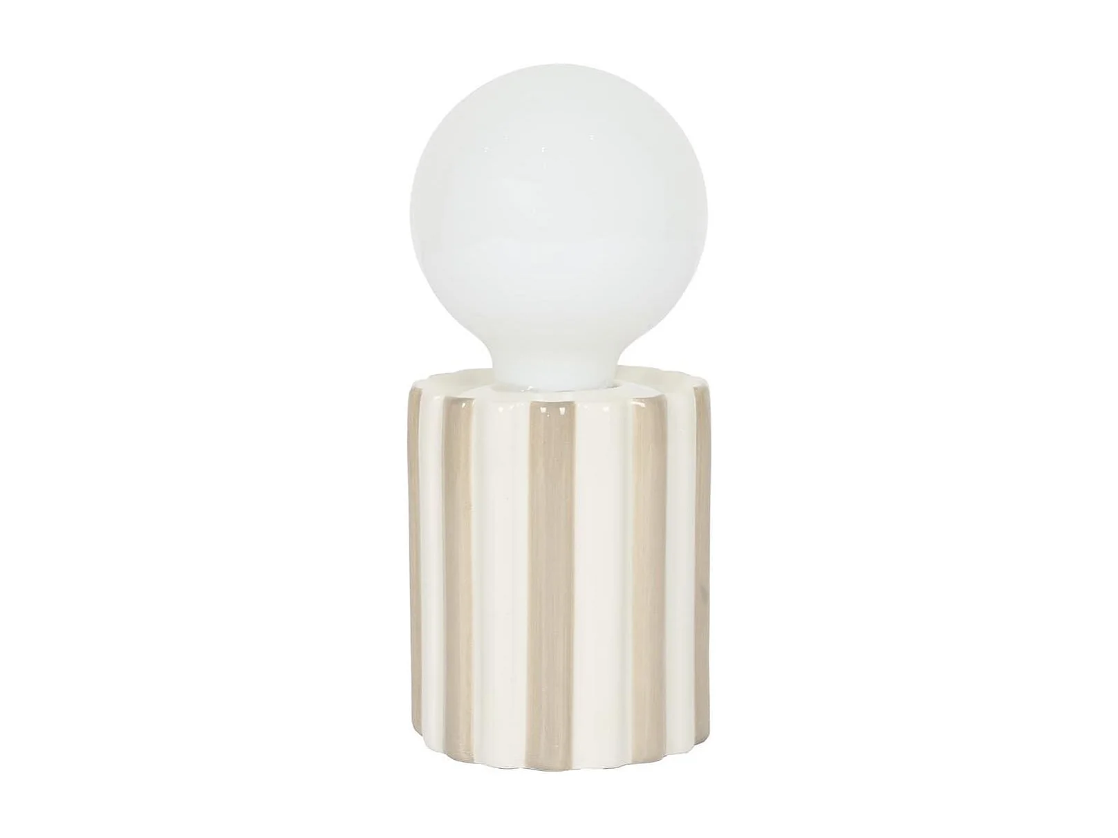 Lampe à poser céramique rayé taupe et blanc abat-jour globe (H17cm) sur piles