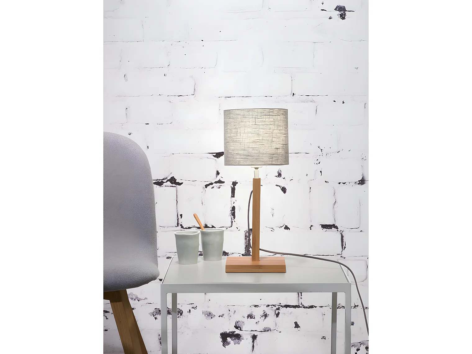 Lampe de table tige en bambou marron et abat-jour crème