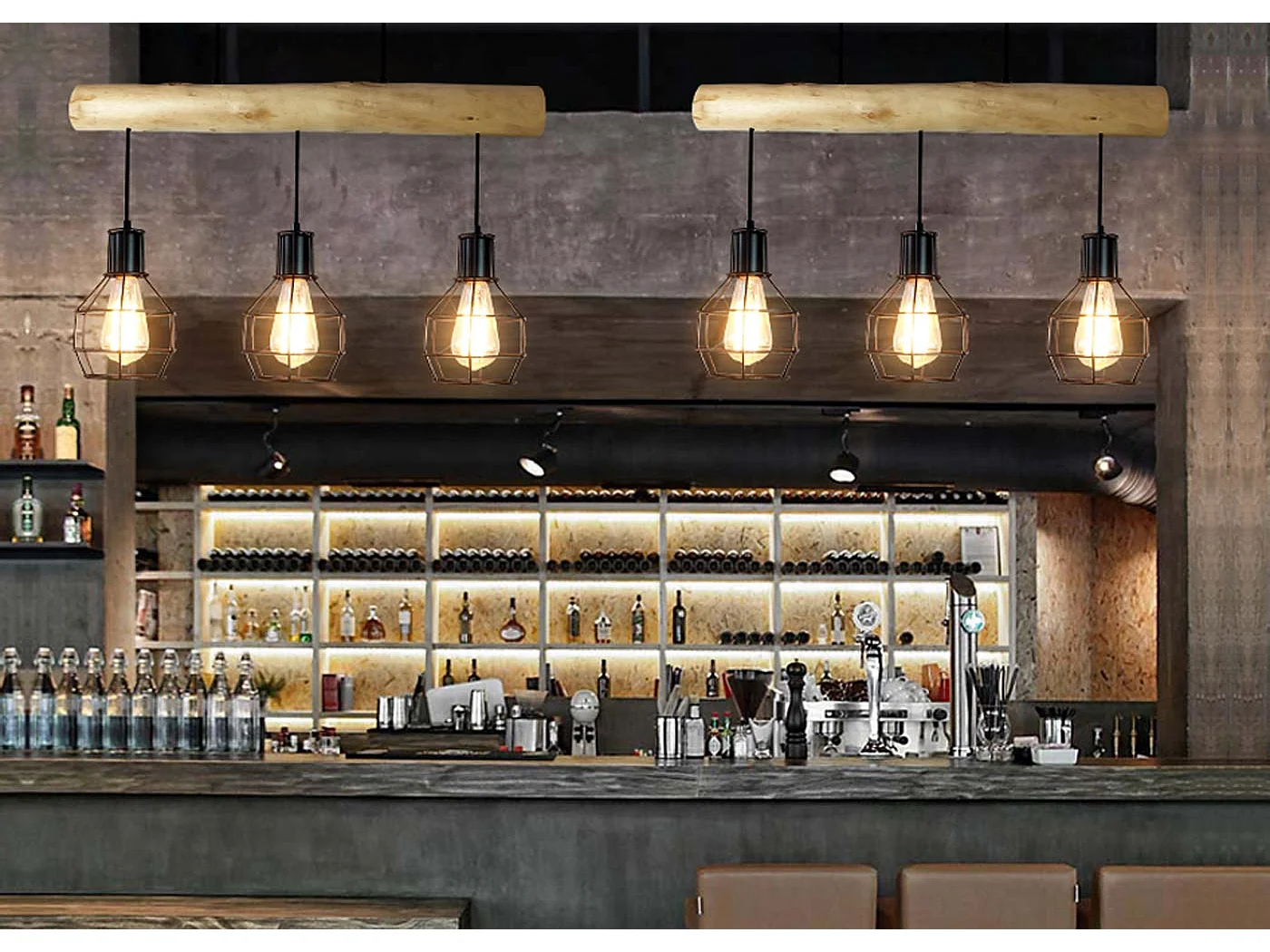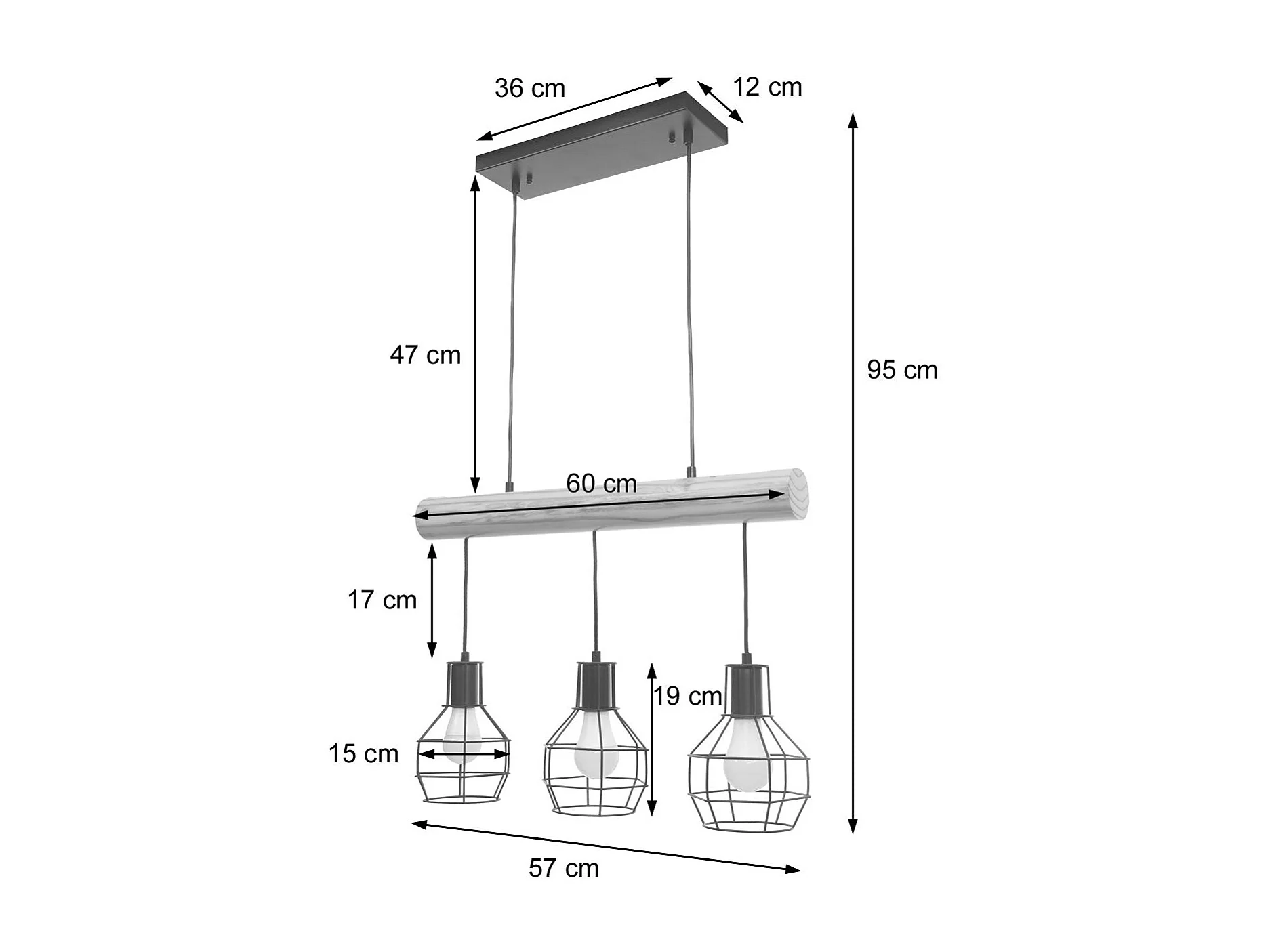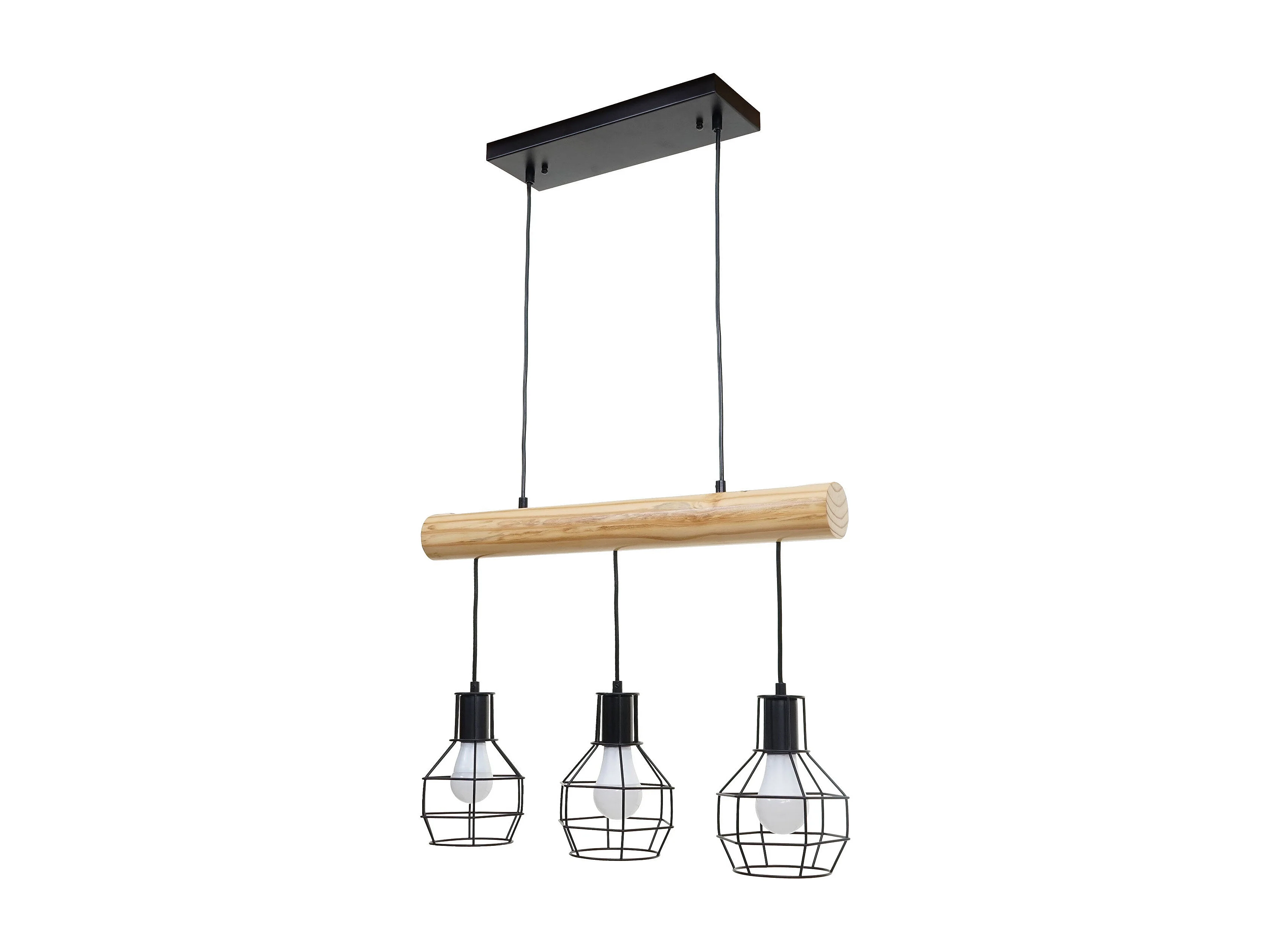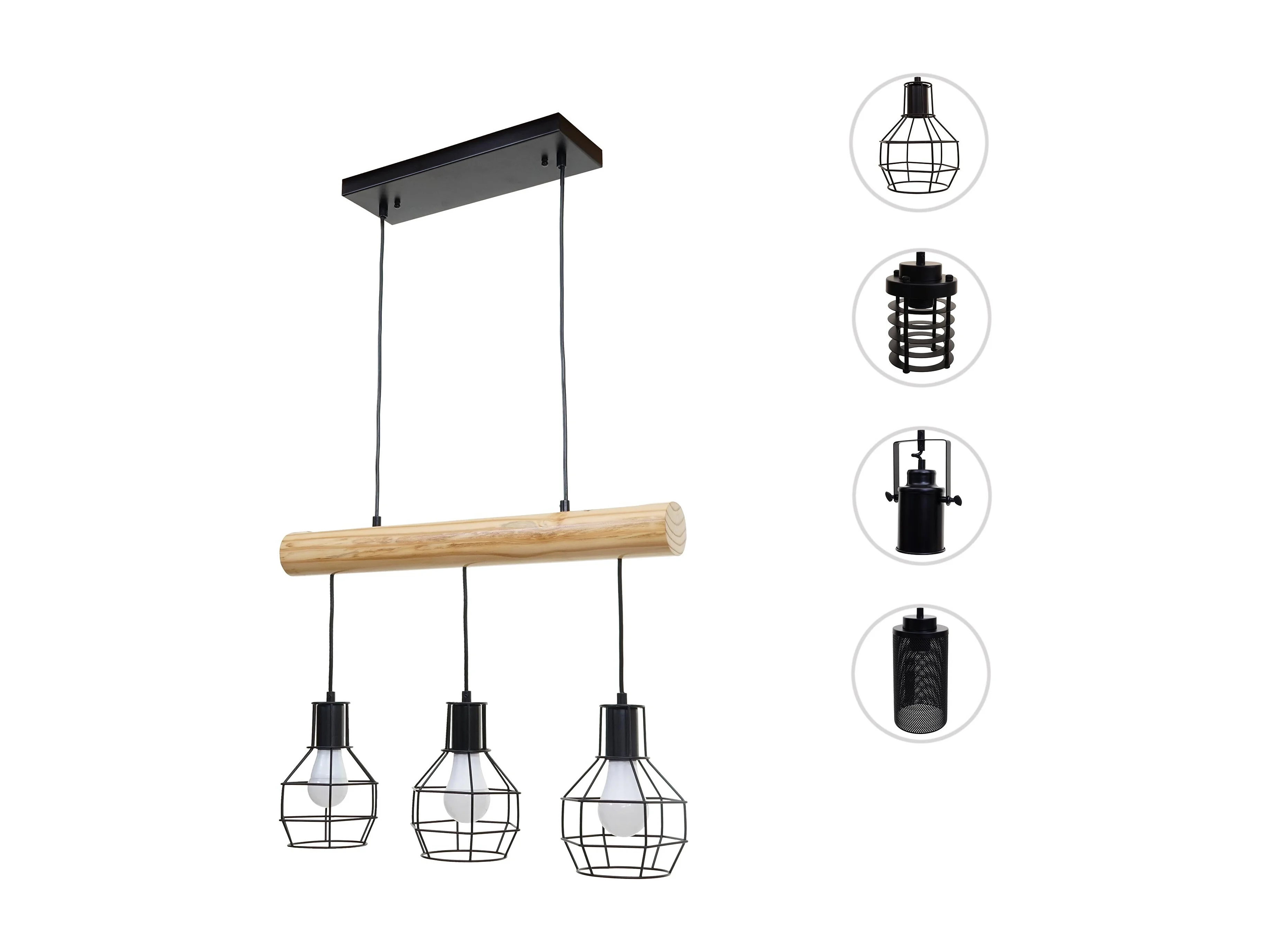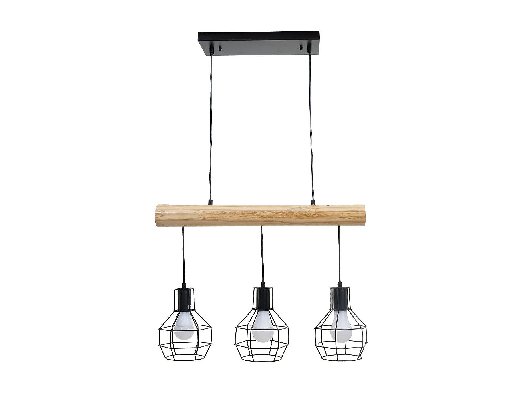 Lampe suspension lustre style industriel vintage bois massif métal noir 3 abat-jour en treillis 04_0003603