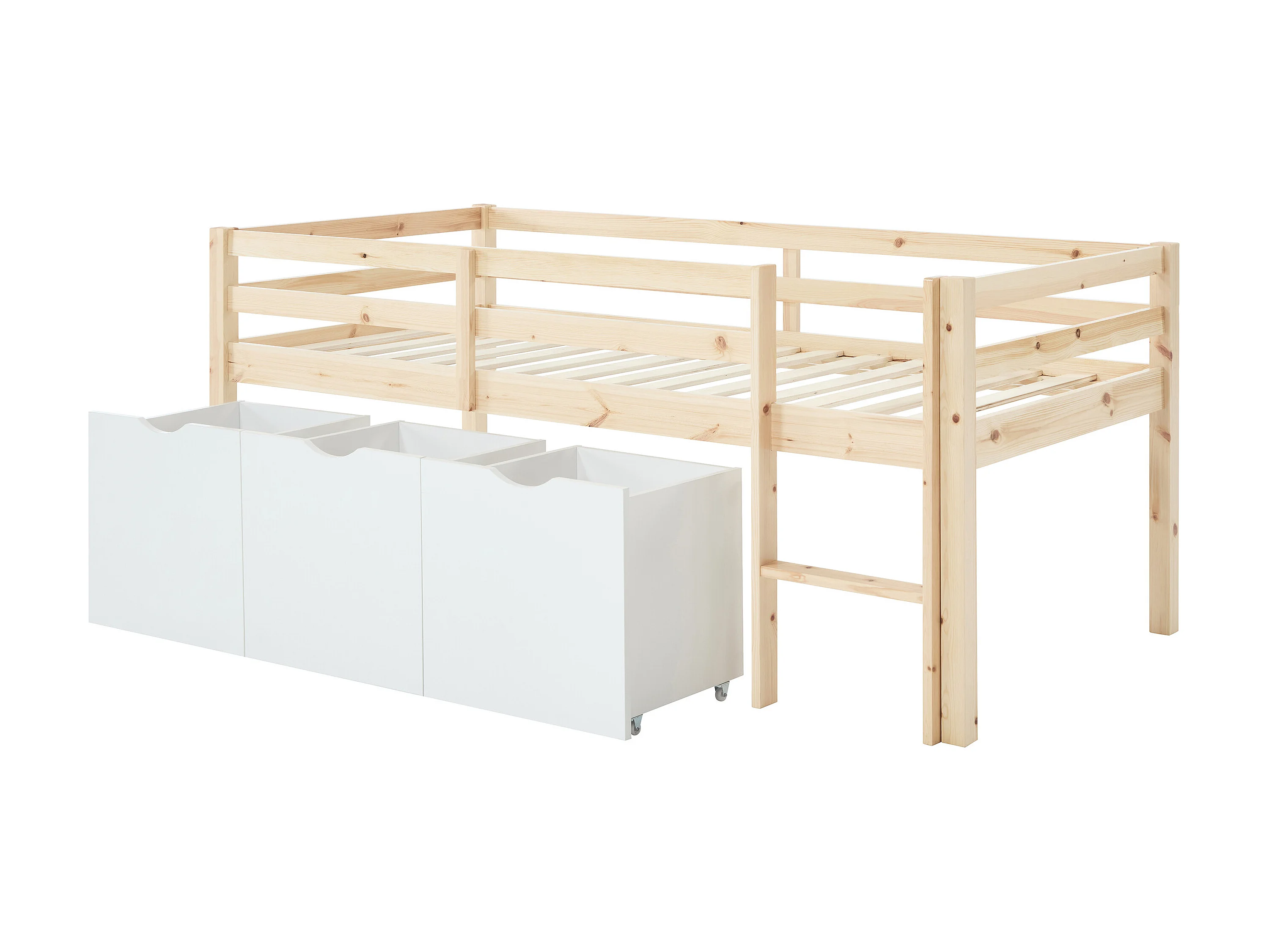 Lit mi-hauteur 90 x 190 cm avec rangement - Pin et MDF - Coloris : Naturel et blanc + Matelas - LANIORI