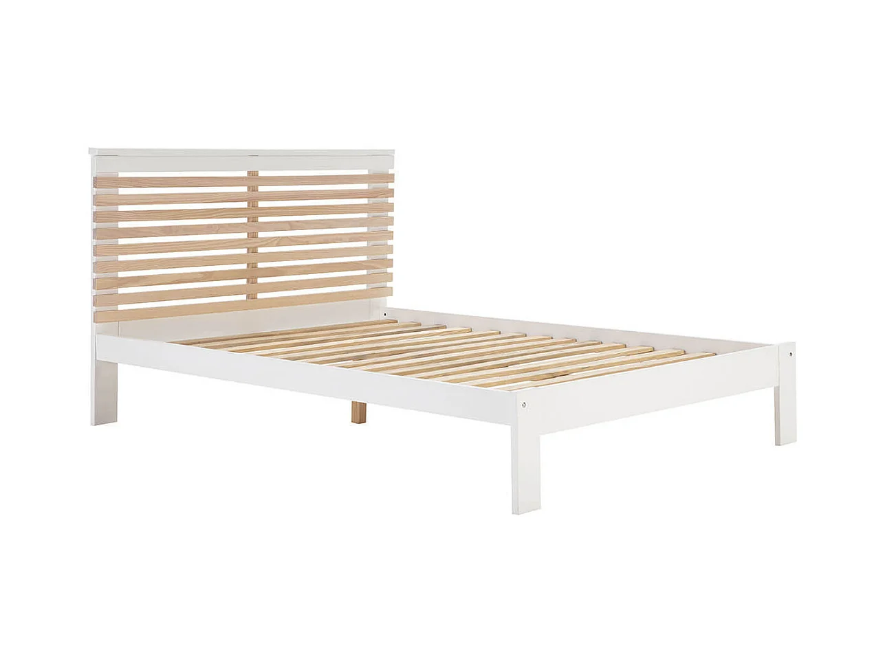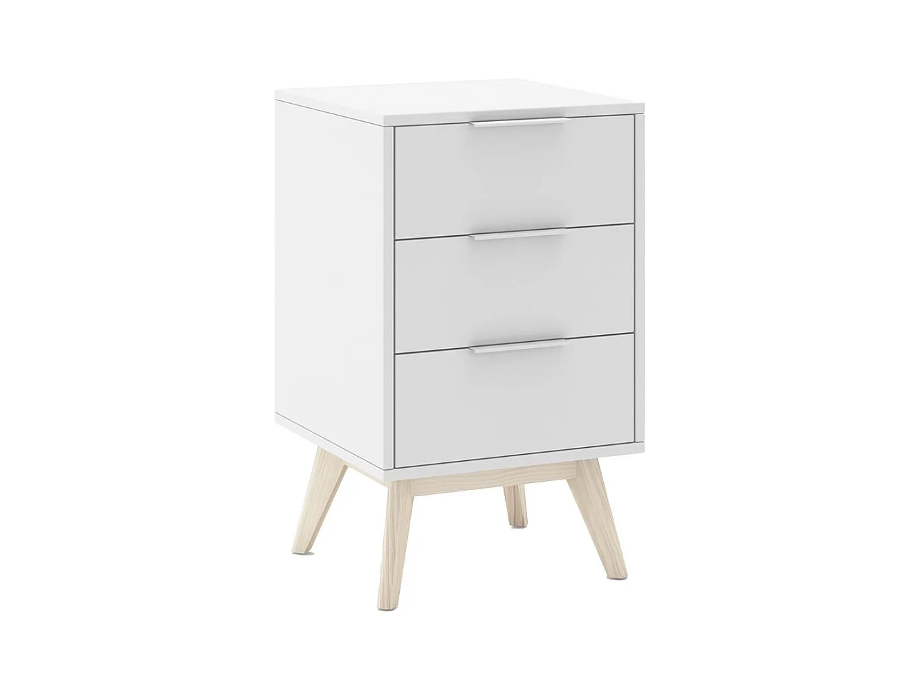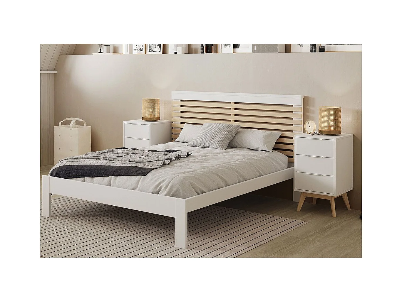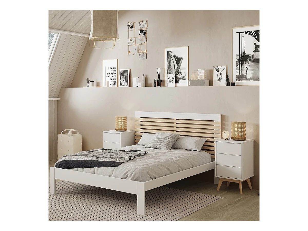 LAUPELL - Pack Lit 140x190cm + 2 Chevets 3 Tiroirs Pin Naturel et Blanc Scandinave