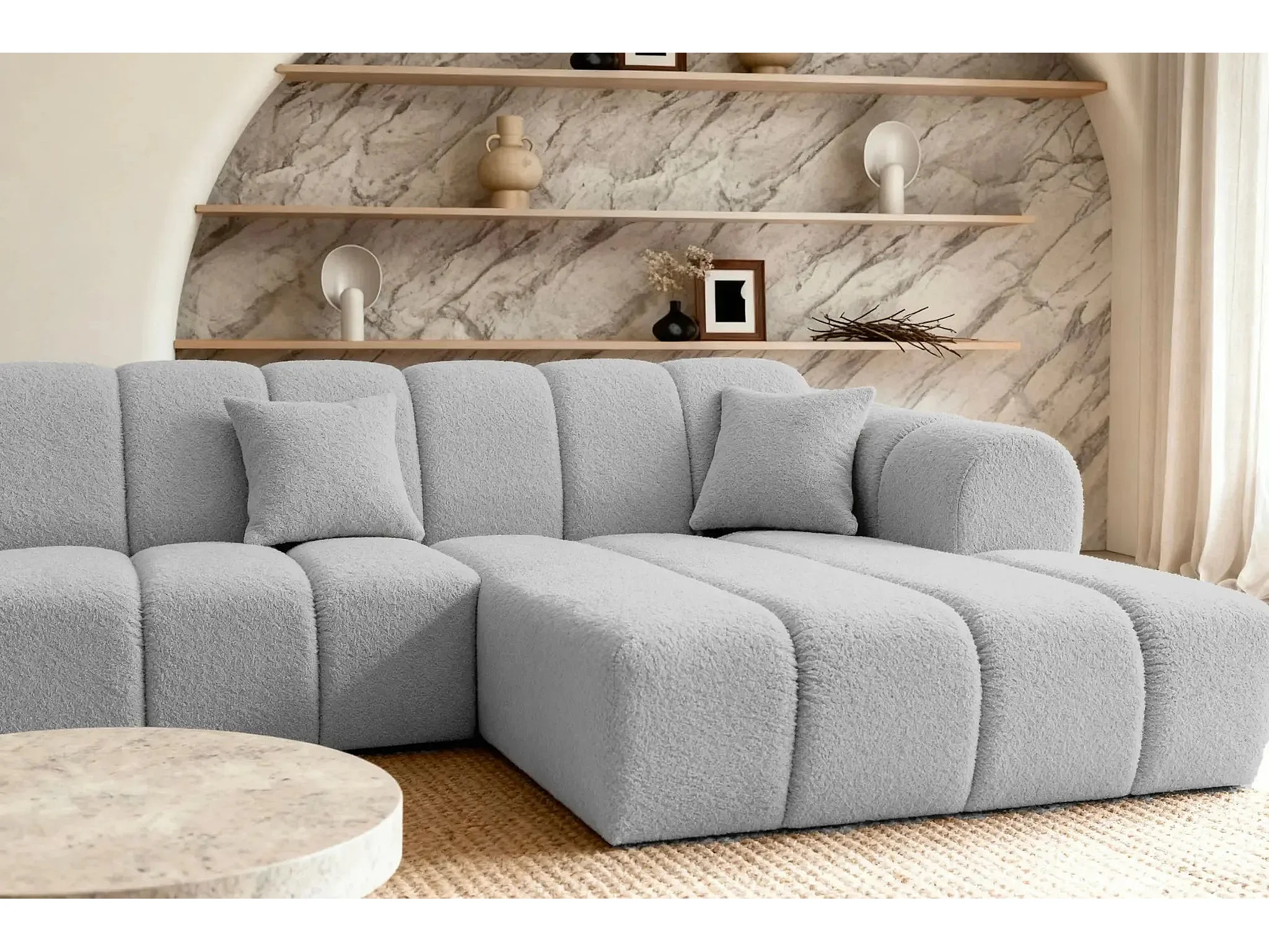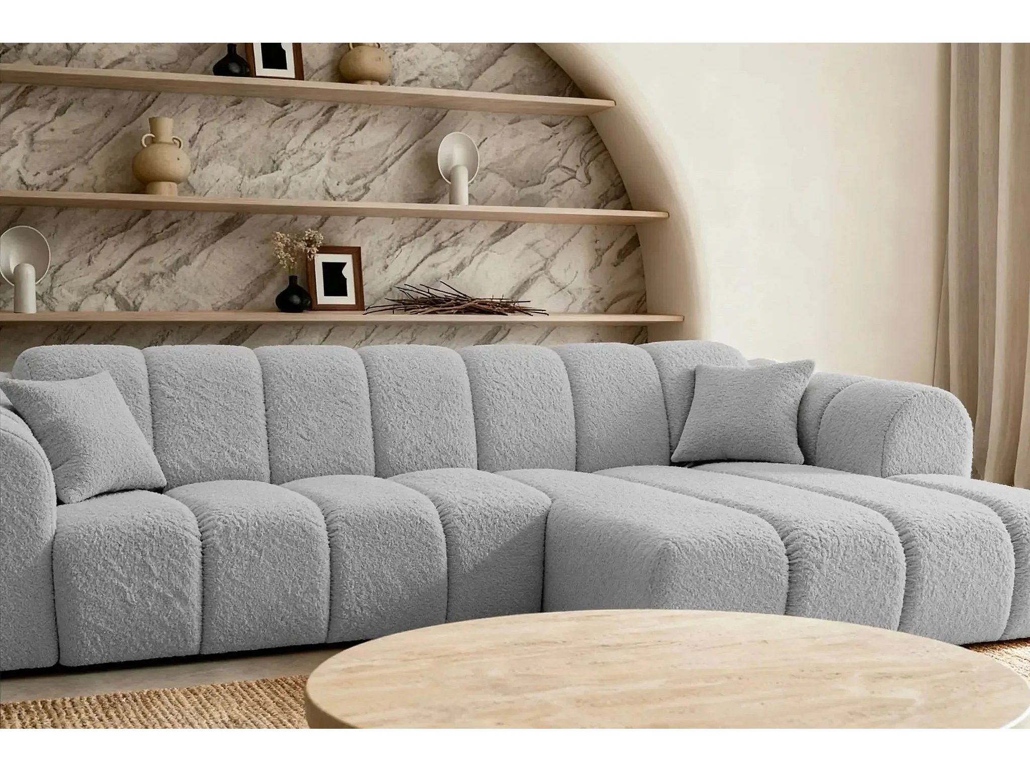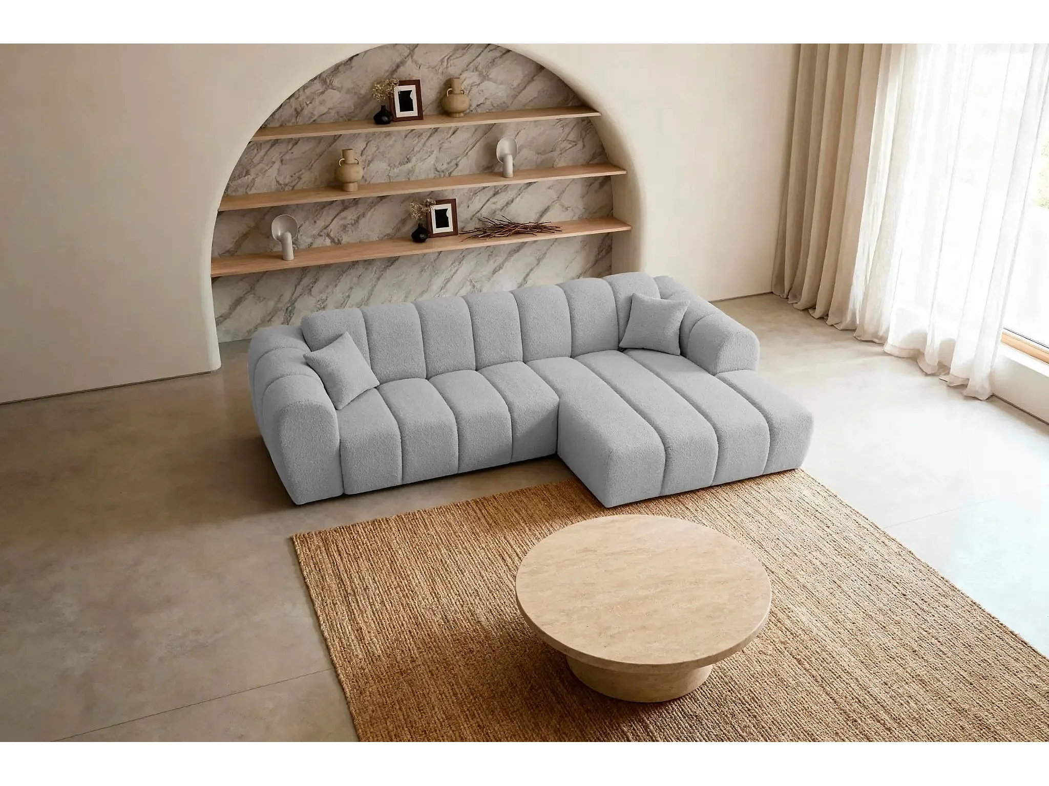 LAURA - Canapé d'angle tissu bouclette 4 places - Gris clair - Gauche
