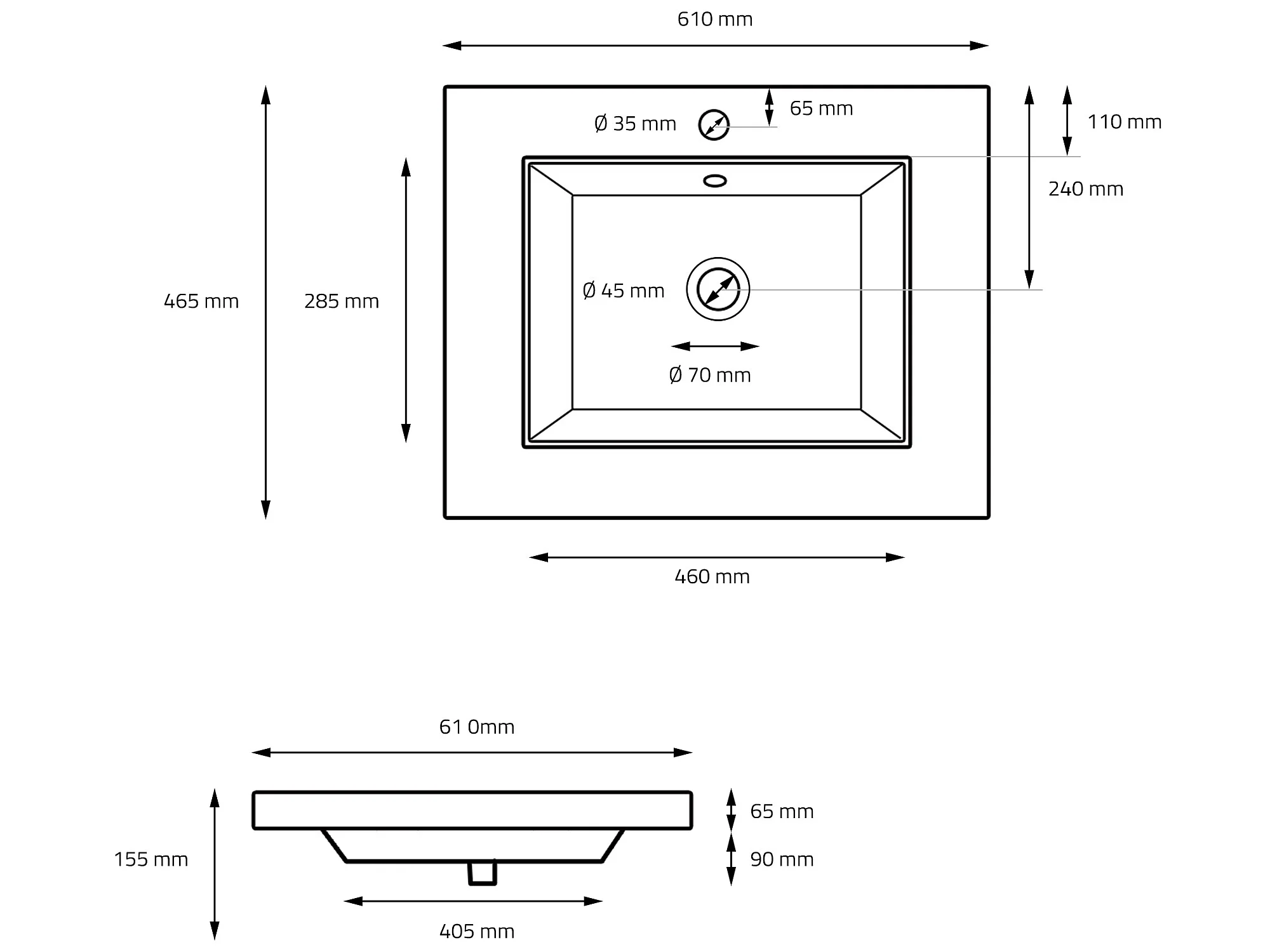 Lavabo en céramique noir mat vasque encastre pour salle de bain 610x465x155 mm