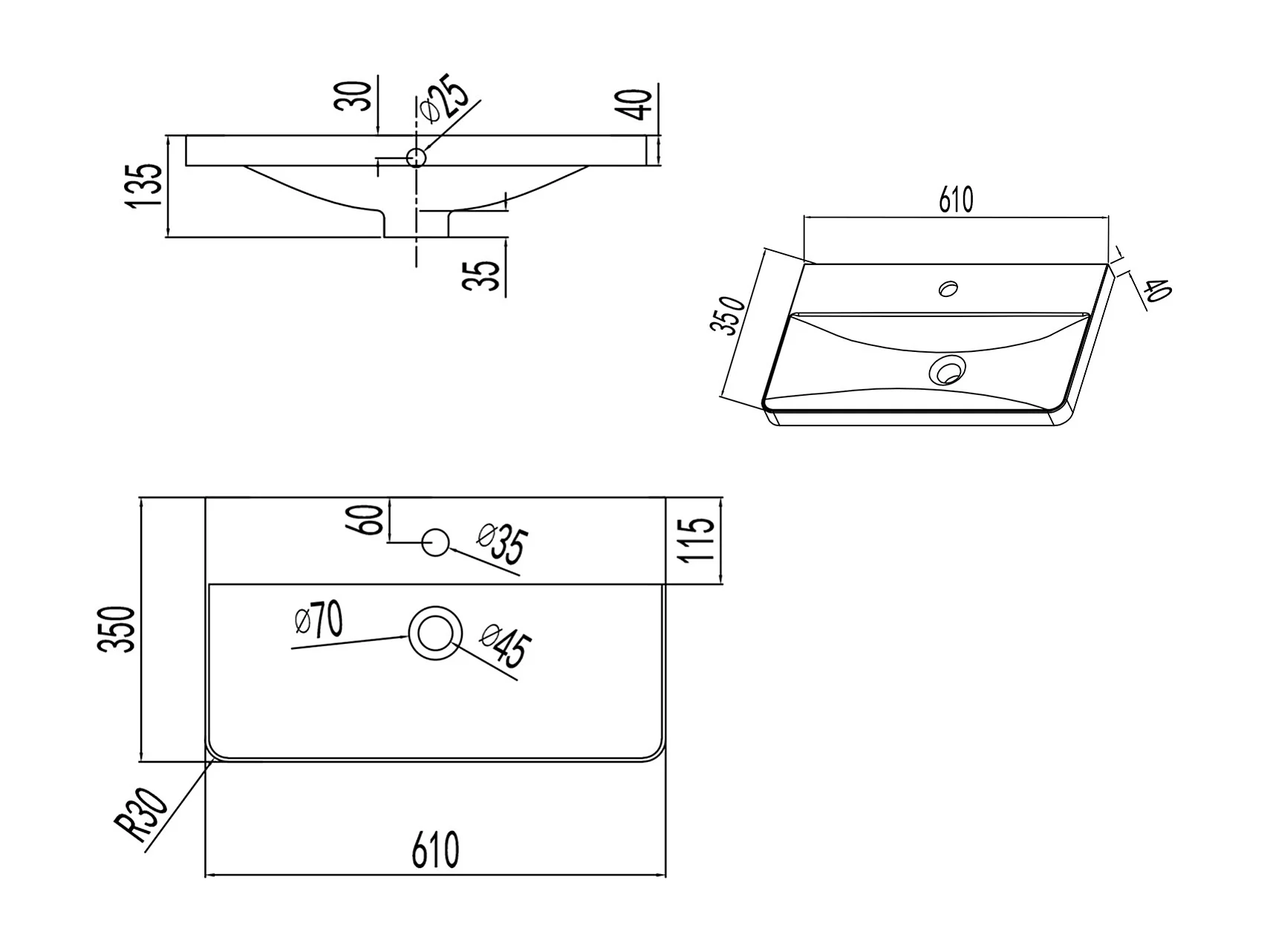 Lavabo encastré en résine effet pierre sans robinet, Dimensions : 61 cm (L) x 13.5 cm (H) x 35 cm (P), Blanc