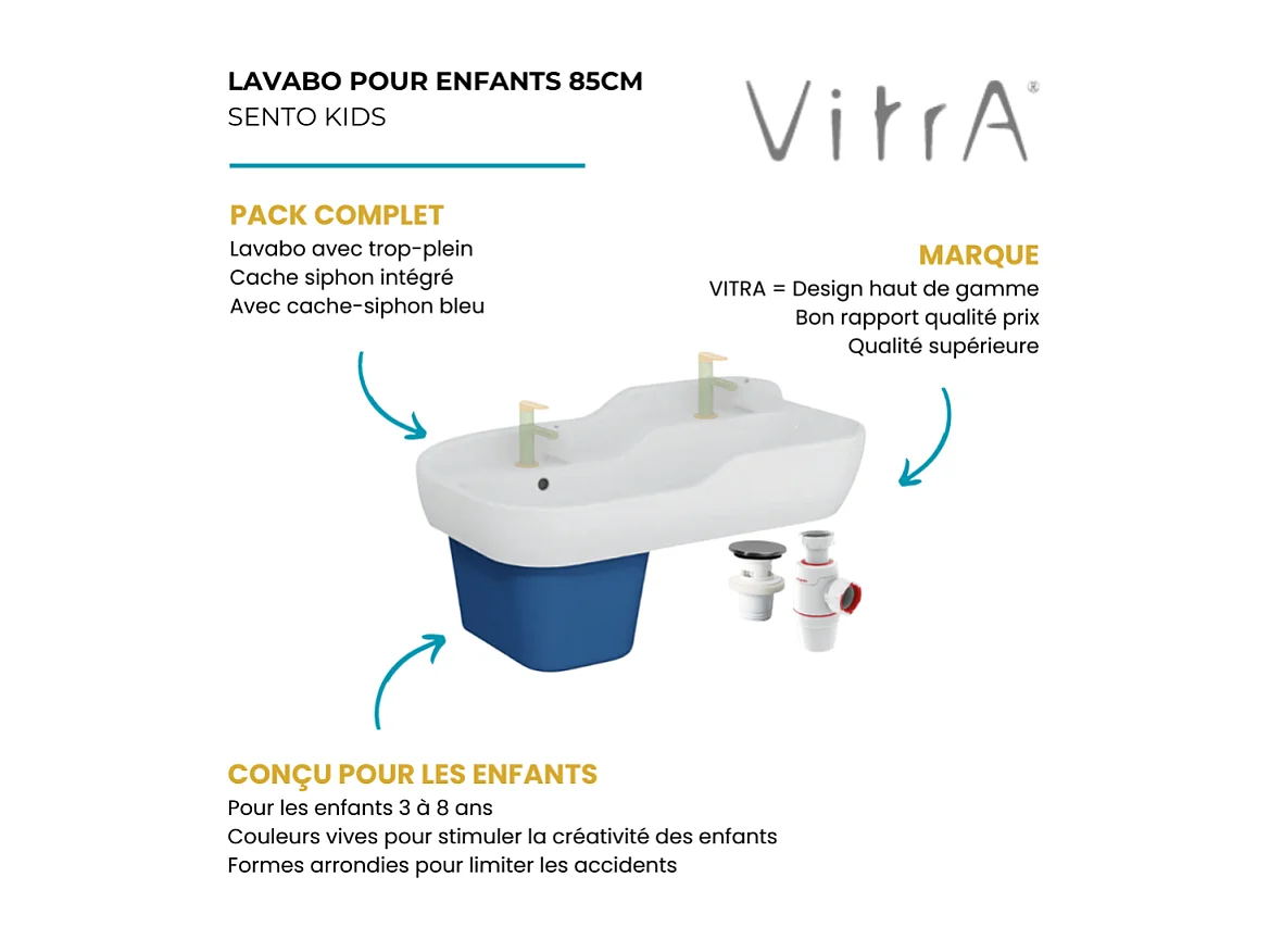 Lavabo pour enfant VITRA Sento Kids 85 cm + cache siphon bleu + siphon et bonde WIRQUIN