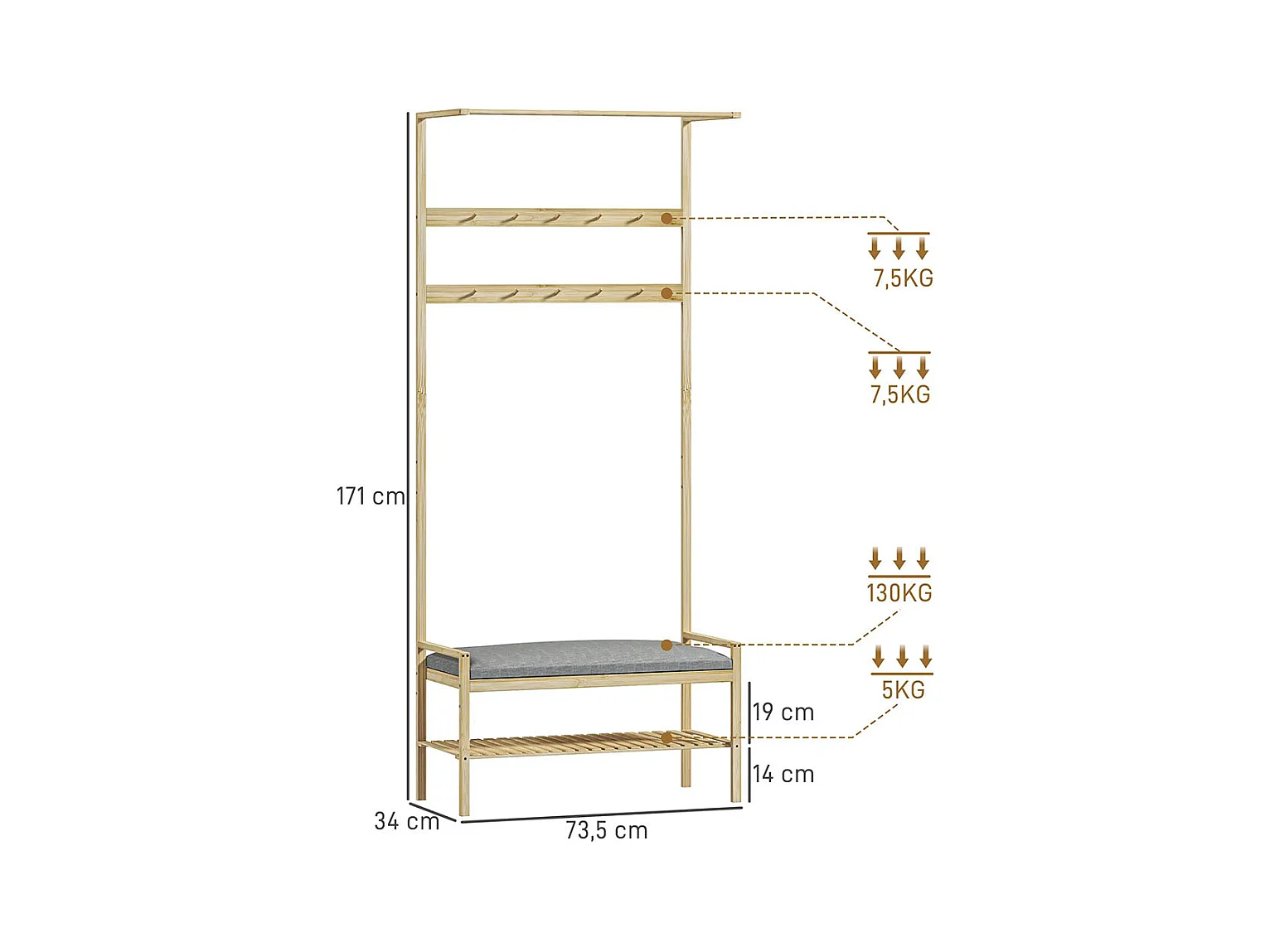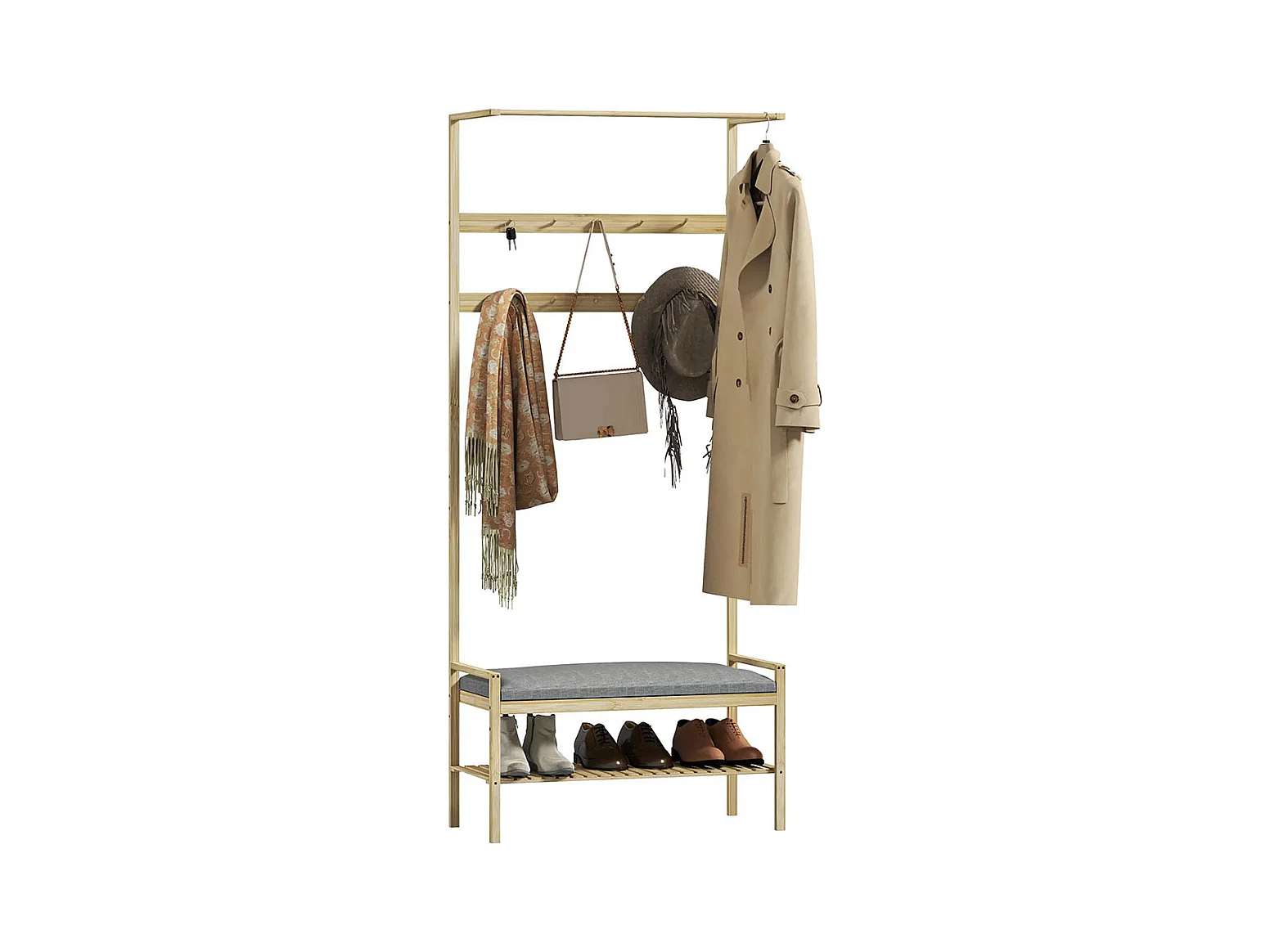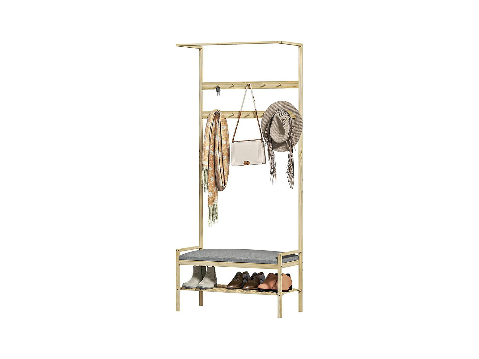 Le vestiaire comprend un banc à chaussures, une tringle à vêtements, des crochets à vêtements et un étagère à chaussures.