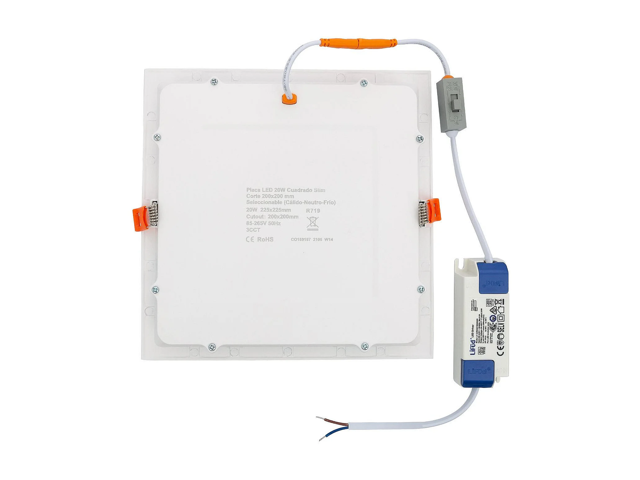 Dalle LED 20W Carrée CCT Sélectionnable Microprismatique Coupe 200x200 mm No Flicker Sélectionnable (chaud-neutre-froid) 2700K - 4000K - 5000K